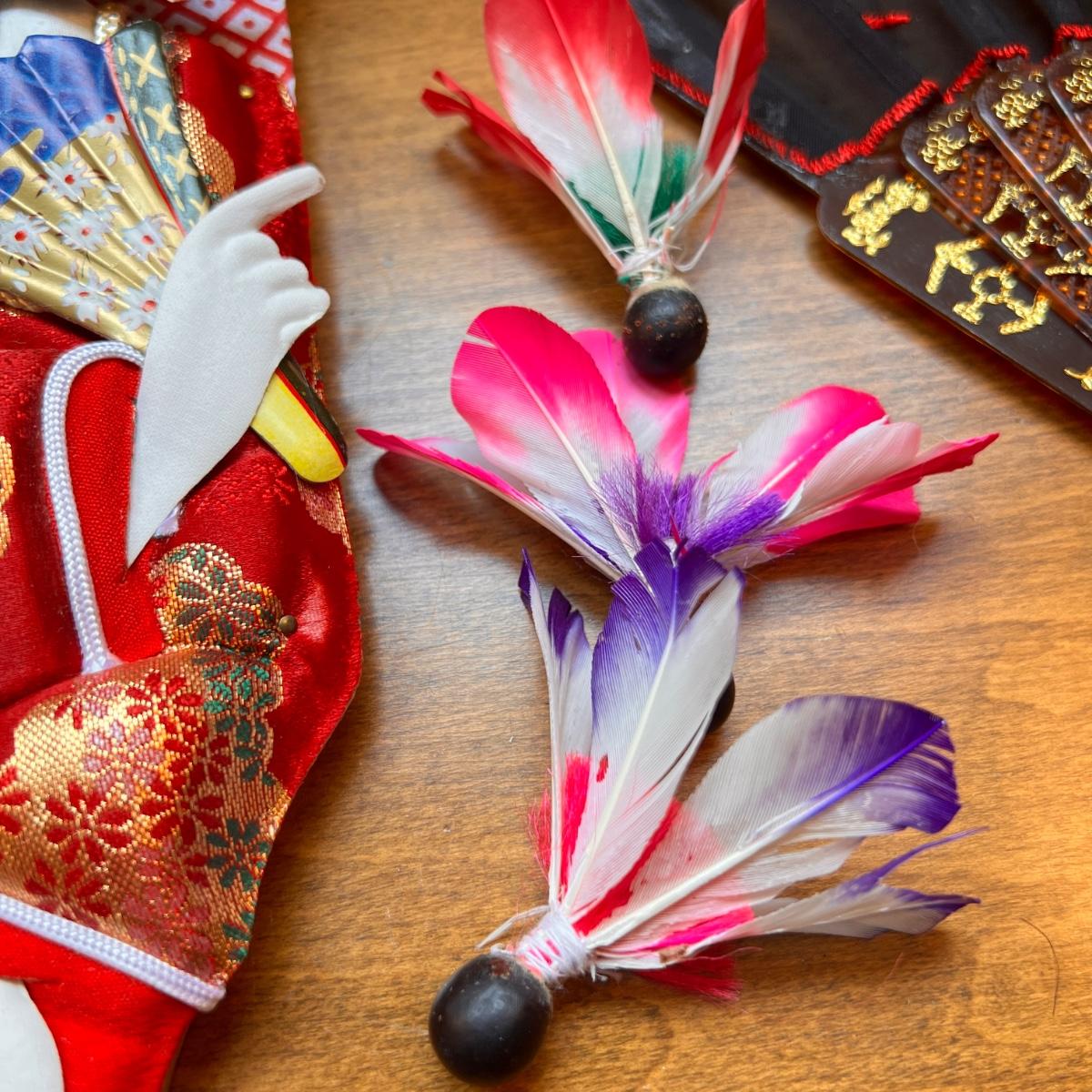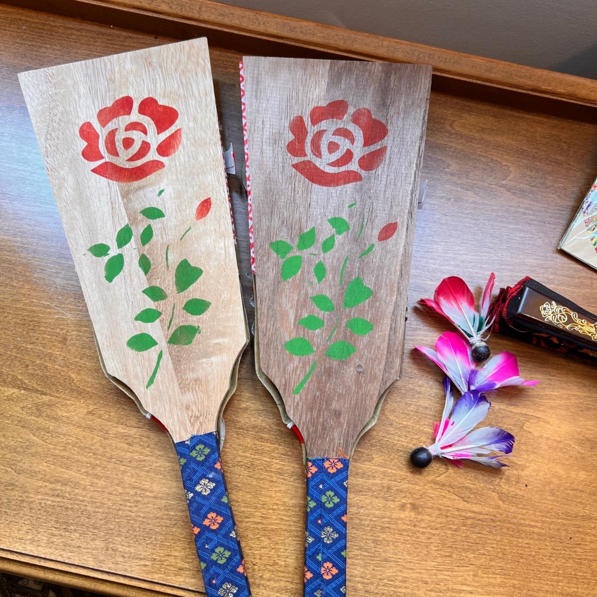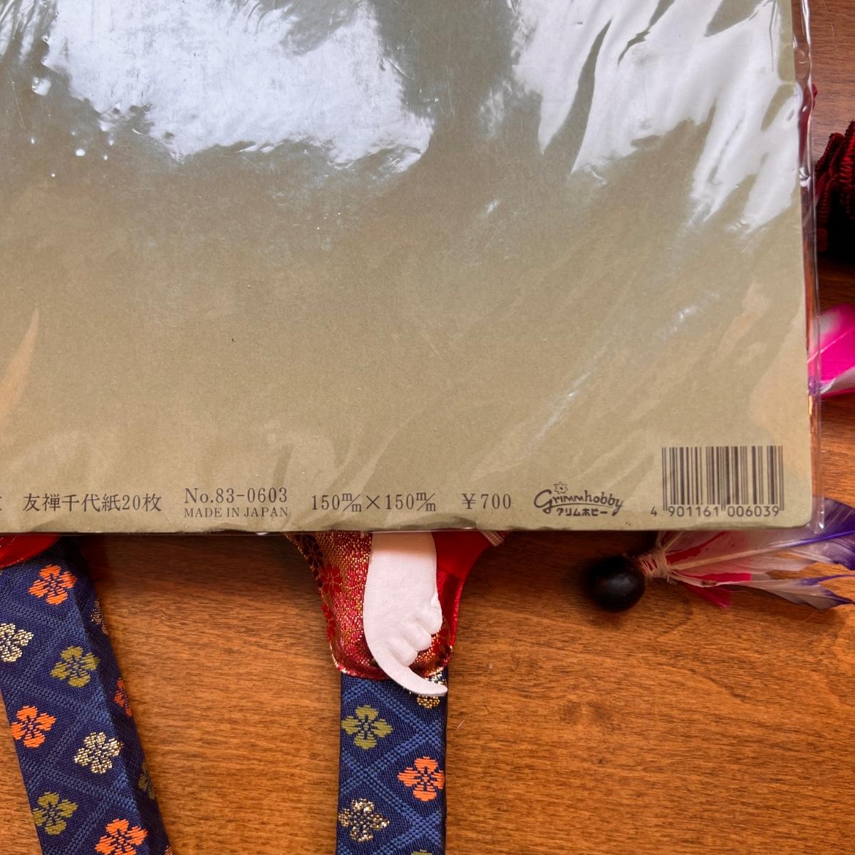 Hagoita are wooden paddles used to hit shuttlecocks and are used to play the traditional Japanese pastime called hanetsuki during the New Year. This is a full set including the 2 paddles and 3 shutlecocks still in box in excellent condition. Unopened package of japanese origami paper. An ornate cloth and plastic folding hand fan.