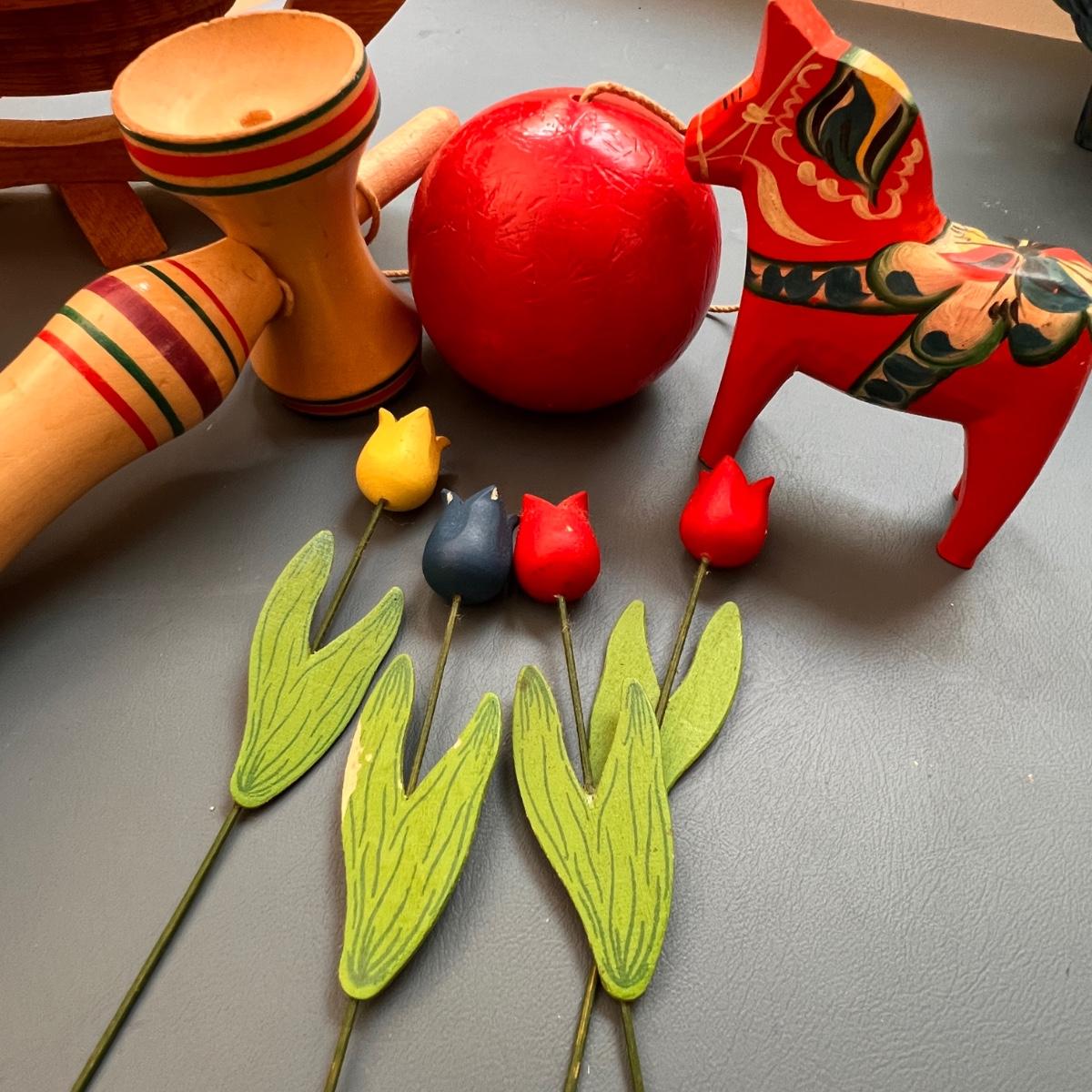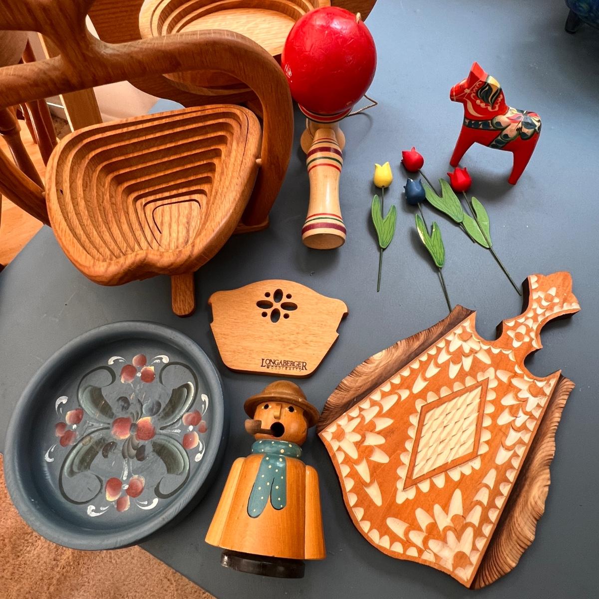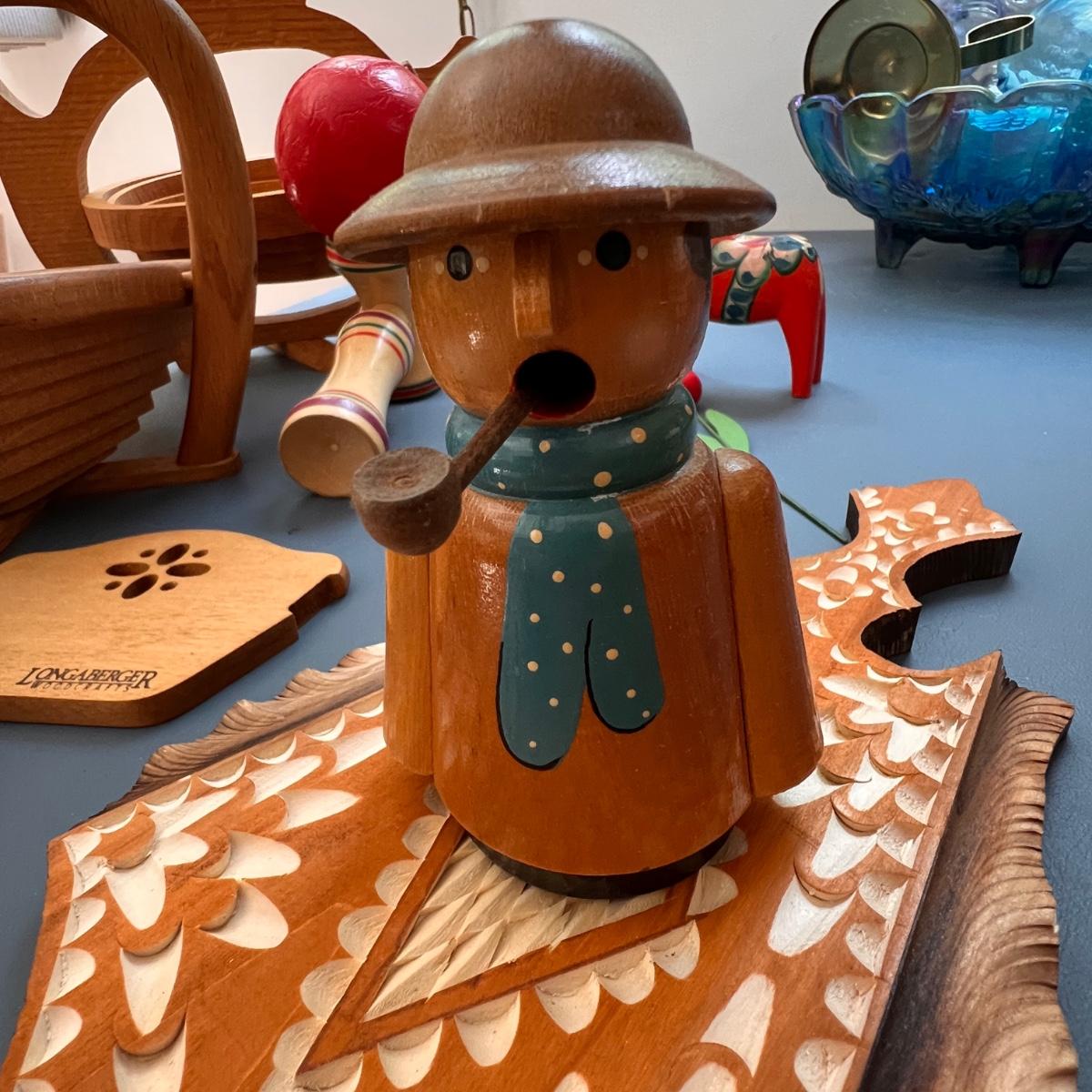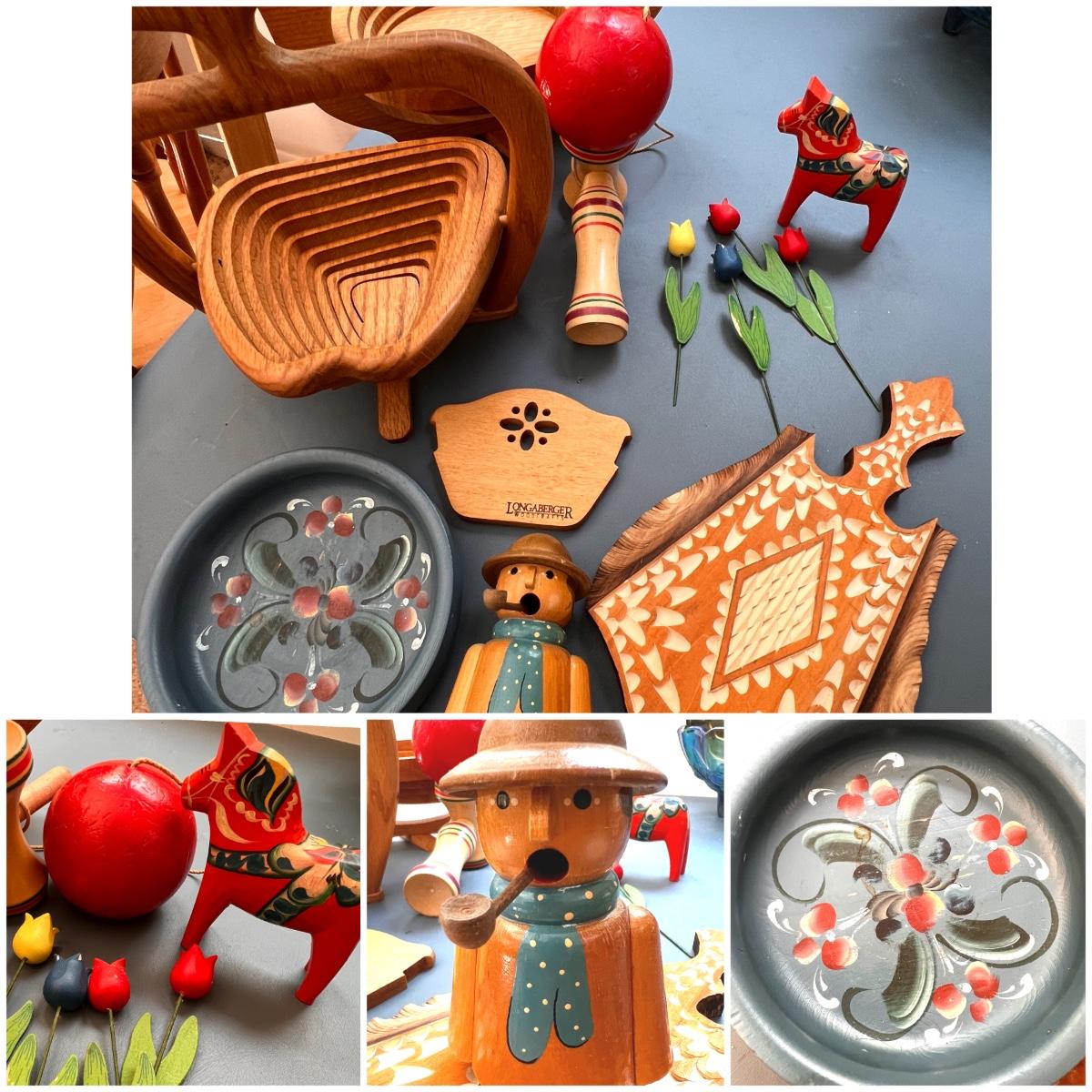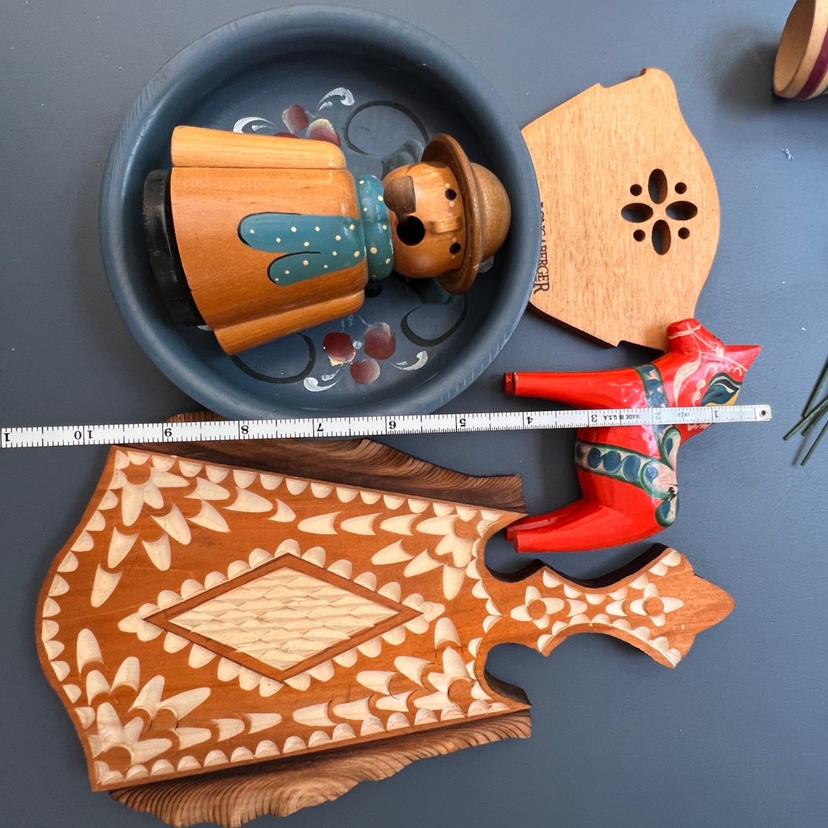 German folk art smoking man figurines, Longaberger breadbasket small trivet, Norwegian folk art painted plate, Swedish Dala horse, wooden flowers, Pear Tree folding basket tea pot, apple folding basket, plus more.