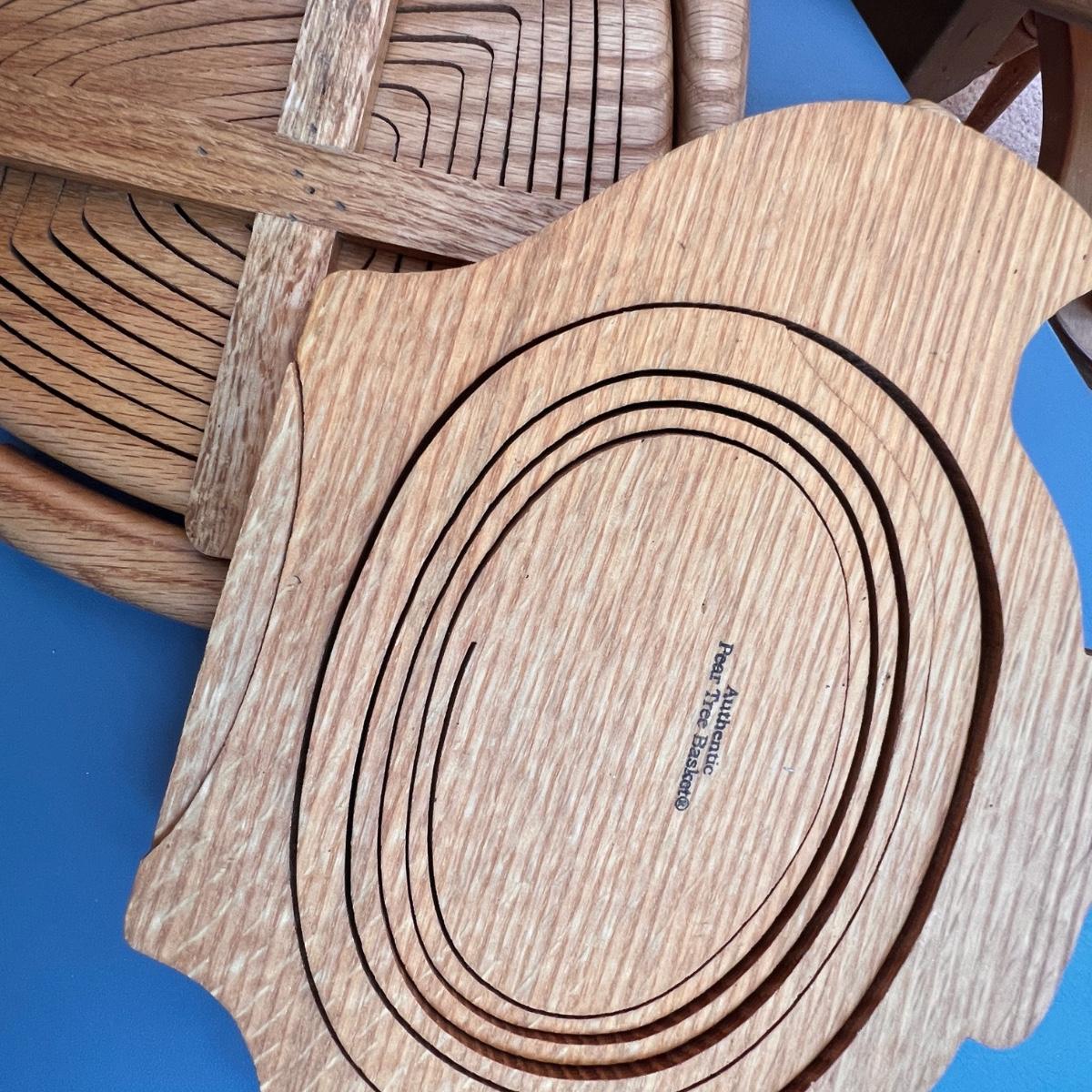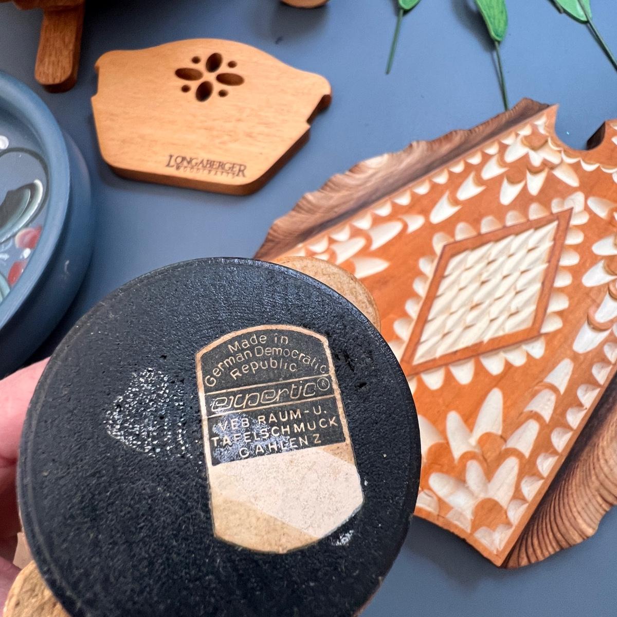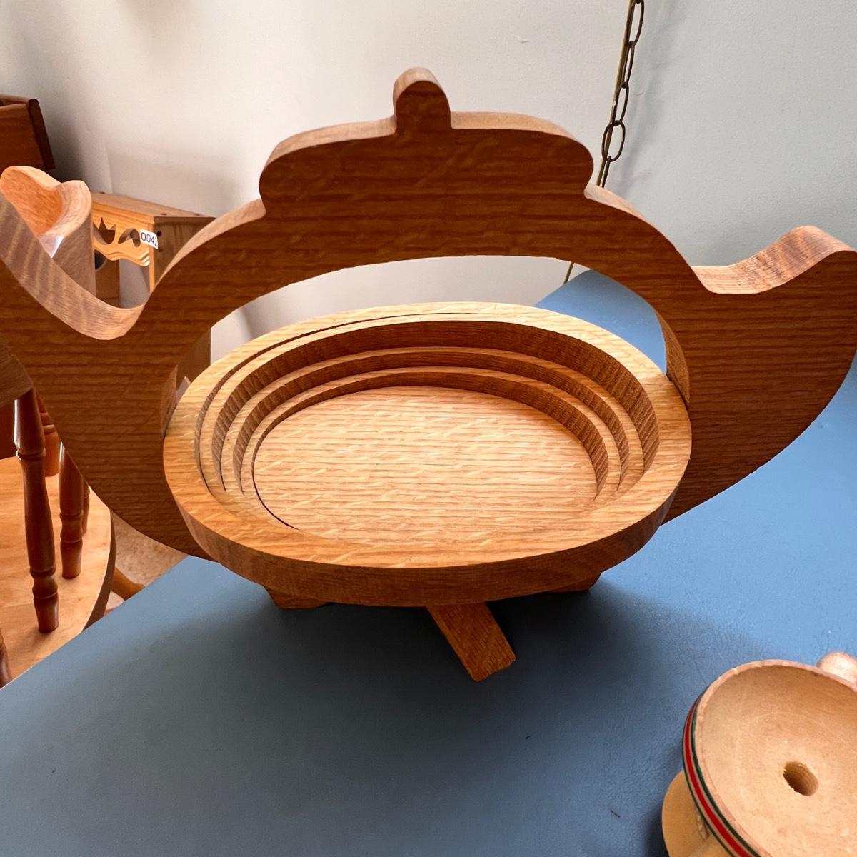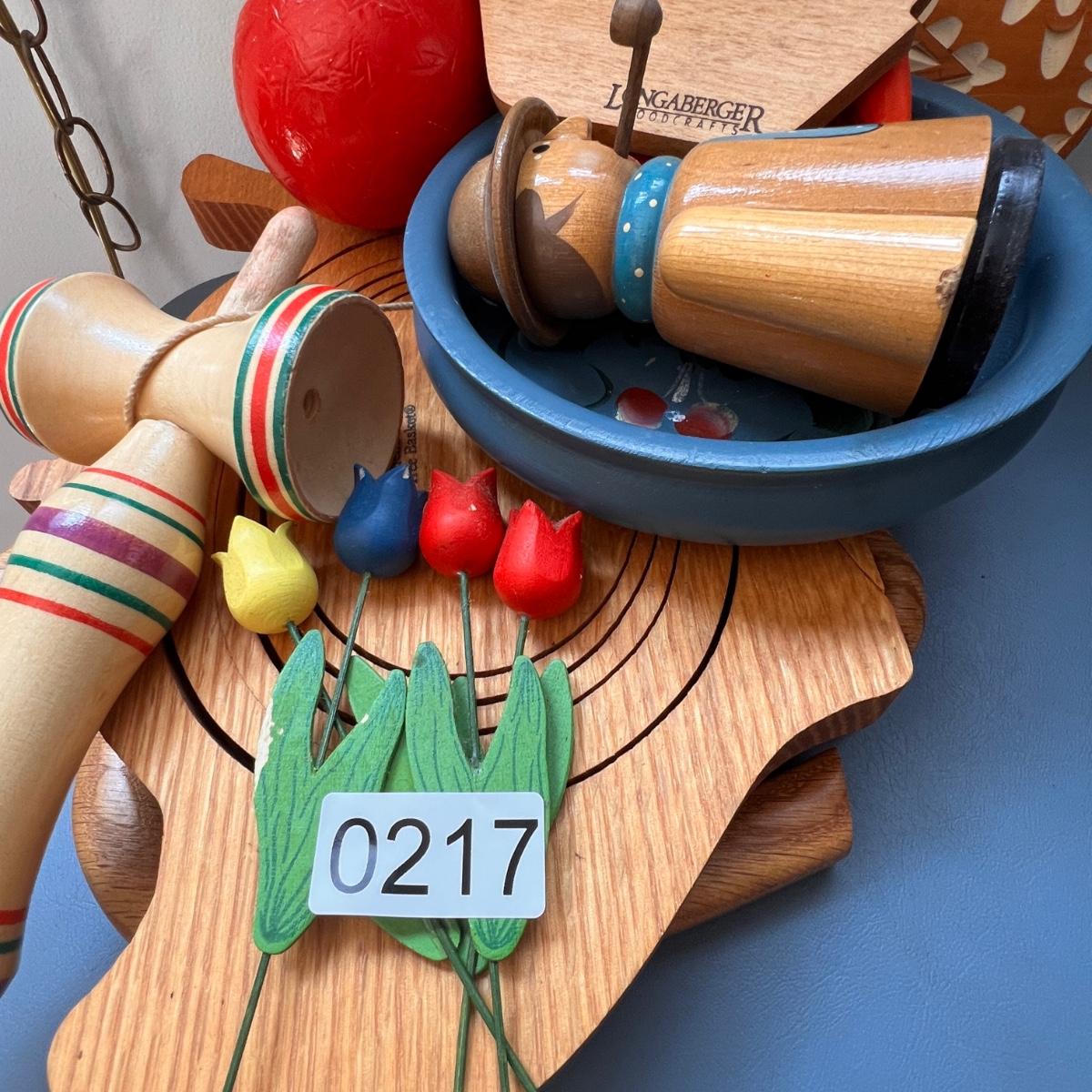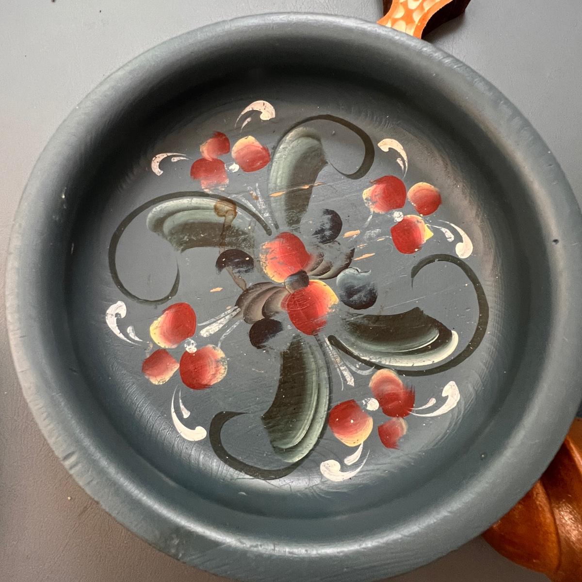German folk art smoking man figurines, Longaberger breadbasket small trivet, Norwegian folk art painted plate, Swedish Dala horse, wooden flowers, Pear Tree folding basket tea pot, apple folding basket, plus more.