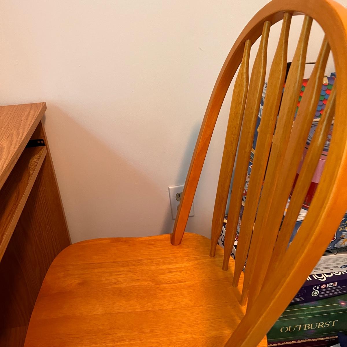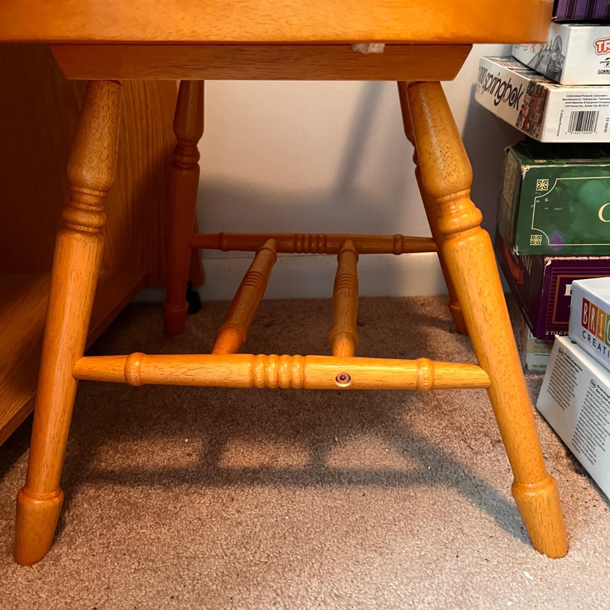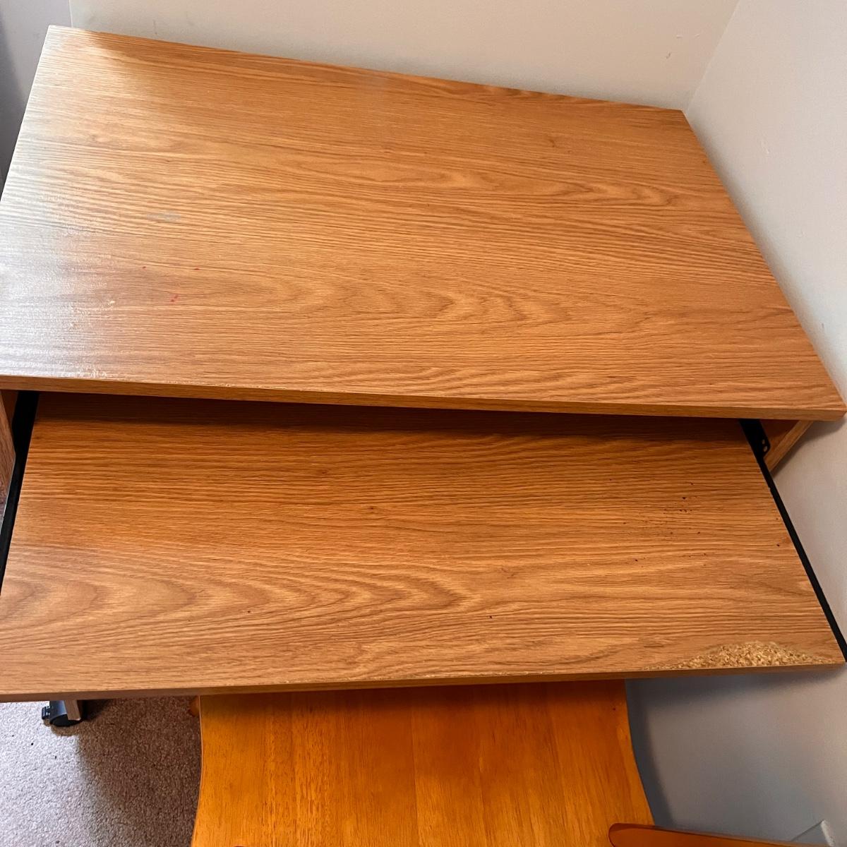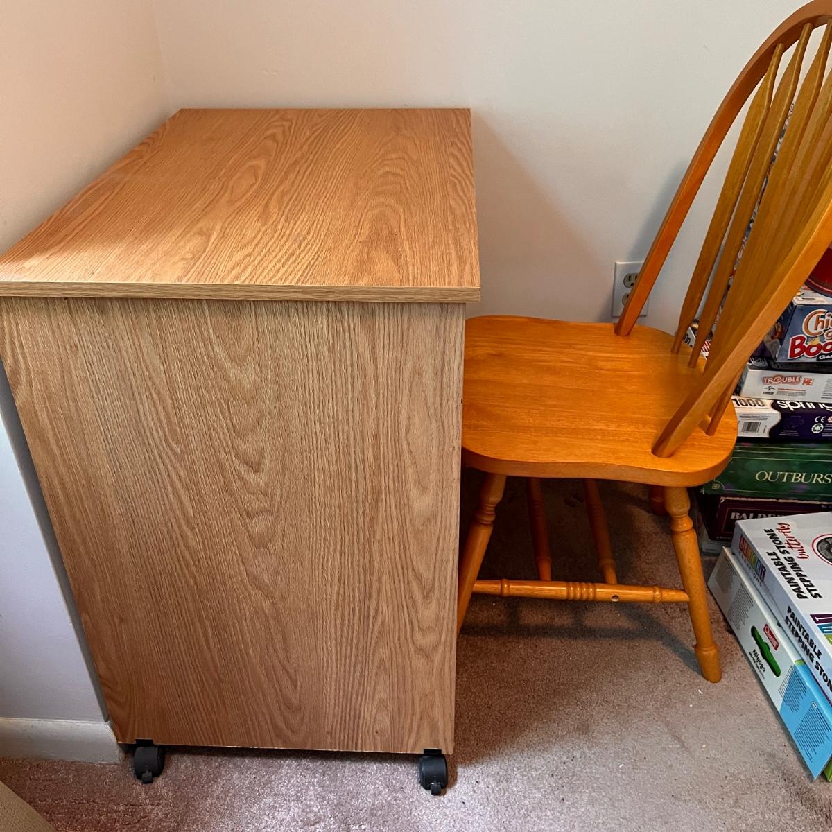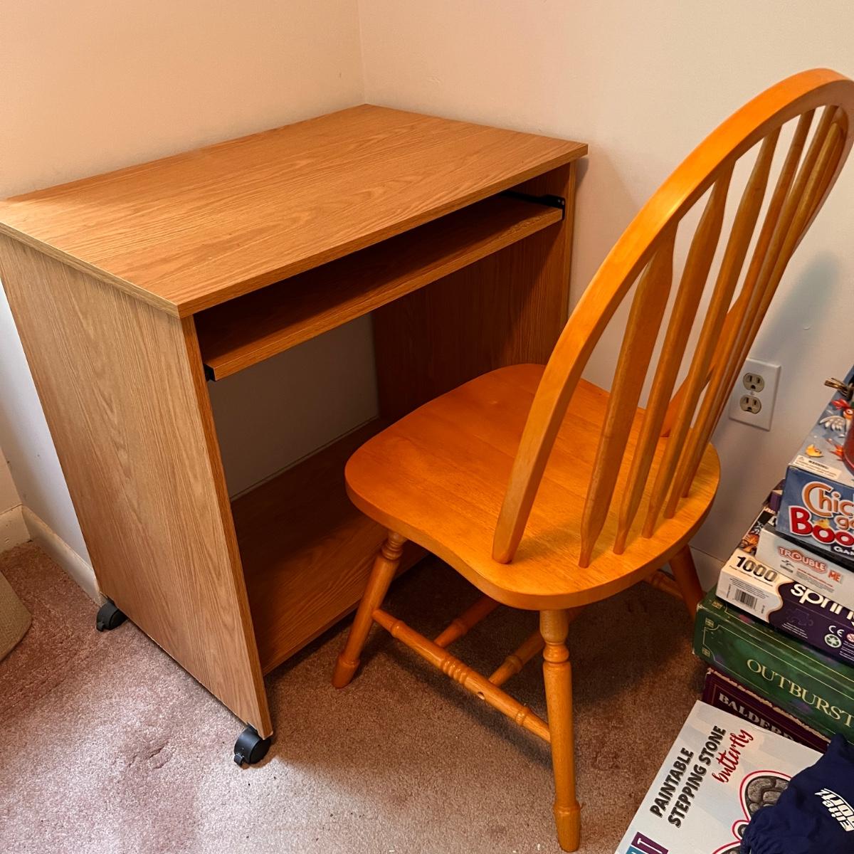 Computer desk on wheels with pull out tray for keyboard. Some wear as shown in pics. Carolina Windsor style chair is in good condition . Only issue is its missing 2 screw covers on legs.