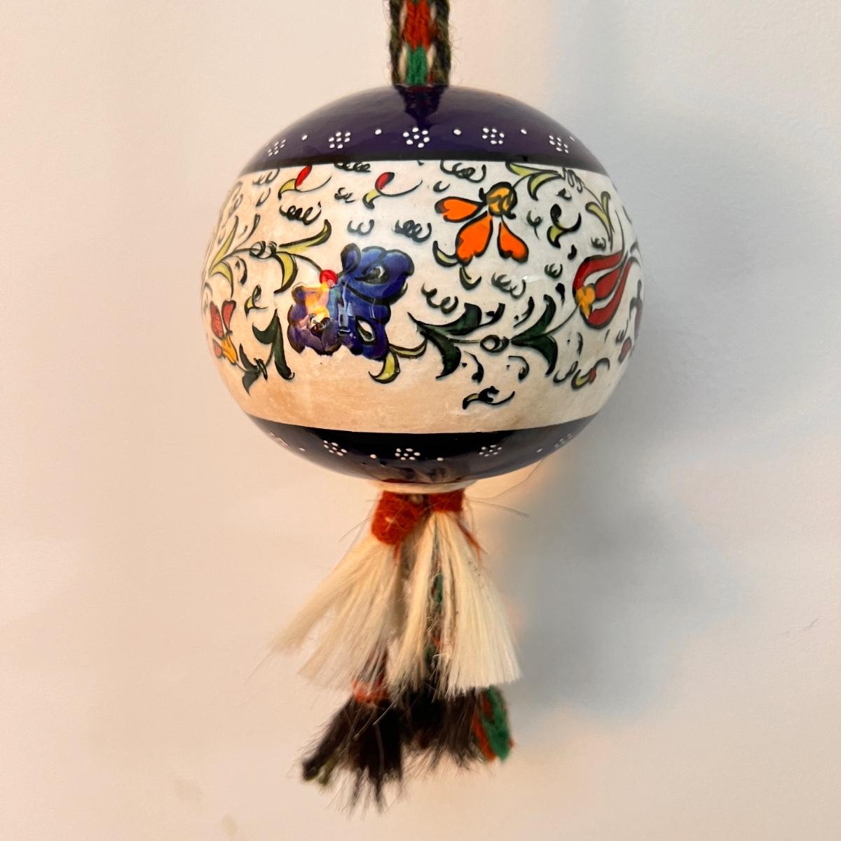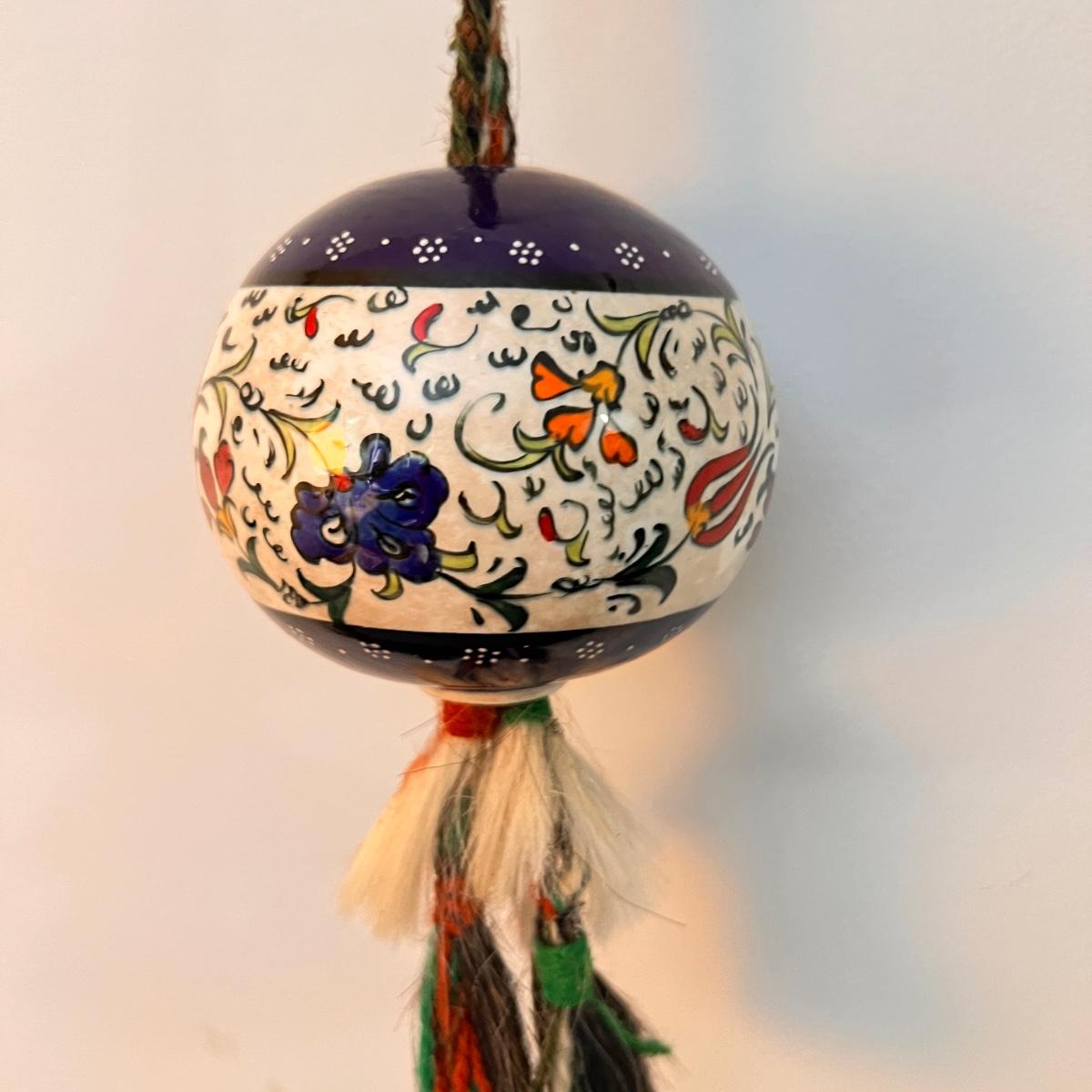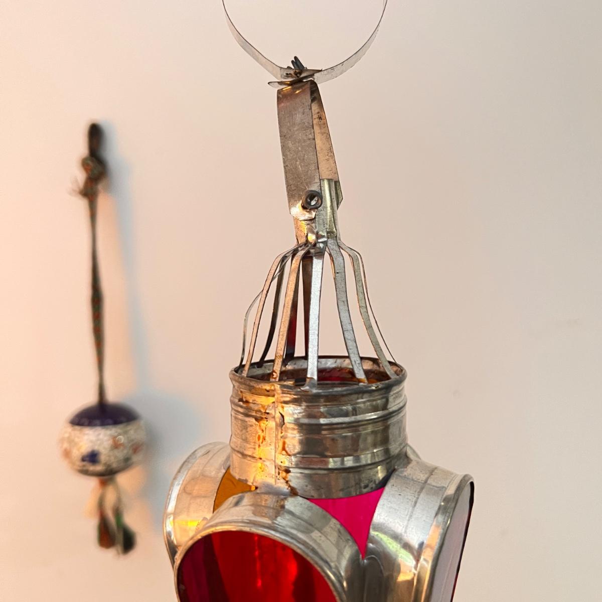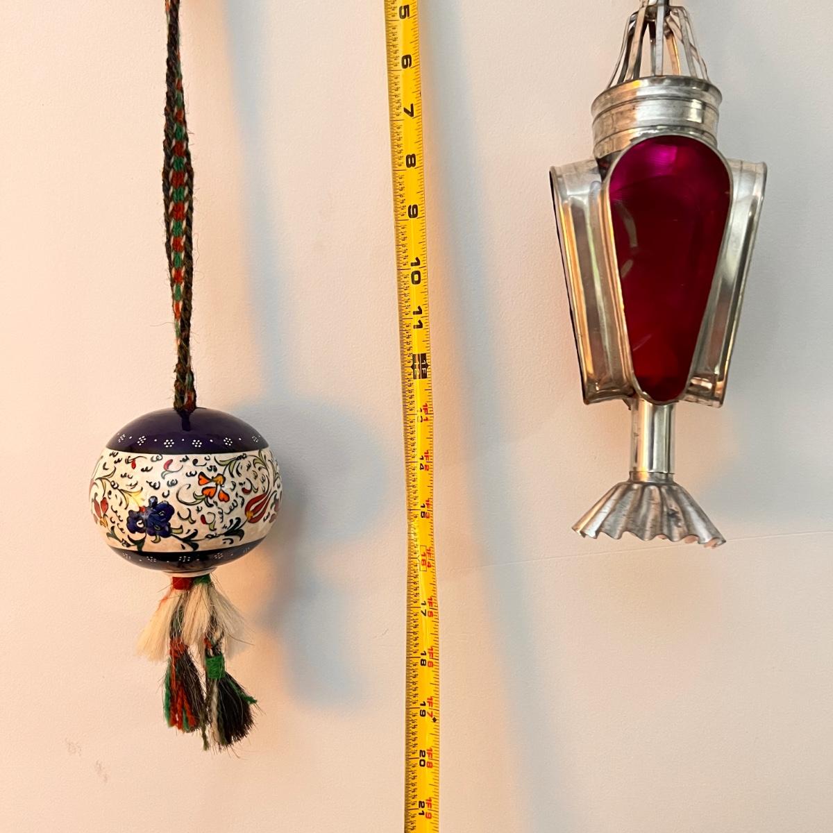 Traditional turkish ceramic ornament usually hung from trees for luck. Tin with multi colored glass panes. The bottom comes off to assumingly insert a candle.