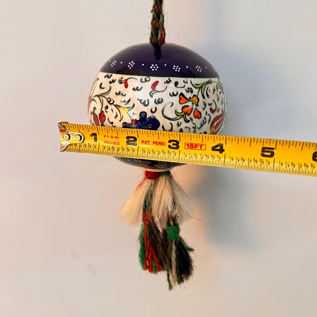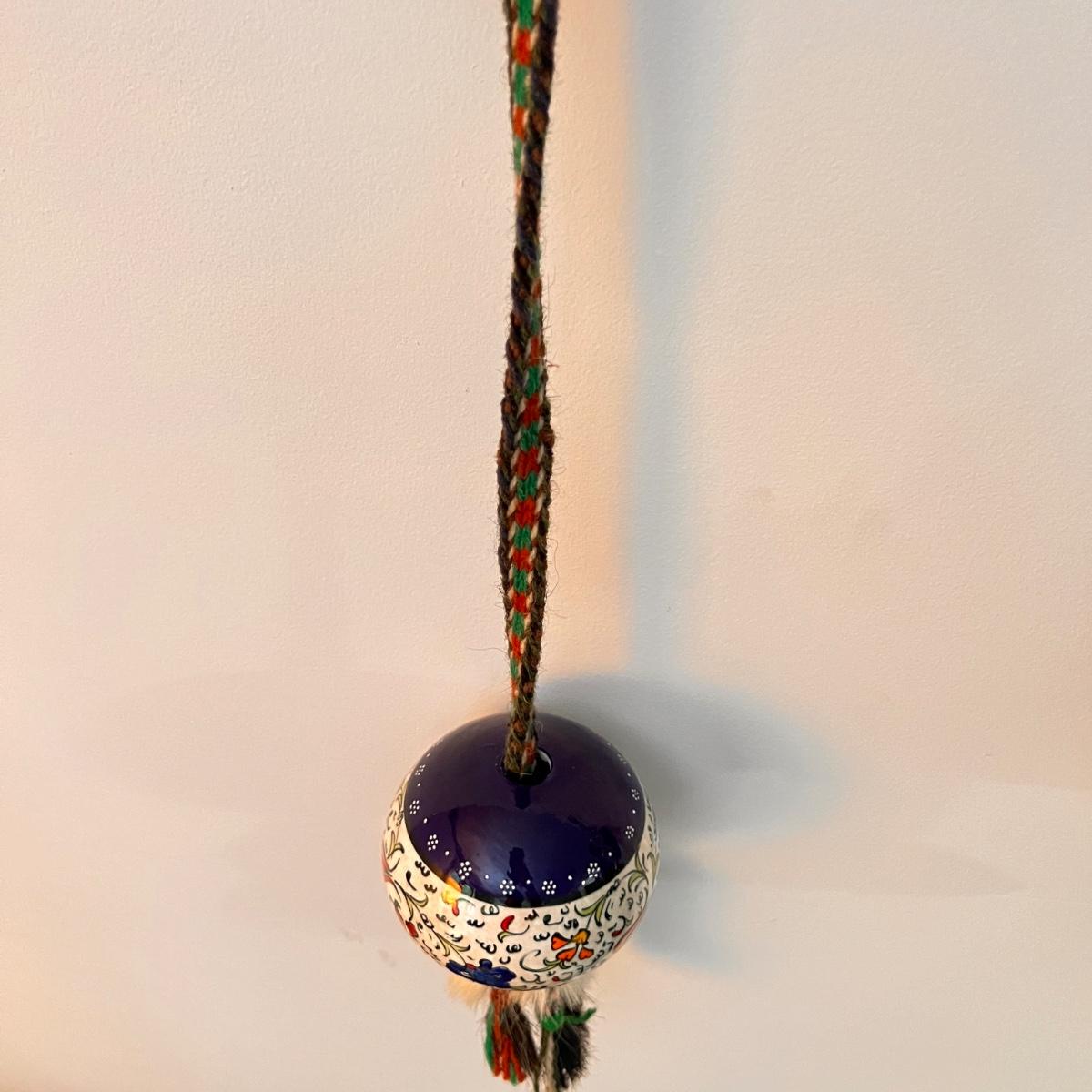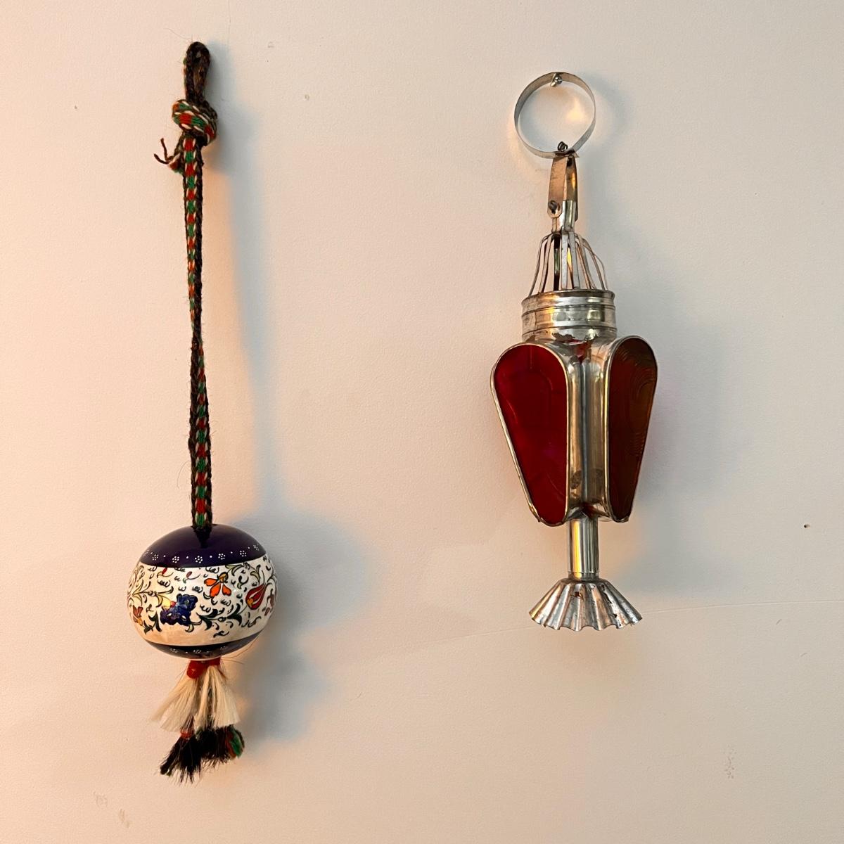 Traditional turkish ceramic ornament usually hung from trees for luck. Tin with multi colored glass panes. The bottom comes off to assumingly insert a candle.