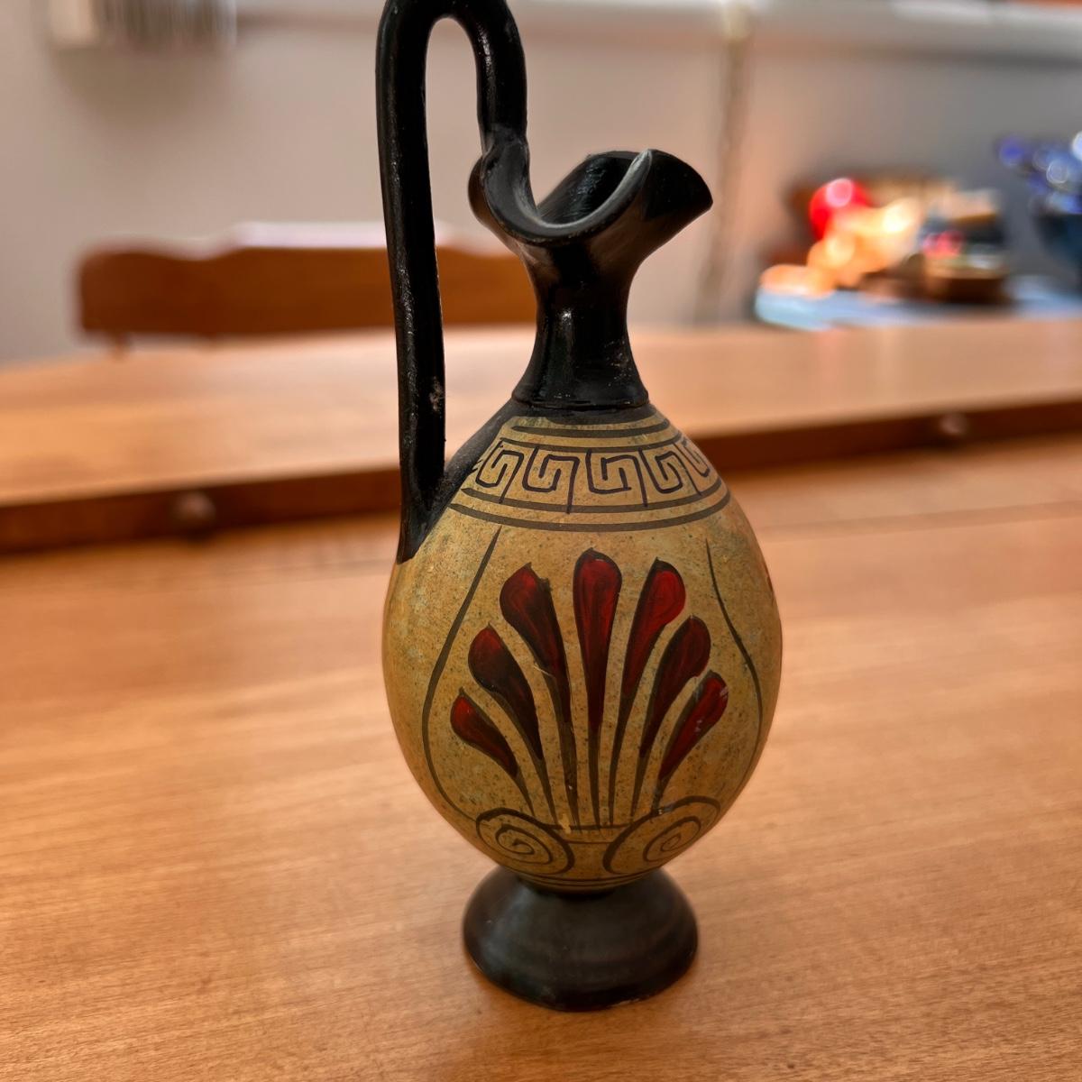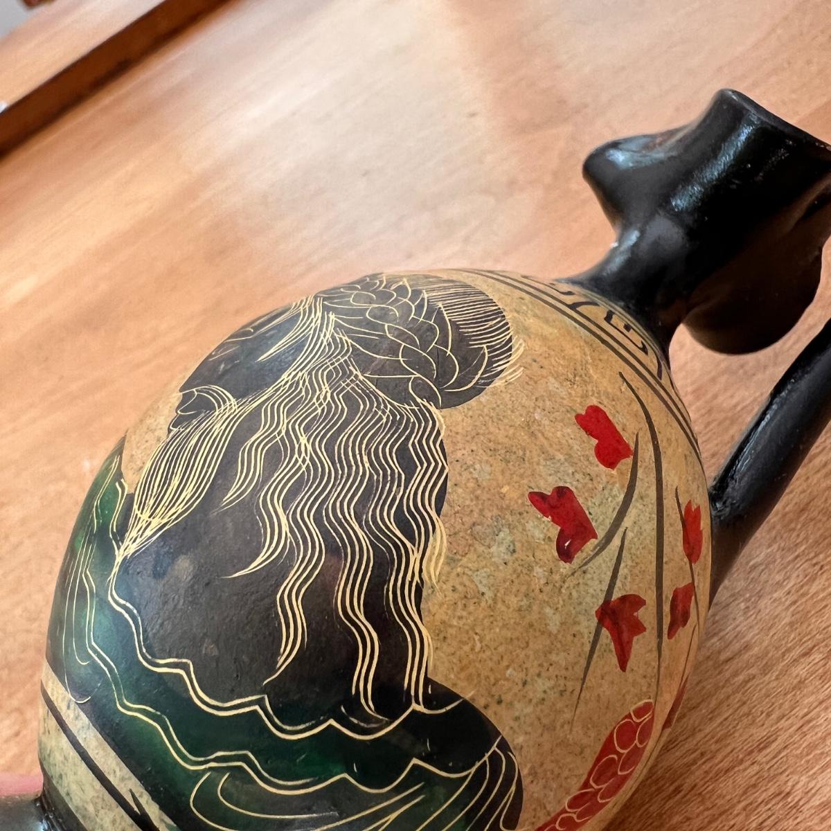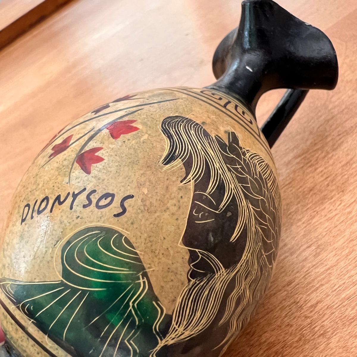 Beautiful details on this small Greek jug vase. Classic geometrical shapes with an etched painting of Greek God Dionysos.