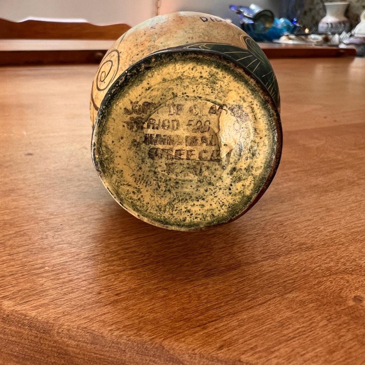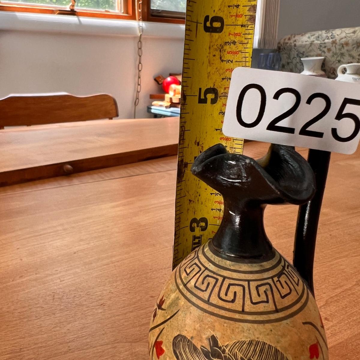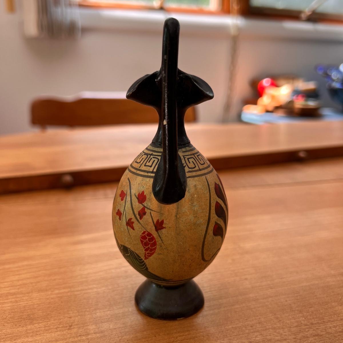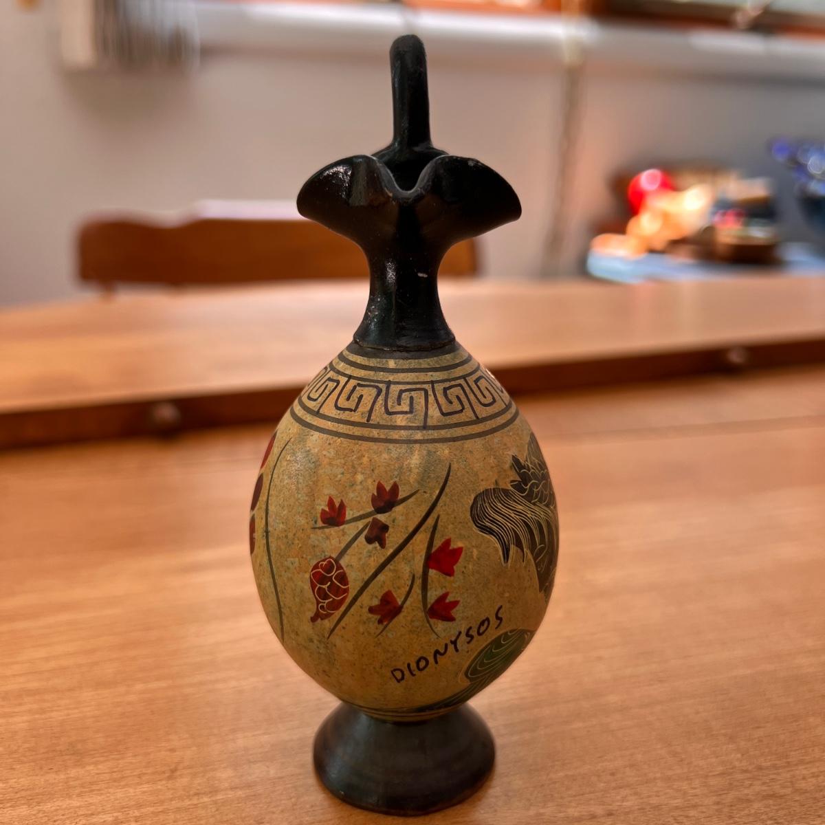 Beautiful details on this small Greek jug vase. Classic geometrical shapes with an etched painting of Greek God Dionysos.