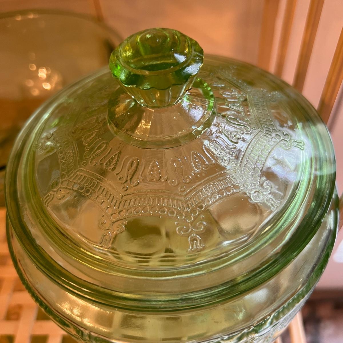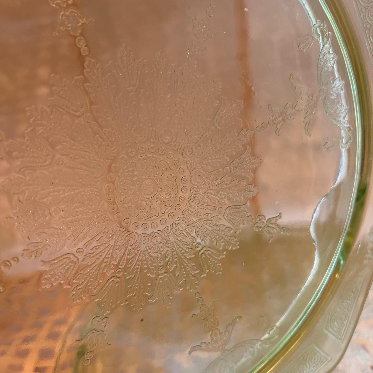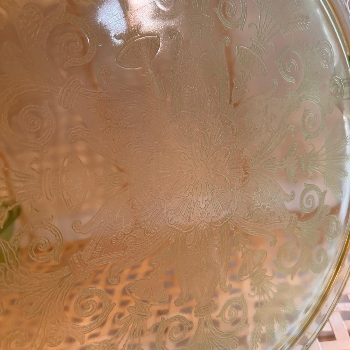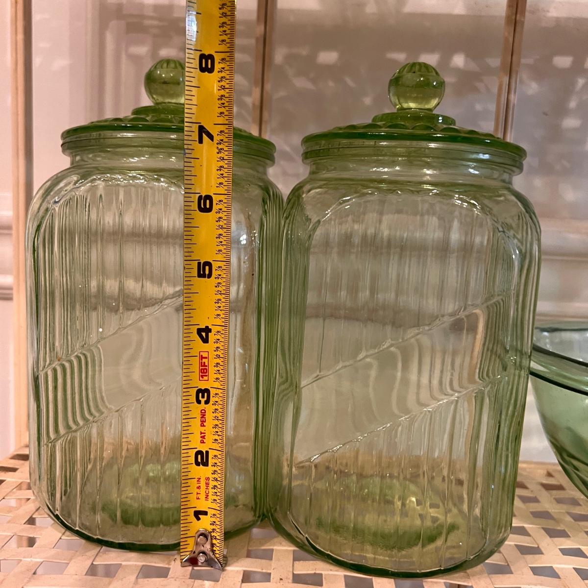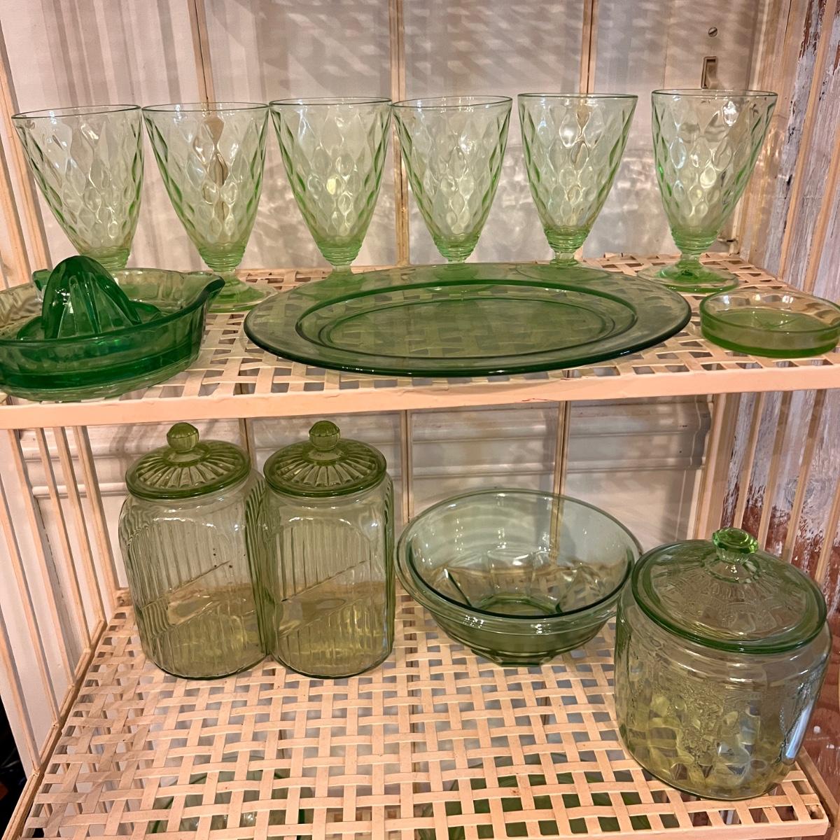 Etched plates, canisters, cups, juicer, bowl, coaster and 1 bowl top that doesn't seem to match any of the other pieces. Juicer has some rough edges, otherwise the lot is in excellent condition.