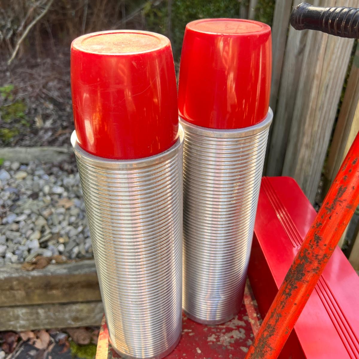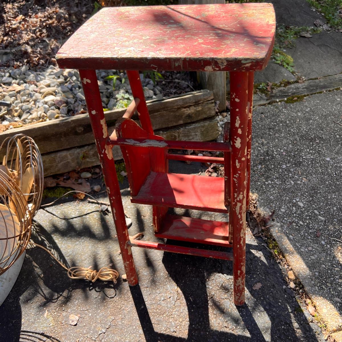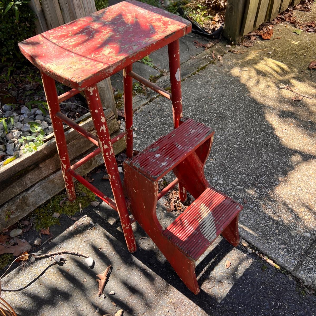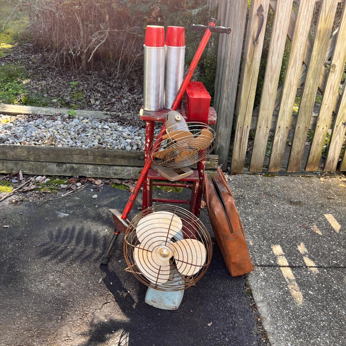 Vintage Wooden Shabby Rustic Folding Step Stool 3 Tier Kitchen Farmhouse, 2 metal fans both work, 2 Thermos containers.