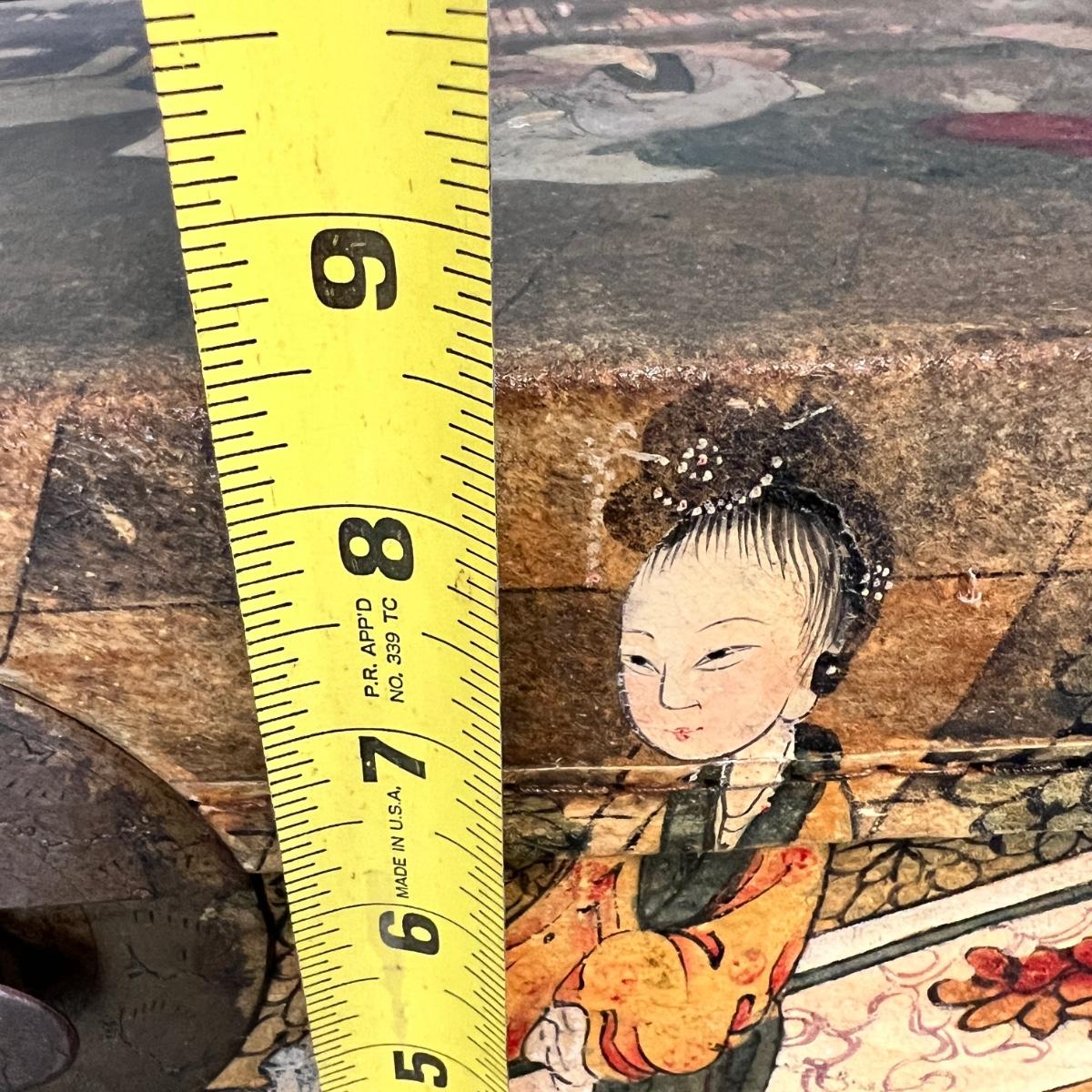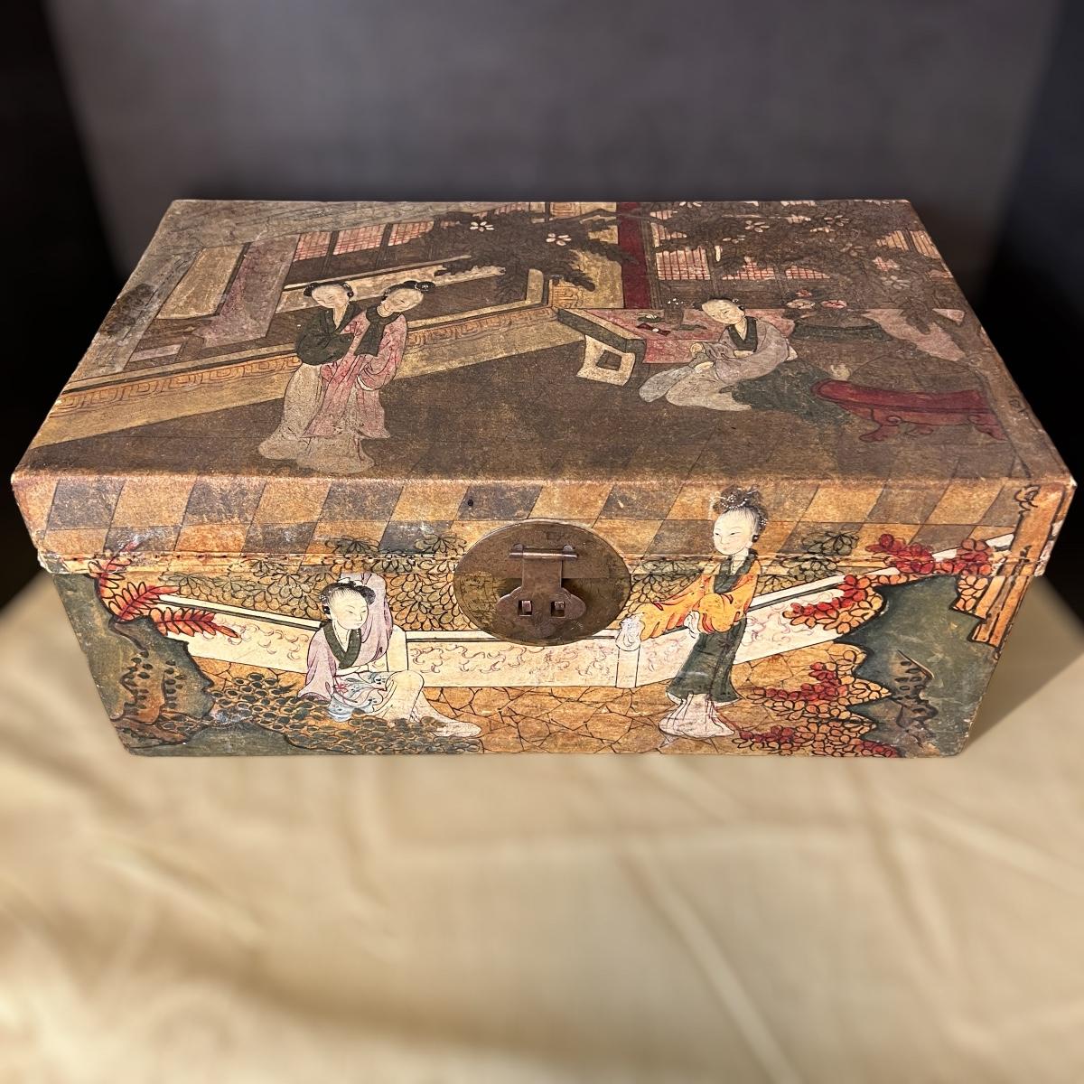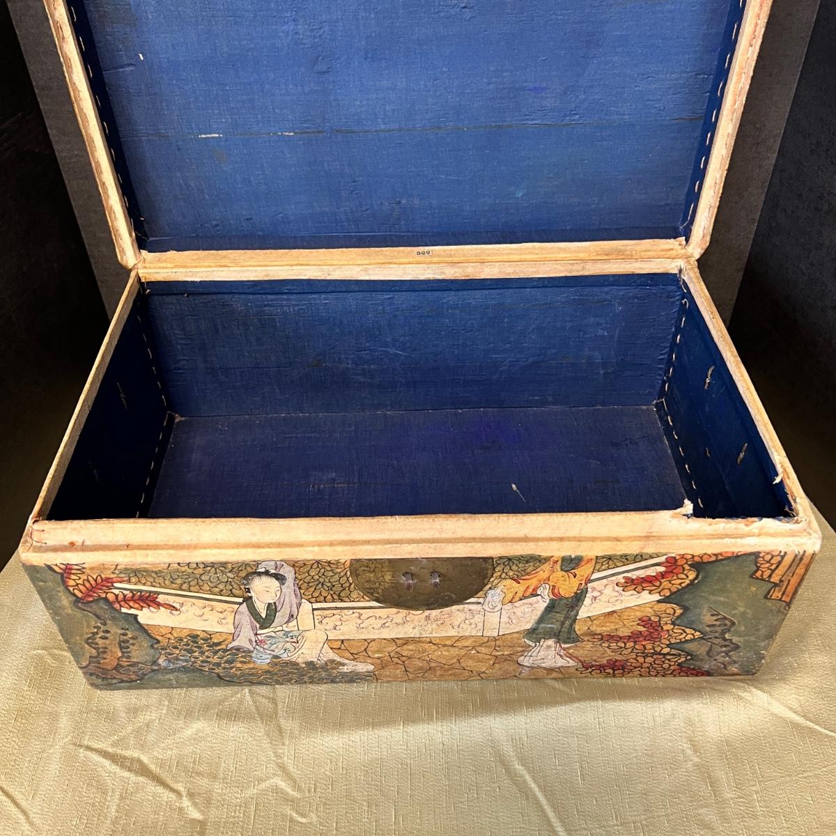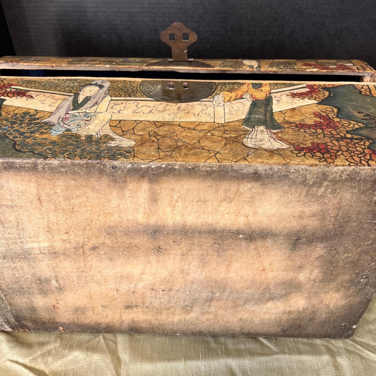 Hand painted on vellum (animal skin) antique chest box. Very detailed pictures of classic chinoiserie scenes including ladies in court, trees, pavilions. See all pictures, inside right front corner has damage that's only seen when opened.
