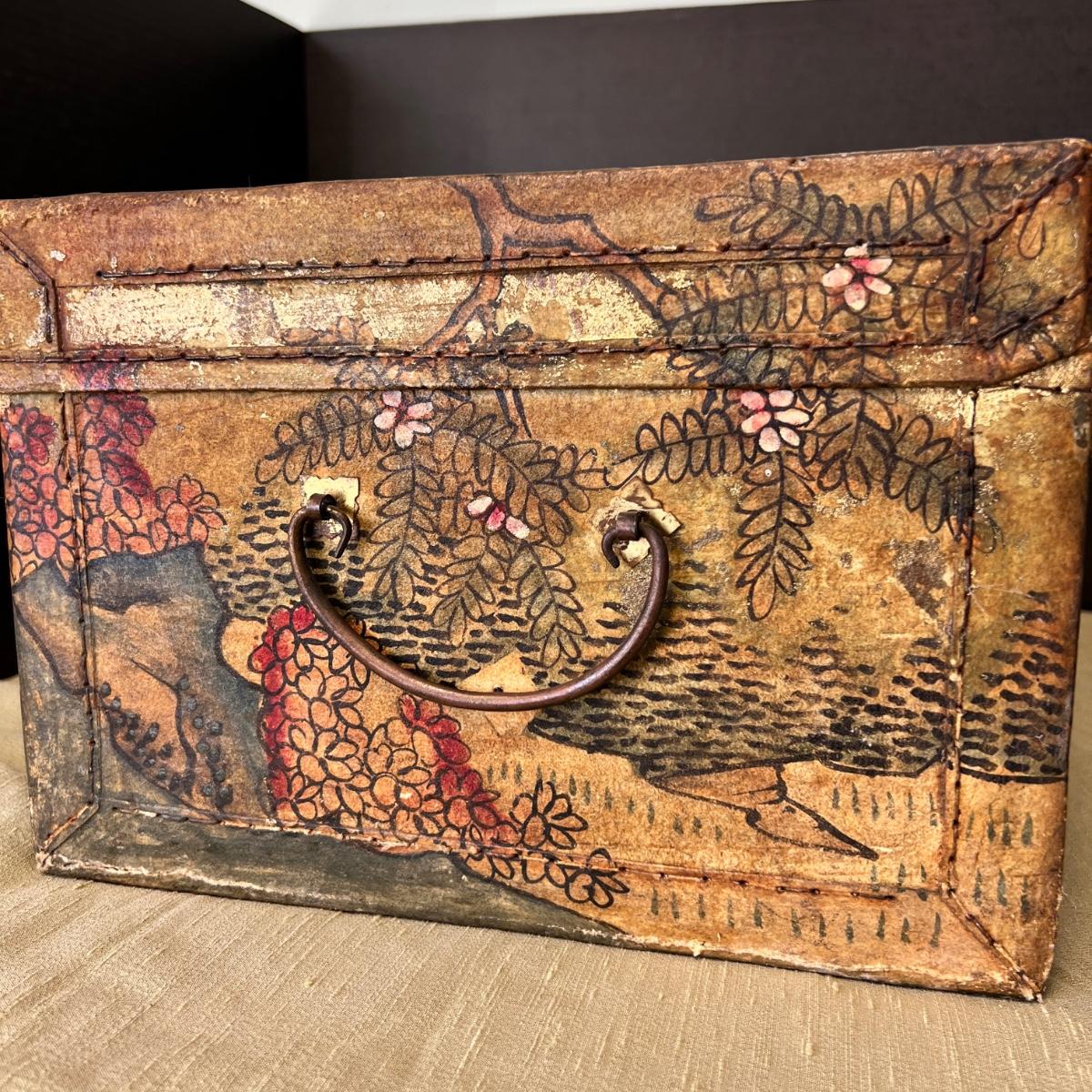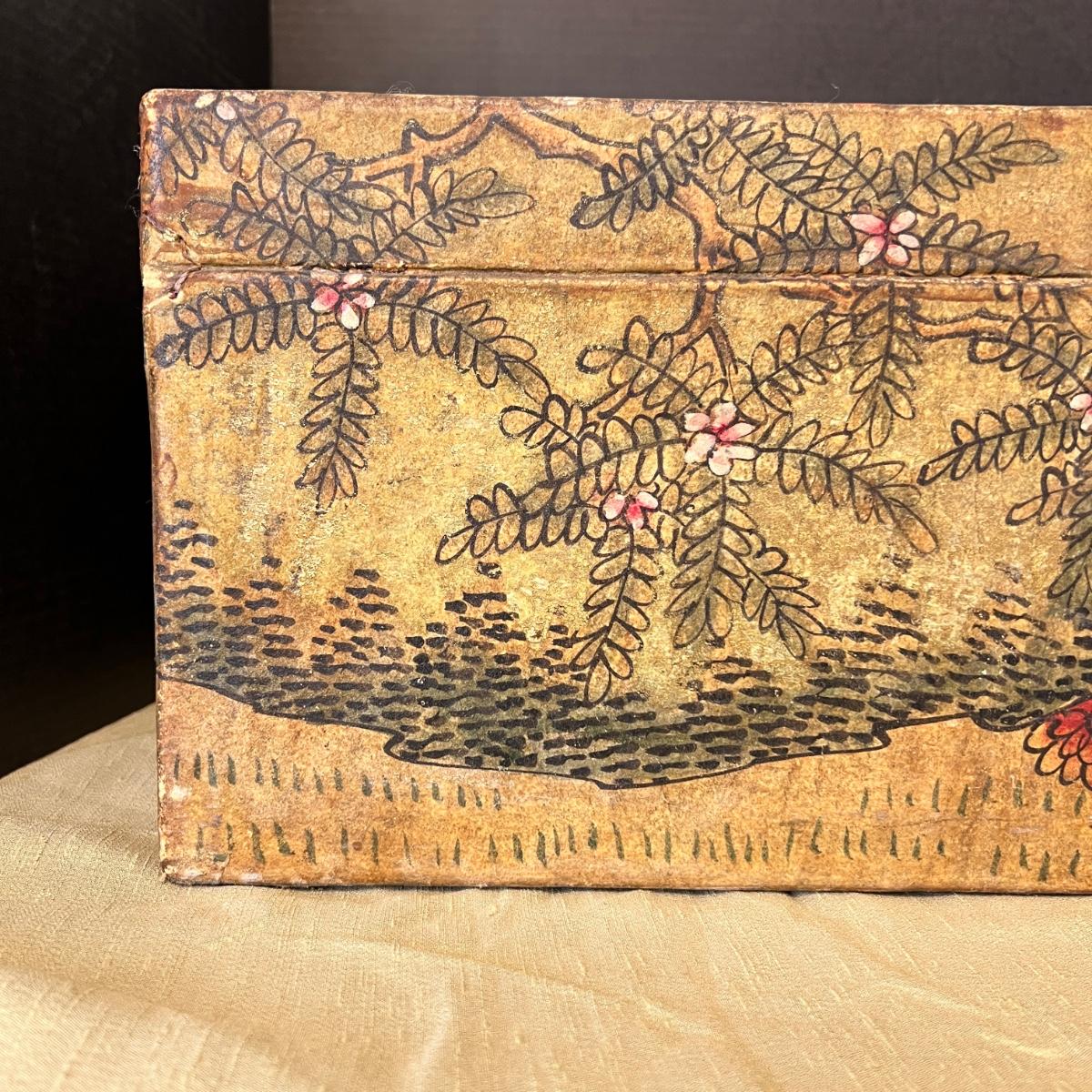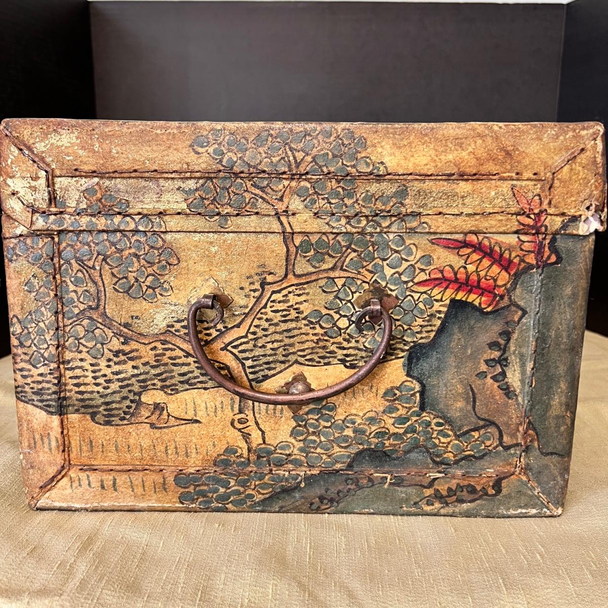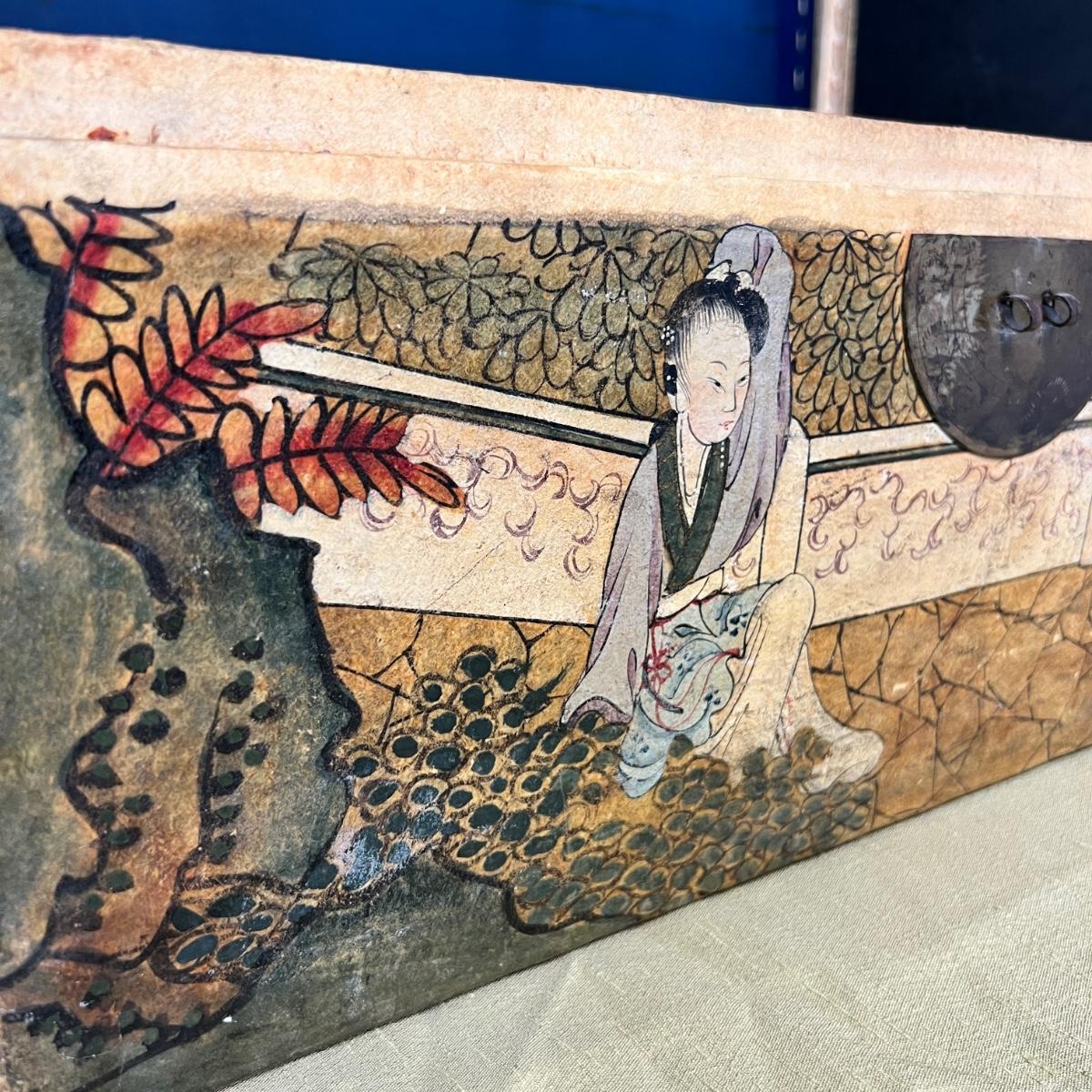 Hand painted on vellum (animal skin) antique chest box. Very detailed pictures of classic chinoiserie scenes including ladies in court, trees, pavilions. See all pictures, inside right front corner has damage that's only seen when opened.