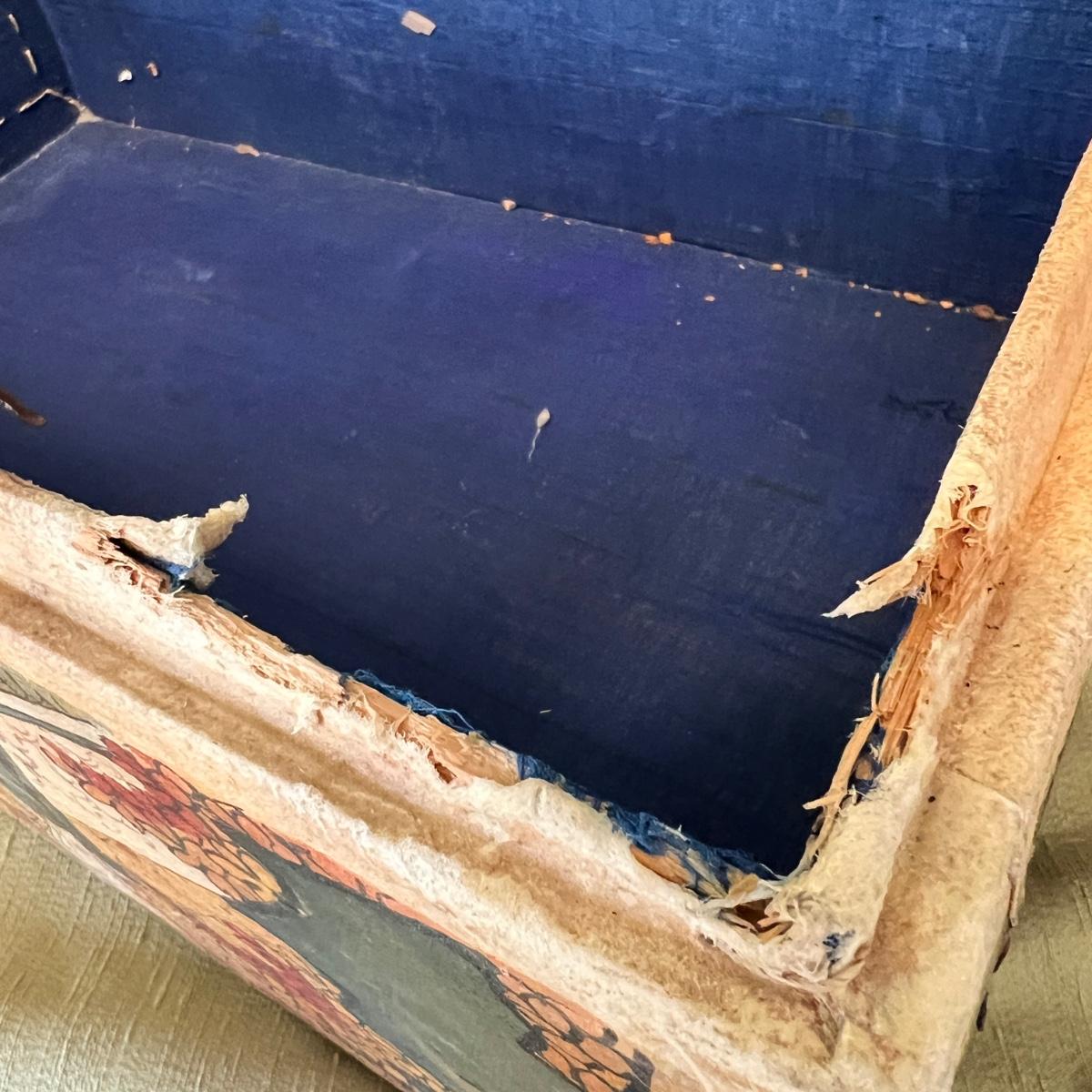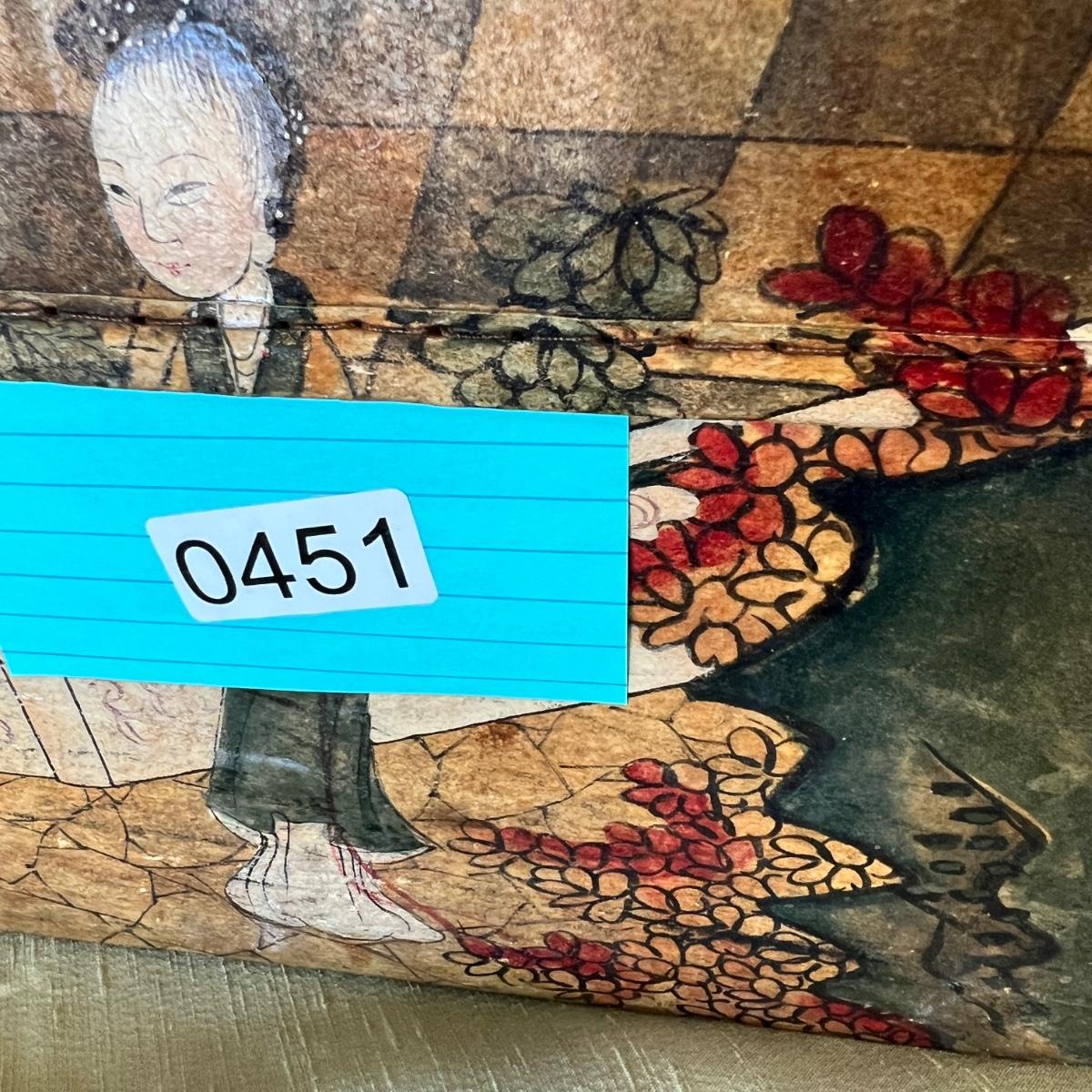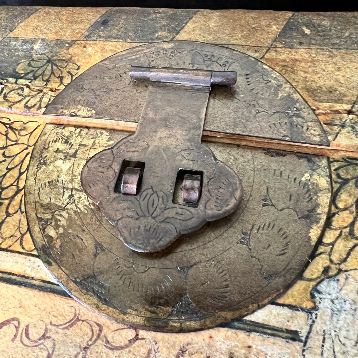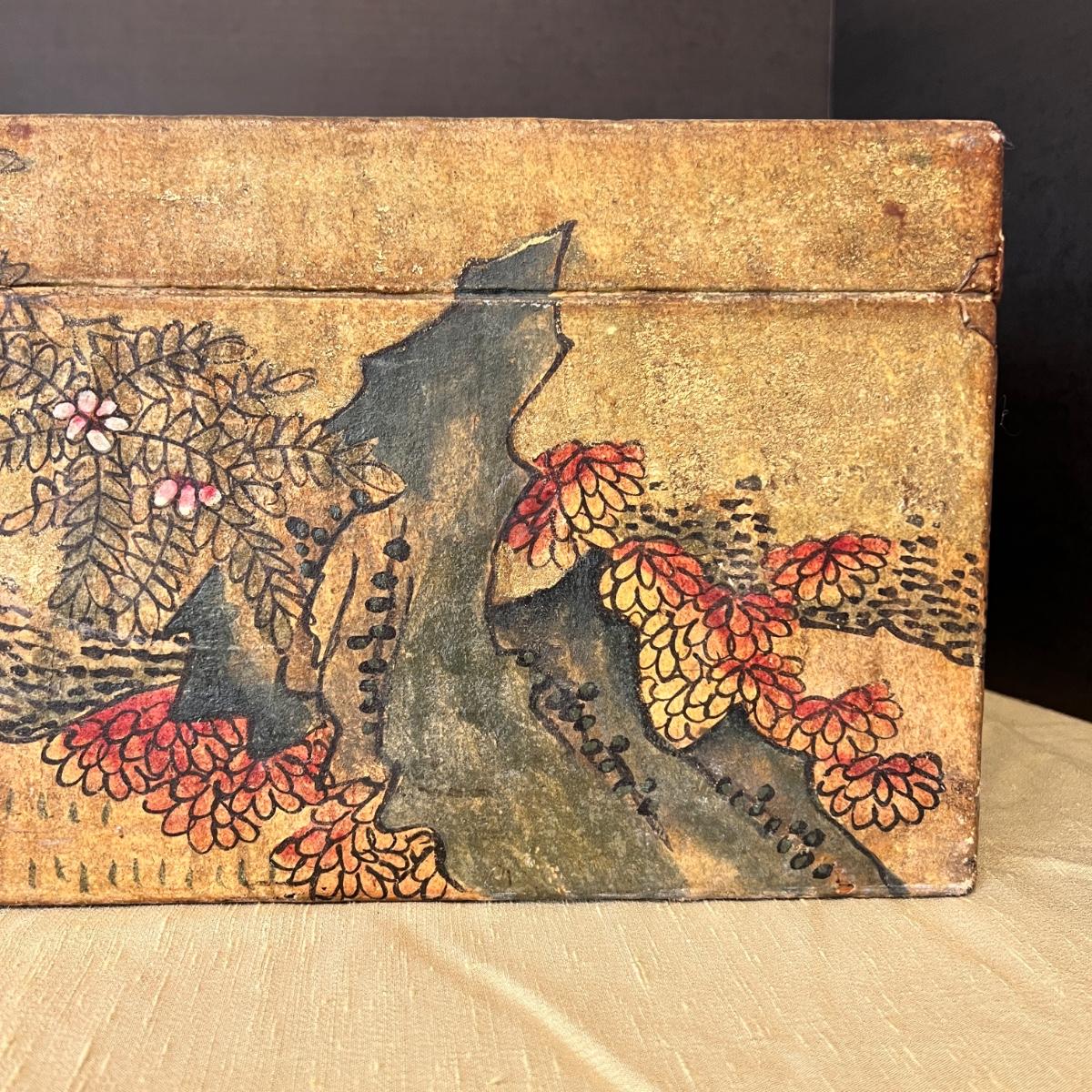 Hand painted on vellum (animal skin) antique chest box. Very detailed pictures of classic chinoiserie scenes including ladies in court, trees, pavilions. See all pictures, inside right front corner has damage that's only seen when opened.