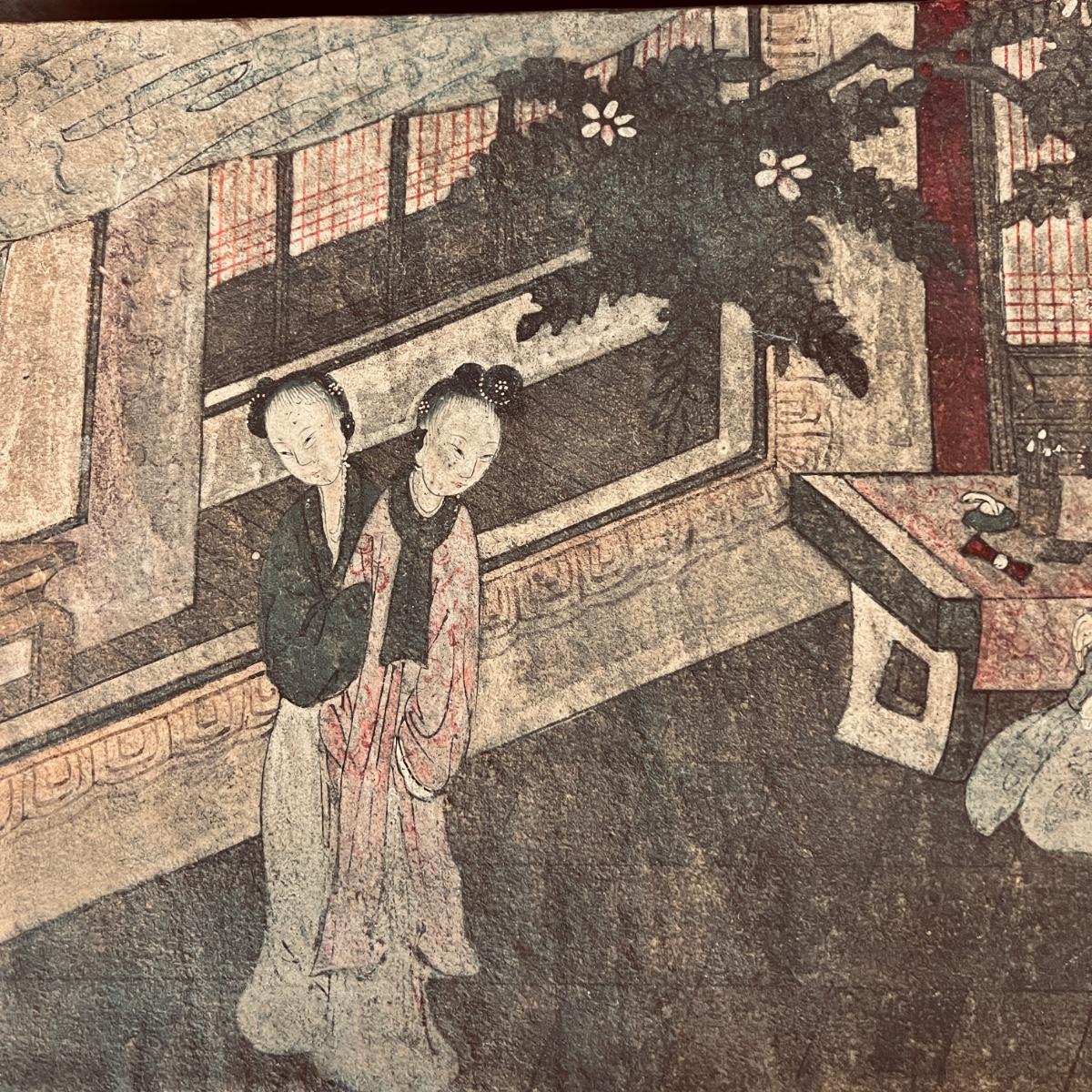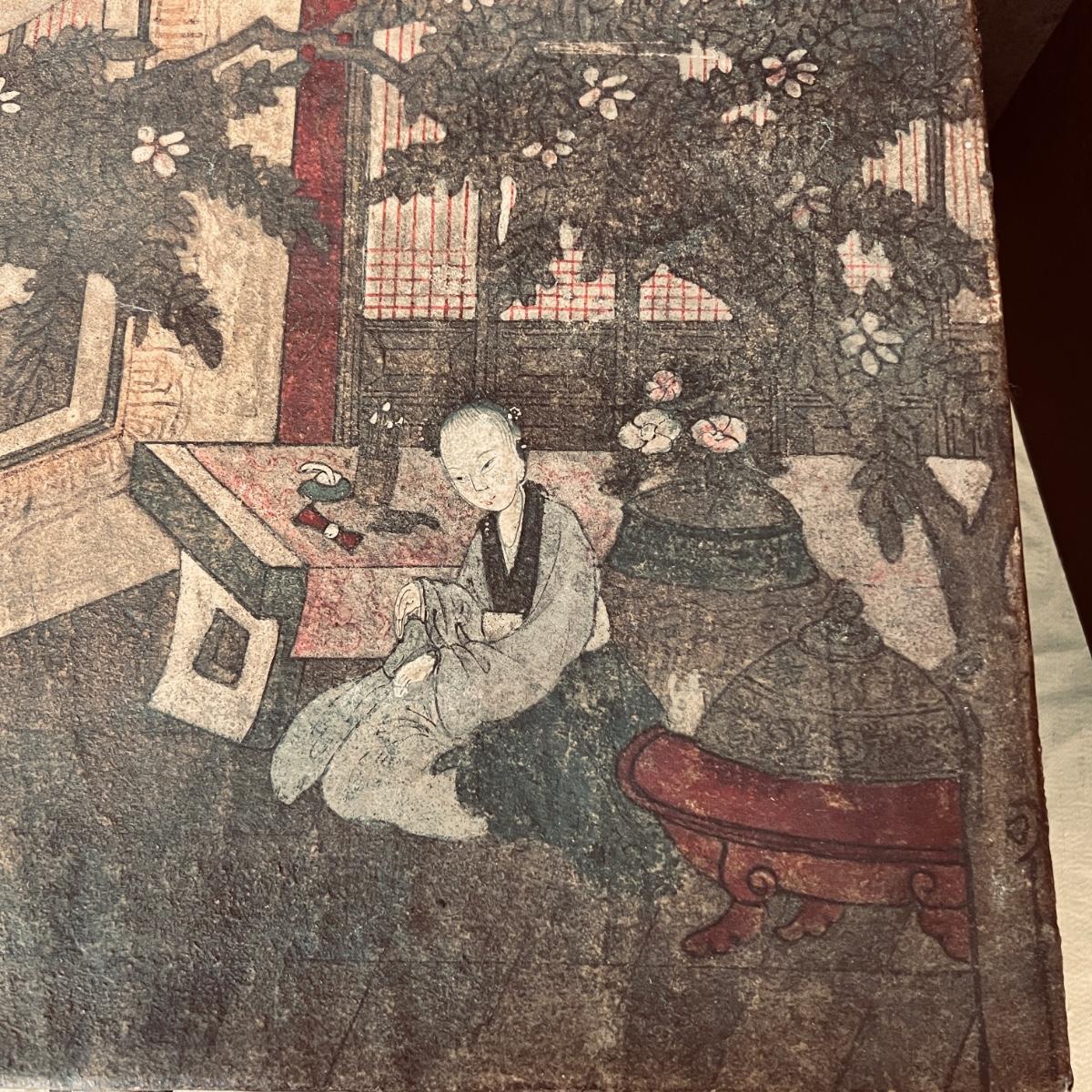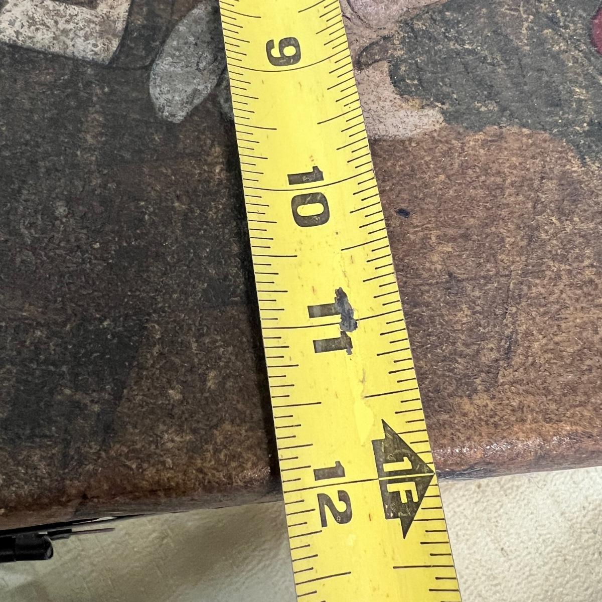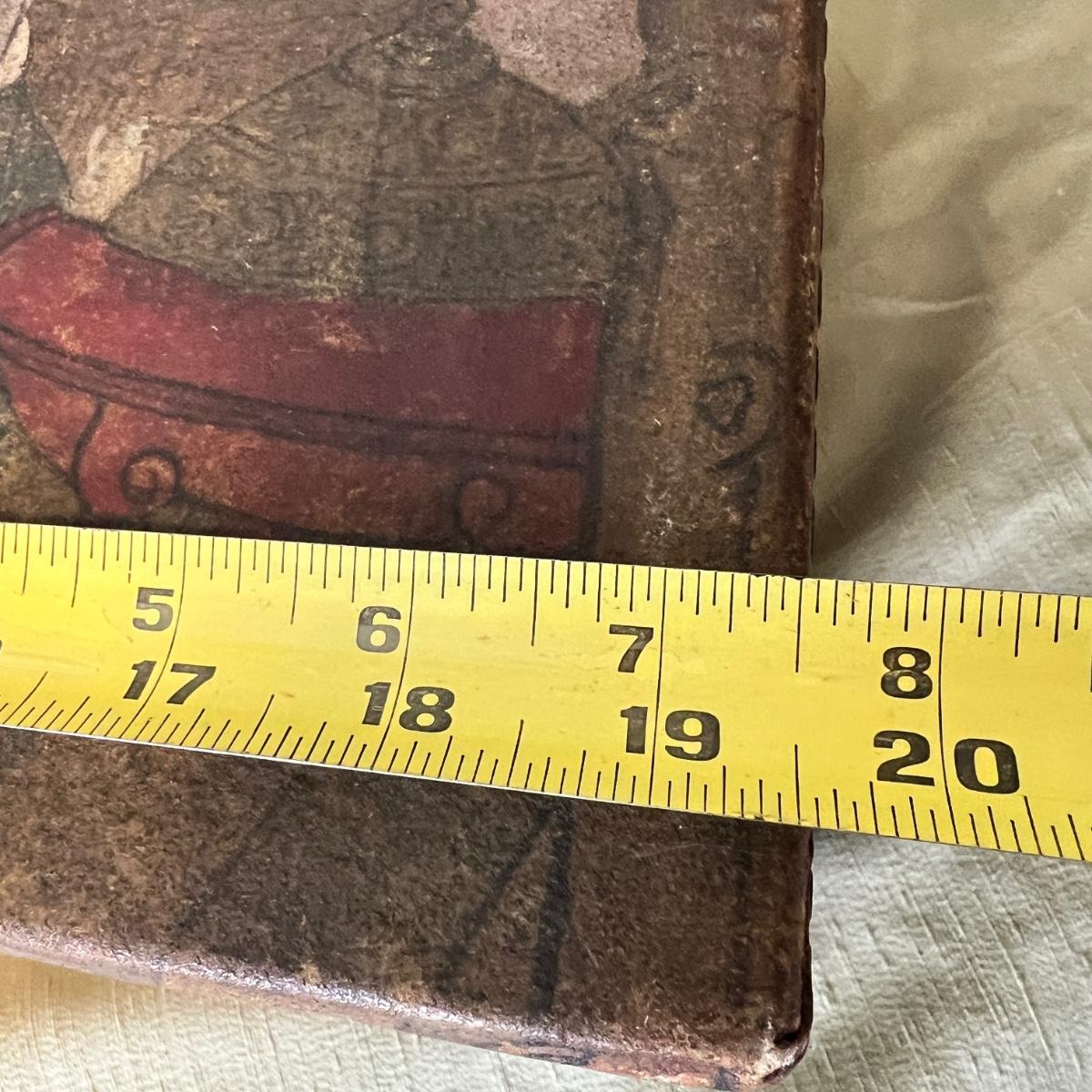 Hand painted on vellum (animal skin) antique chest box. Very detailed pictures of classic chinoiserie scenes including ladies in court, trees, pavilions. See all pictures, inside right front corner has damage that's only seen when opened.