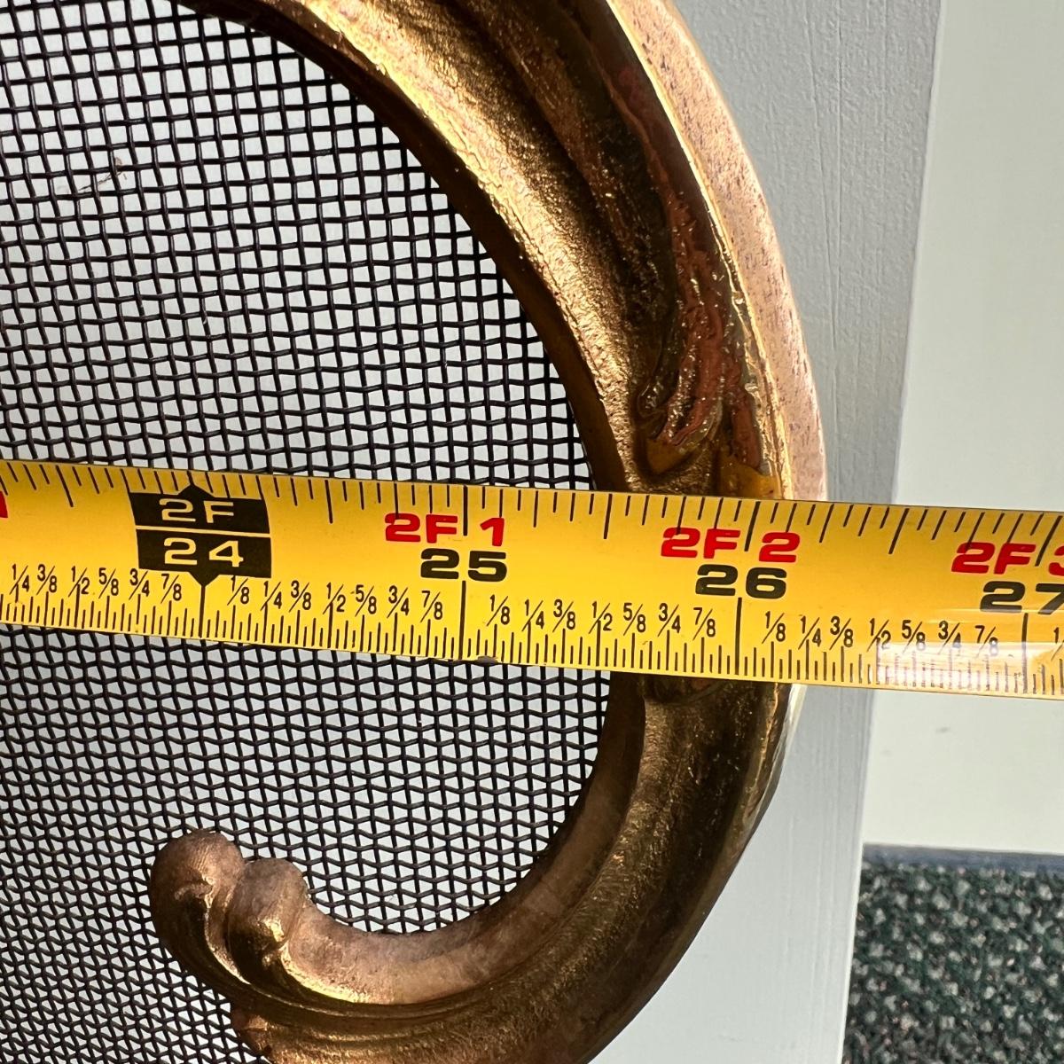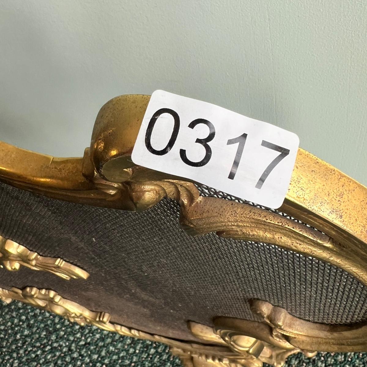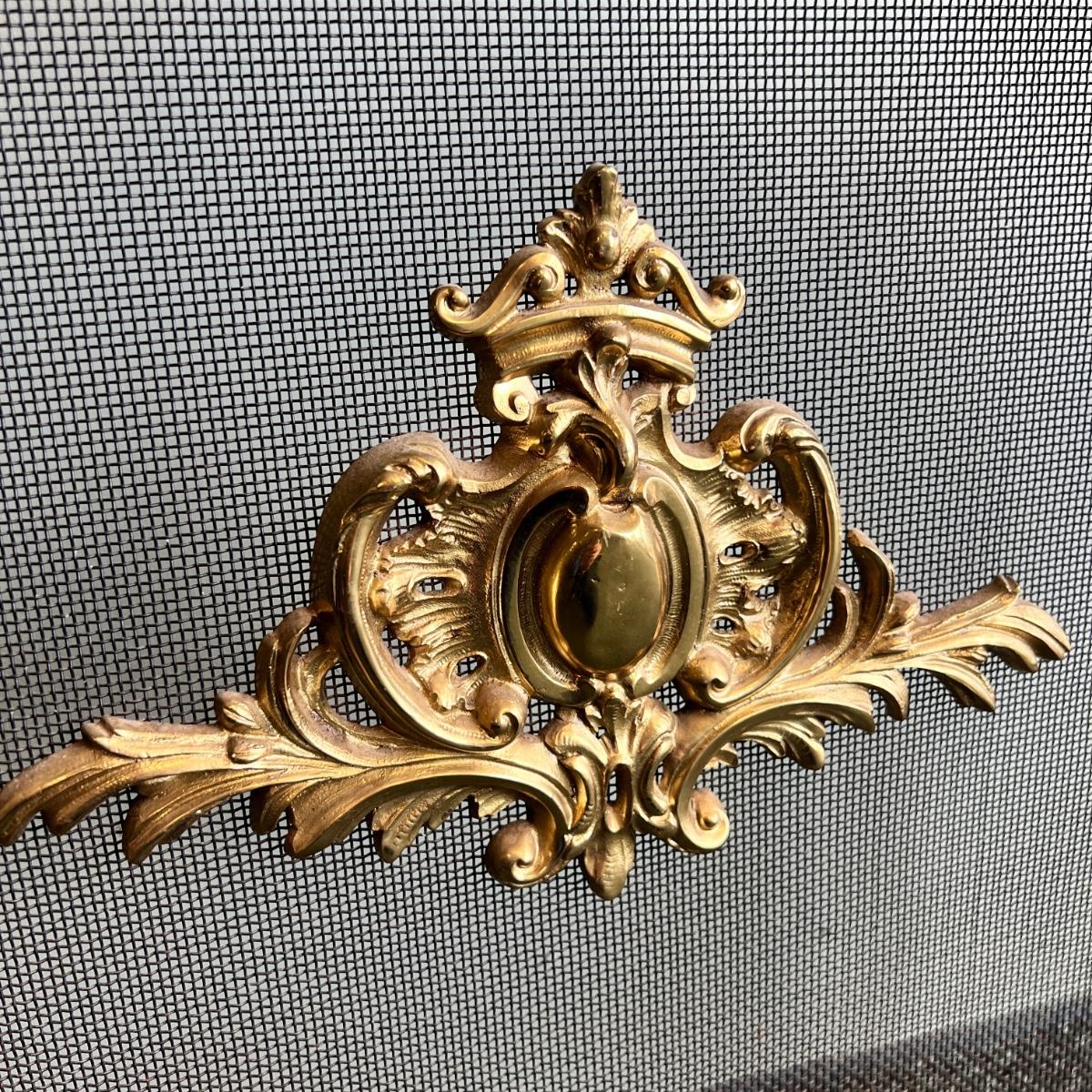 Gilt bronze fireplace screen with finely chased cast details surrounding a brass mesh panel. Very regal!