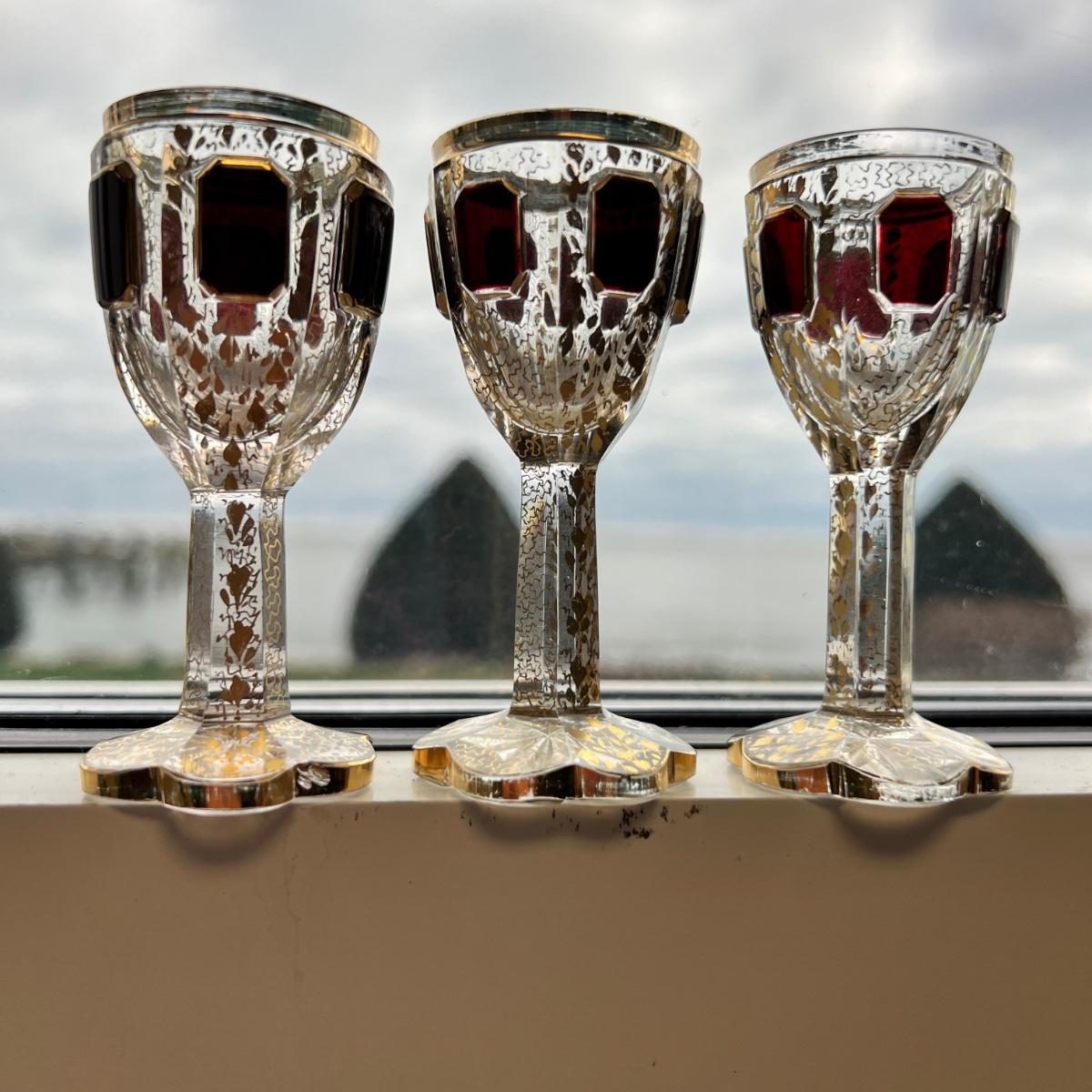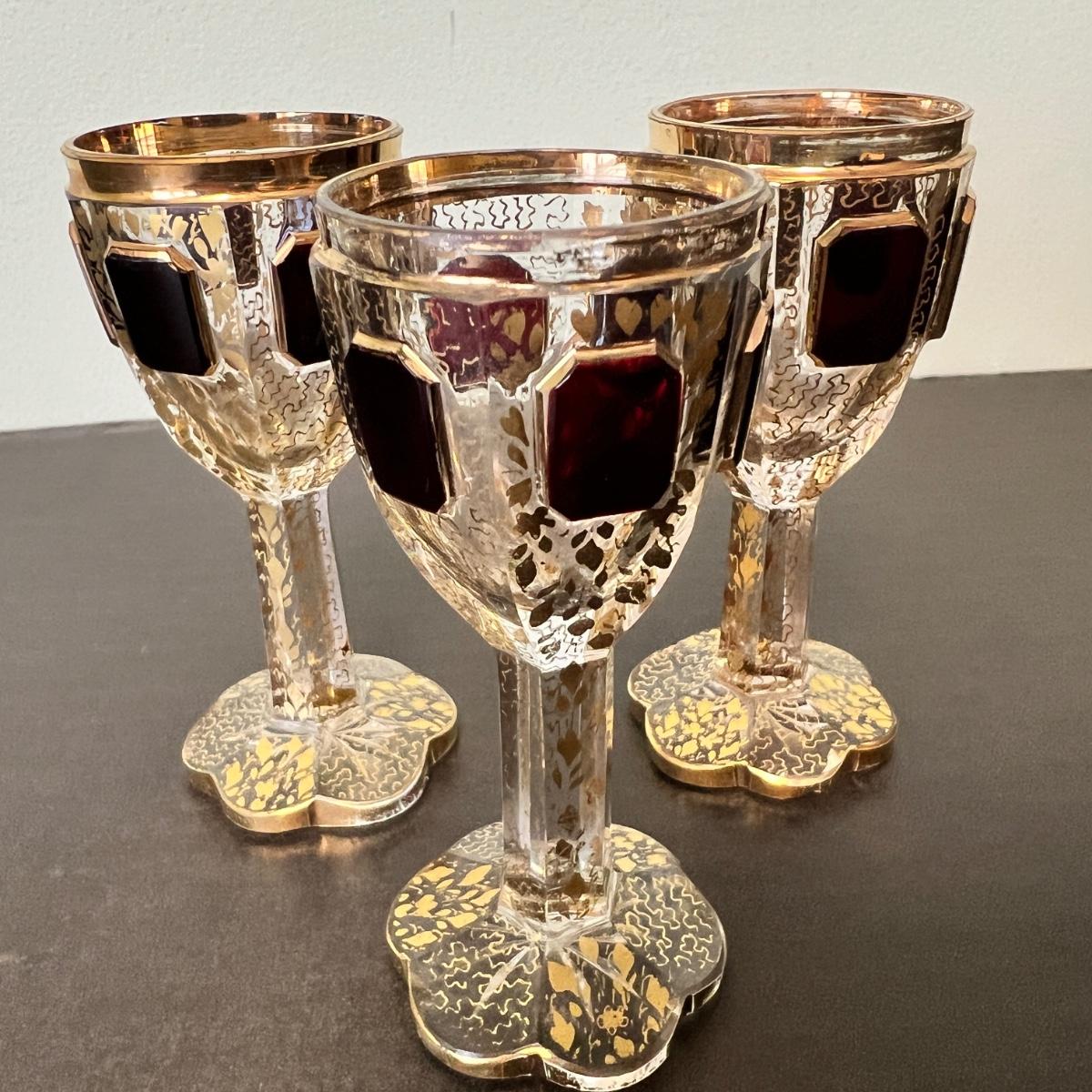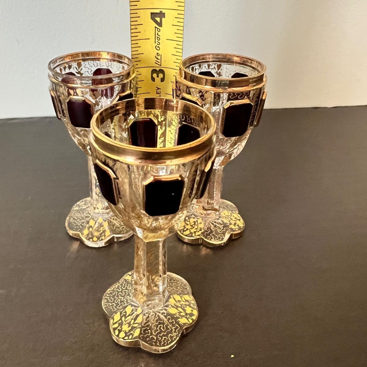 Lot of 3 antique believed to possibly be Moser Bohemian Art Glass Cabochon goblets. These elegant small goblets display 6 panel ruby cabochons surrounded by gilt. The rims of the goblets are decorated with gilt as well.