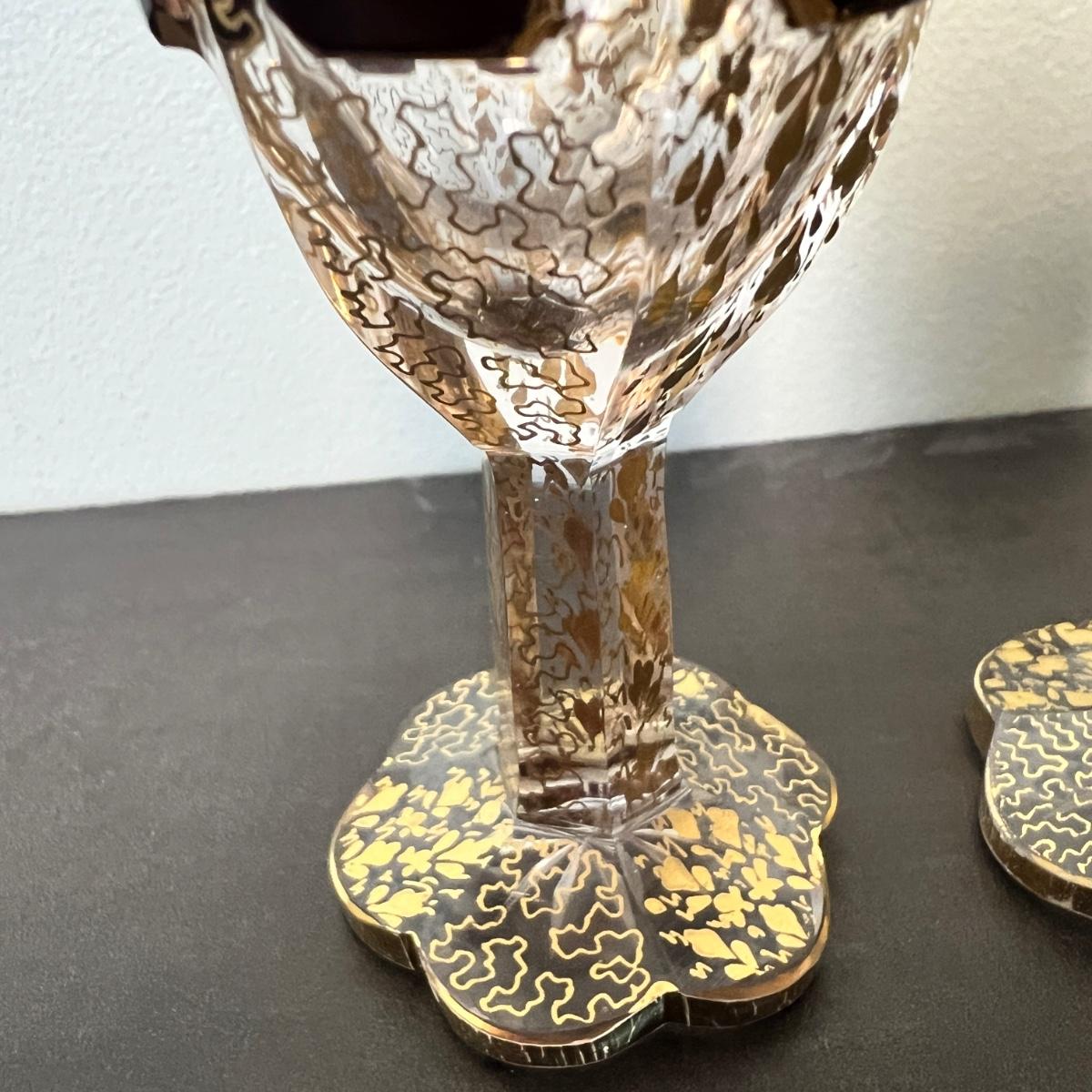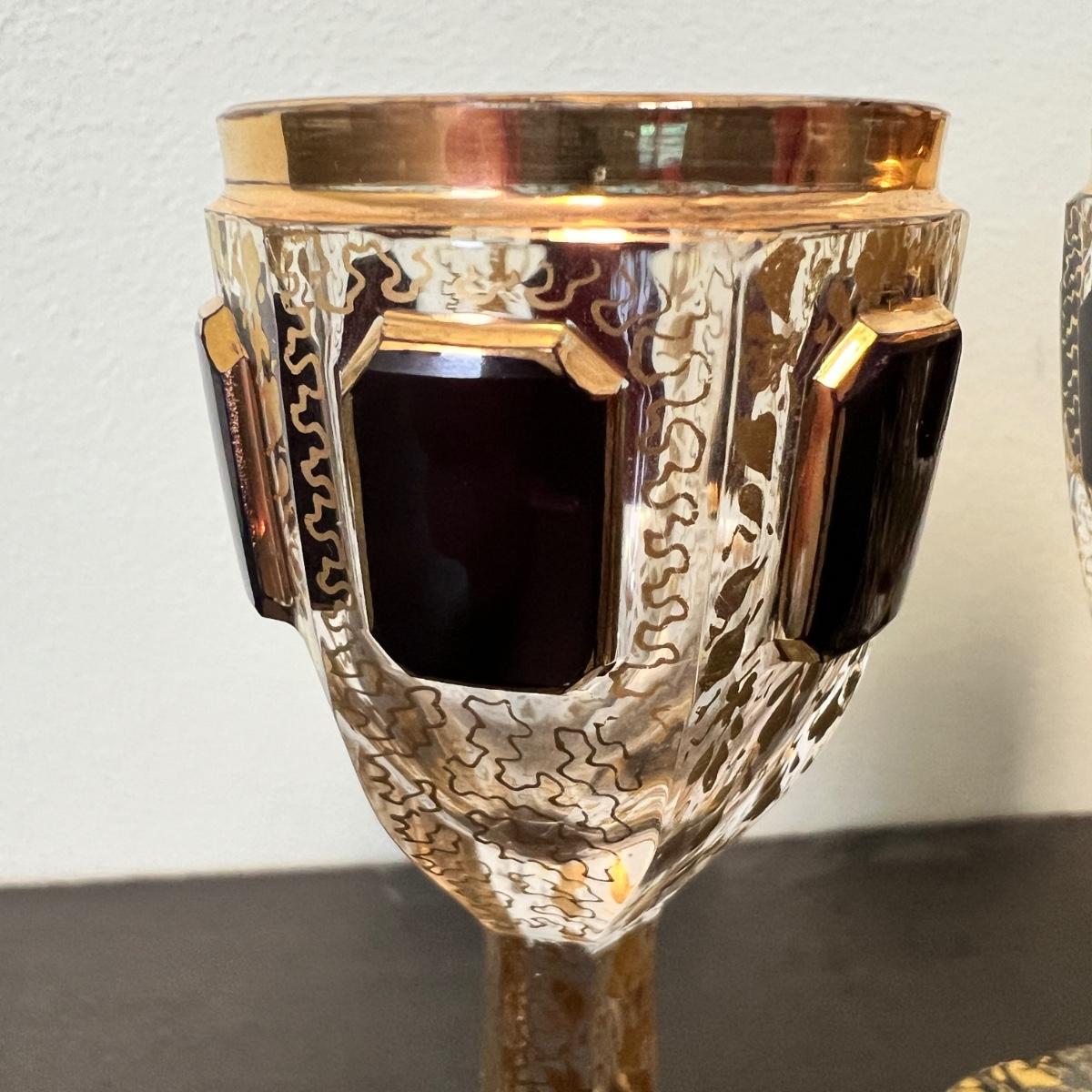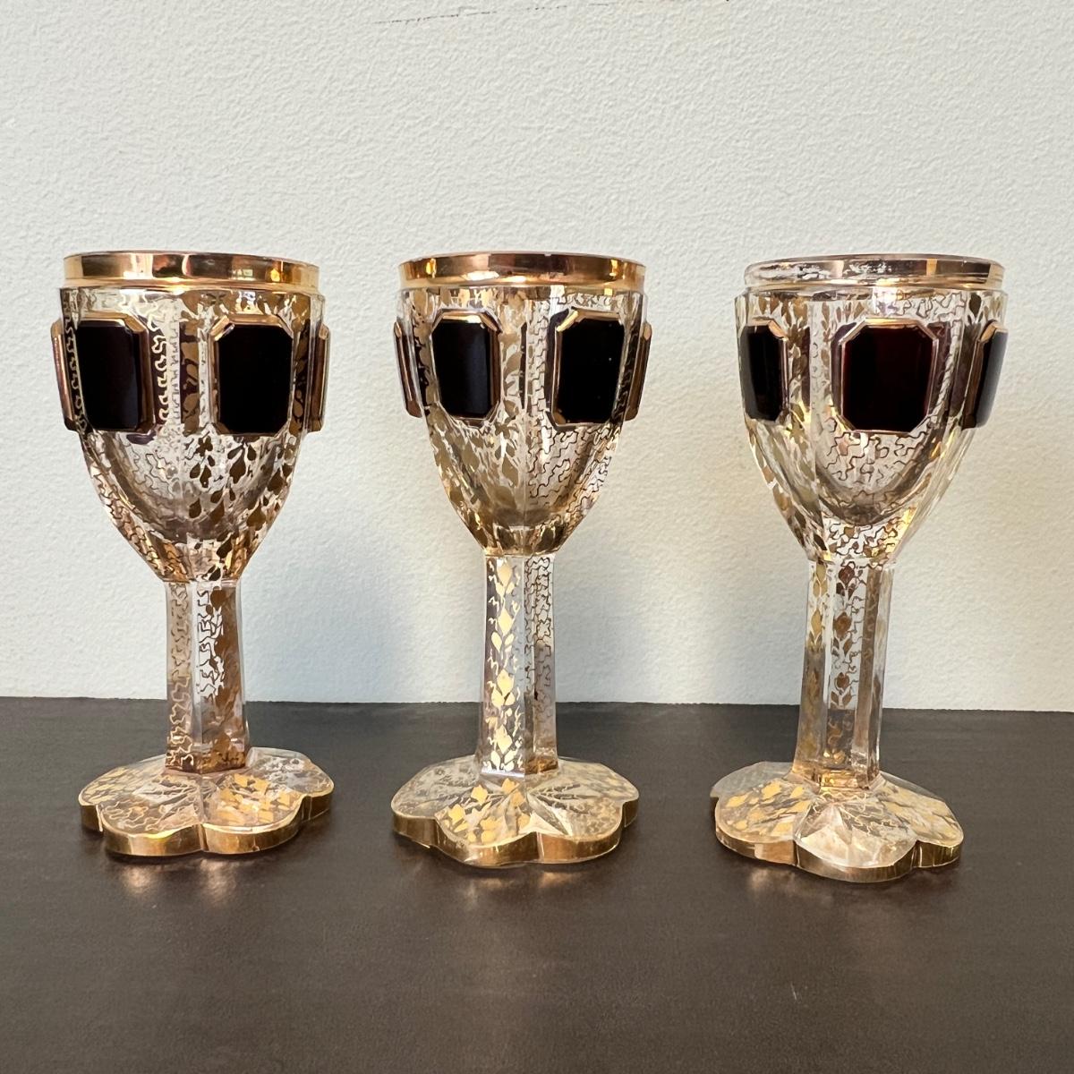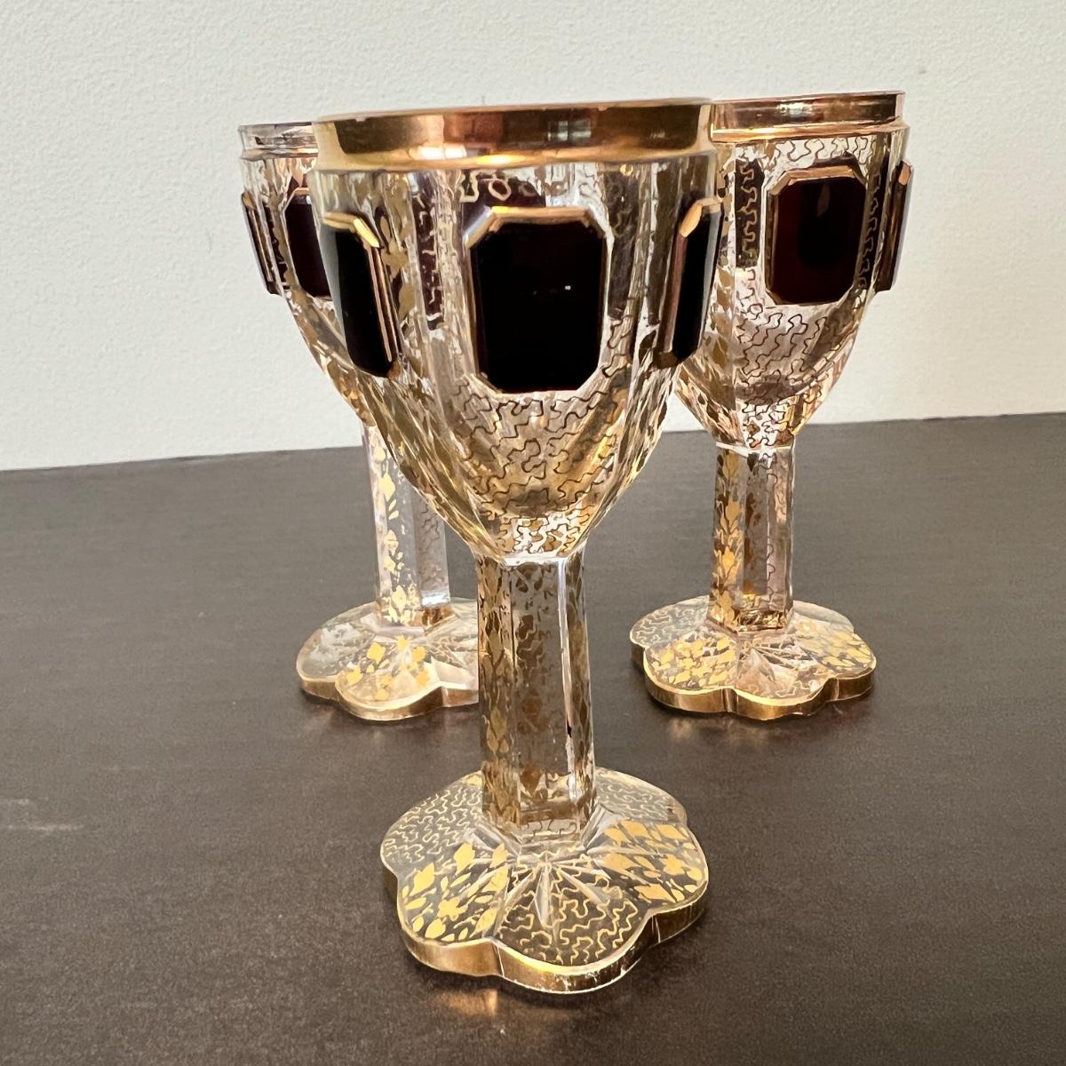 Lot of 3 antique believed to possibly be Moser Bohemian Art Glass Cabochon goblets. These elegant small goblets display 6 panel ruby cabochons surrounded by gilt. The rims of the goblets are decorated with gilt as well.