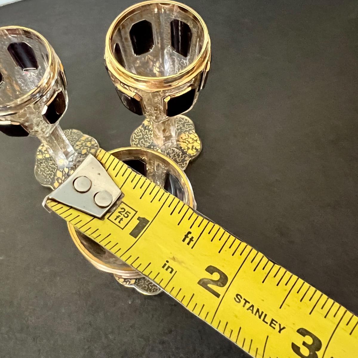 Each goblet is finely hand painted with gilt designs and stand just over 3.25 inches in height and are 1.5 inches across at the opening. In good condition. One has some of the gold rubbed off at the rim as shown in pics.