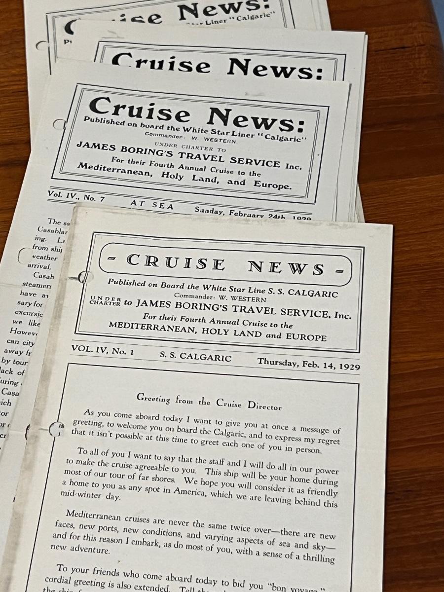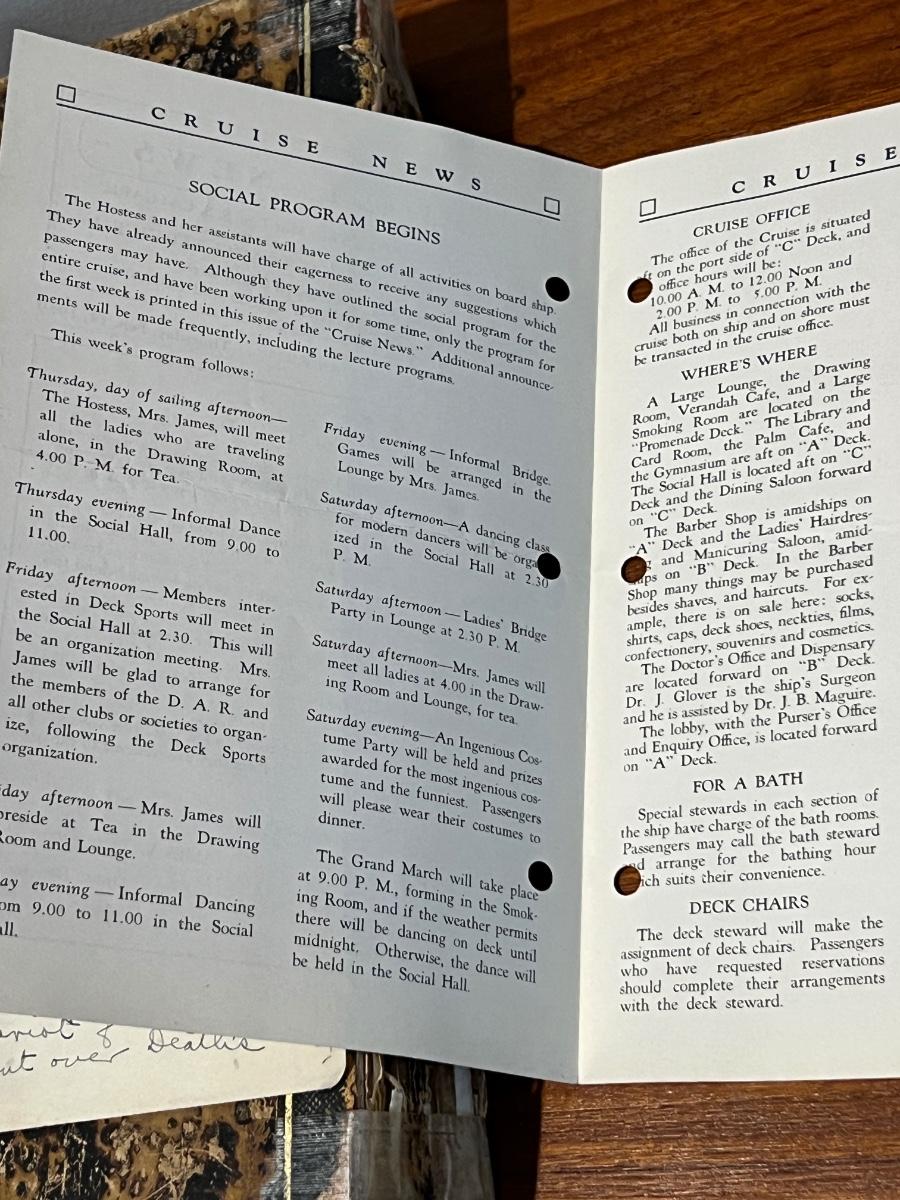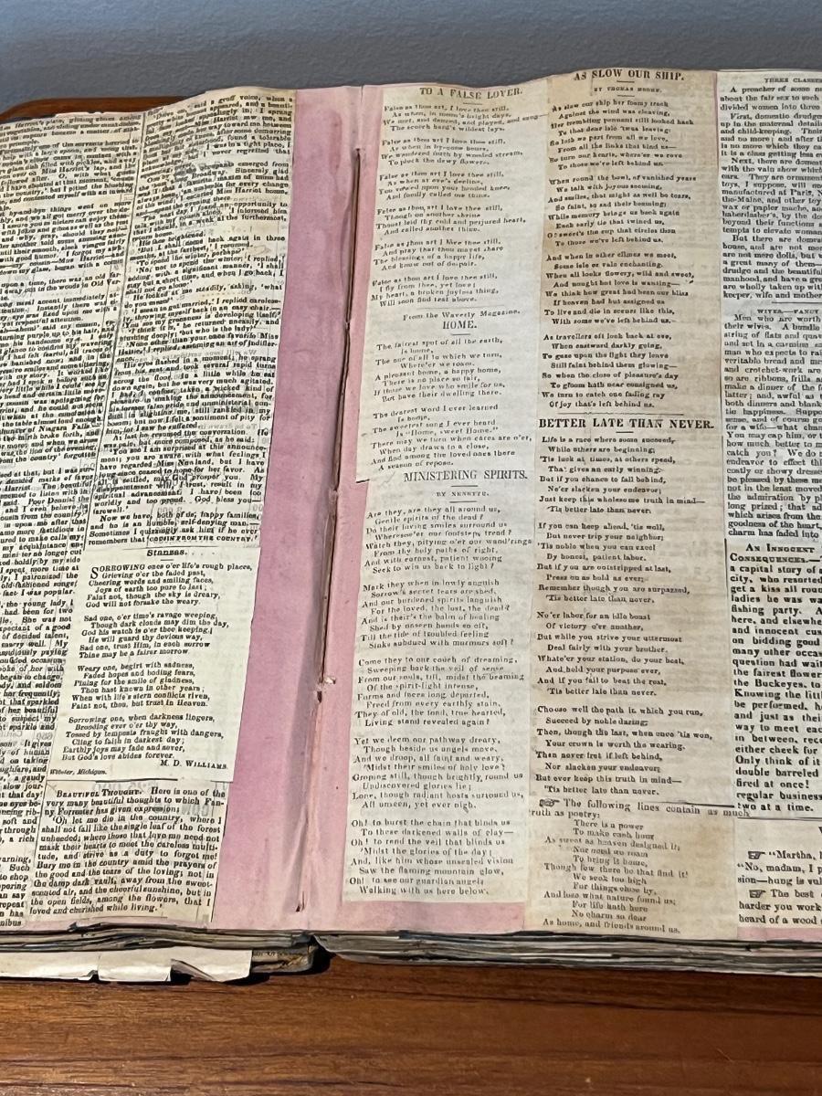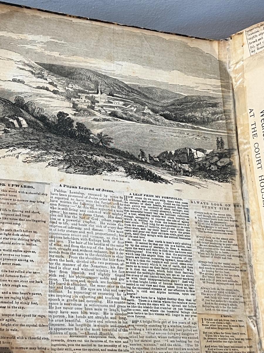 Very cool antique scrapbook bound with string. Most clippings are poems. The earliest date I found was 1859. There are also loose "Cruise News" newsletters from the White Star Line 1929.