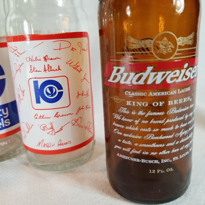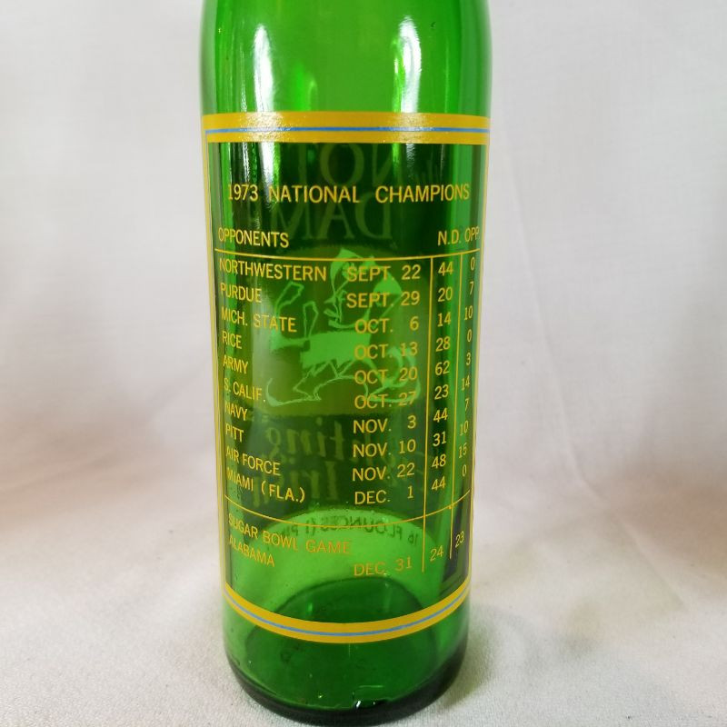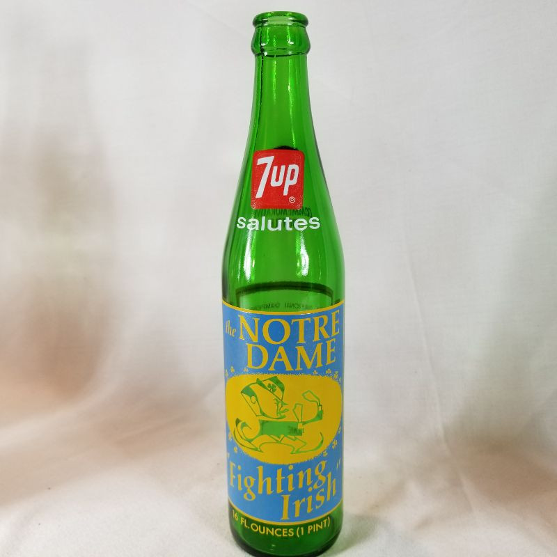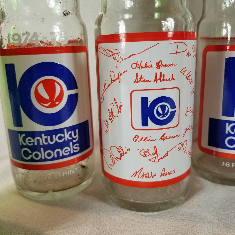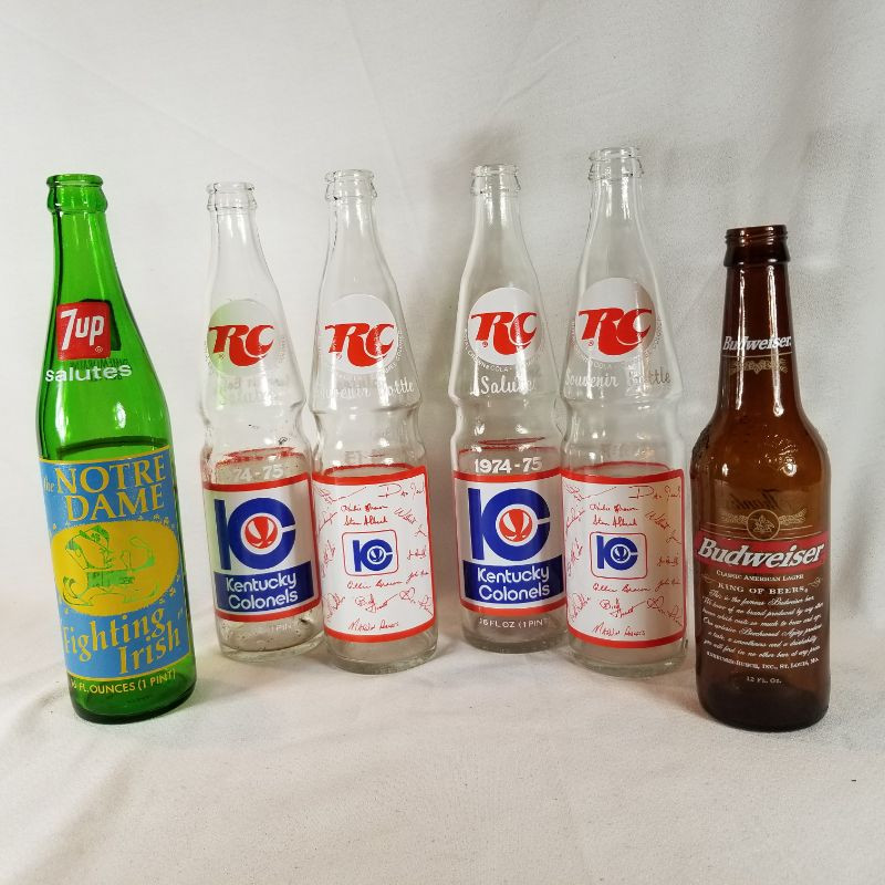 A group of 6 commemorative empty bottles. The first is a 7-Up bottle saluting the Notre Dame "Fighting Irish", the next 4 are RC Kentucky Colonels bottles with signatures of the players printed on back and the last is a Special Budweiser bottle "King of Beers". All are in very good condition, no chipping on glass or lettering. It would be a nice collection for the "Man Cave" or bar.