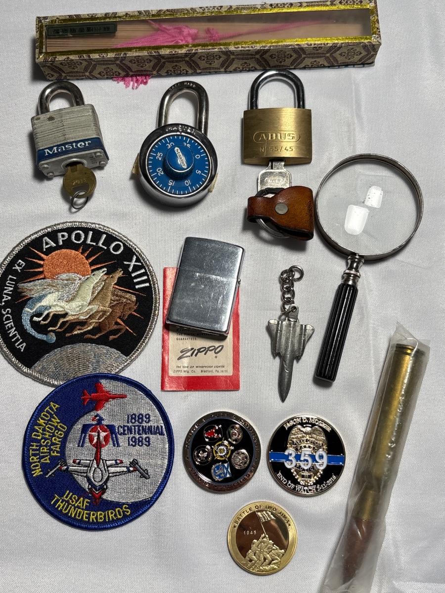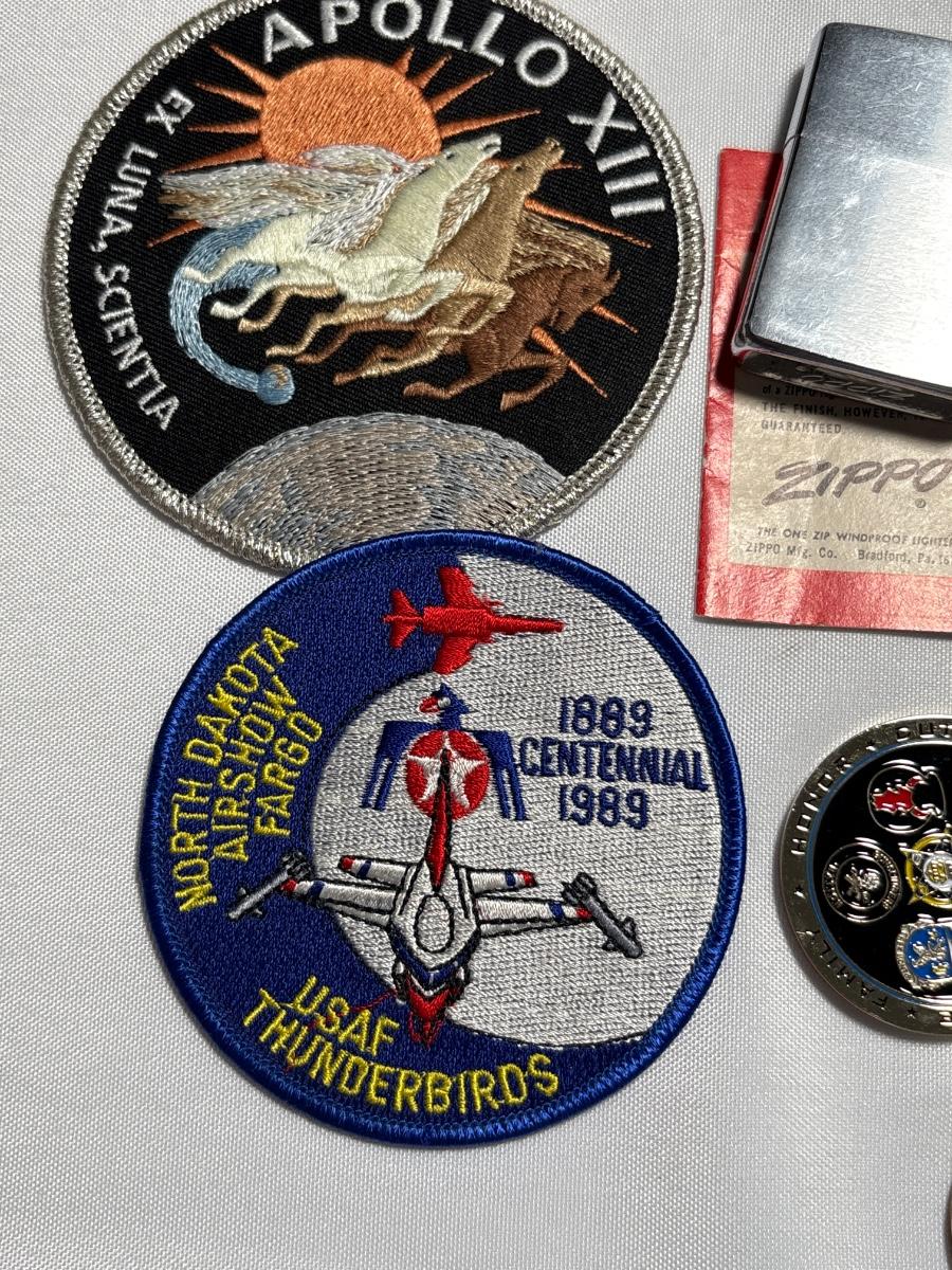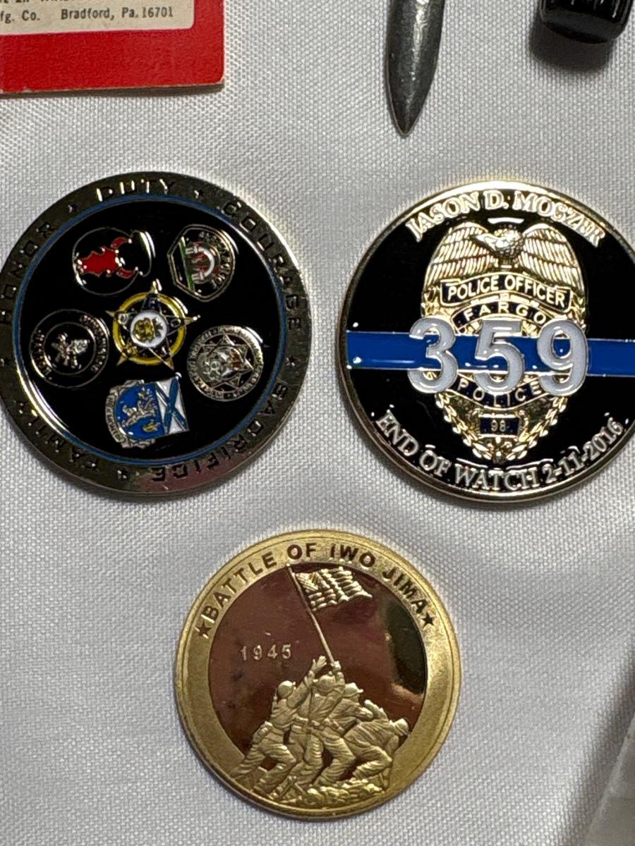 Commemorative Jason Moszer coins and patches, lighter, bullet, and more