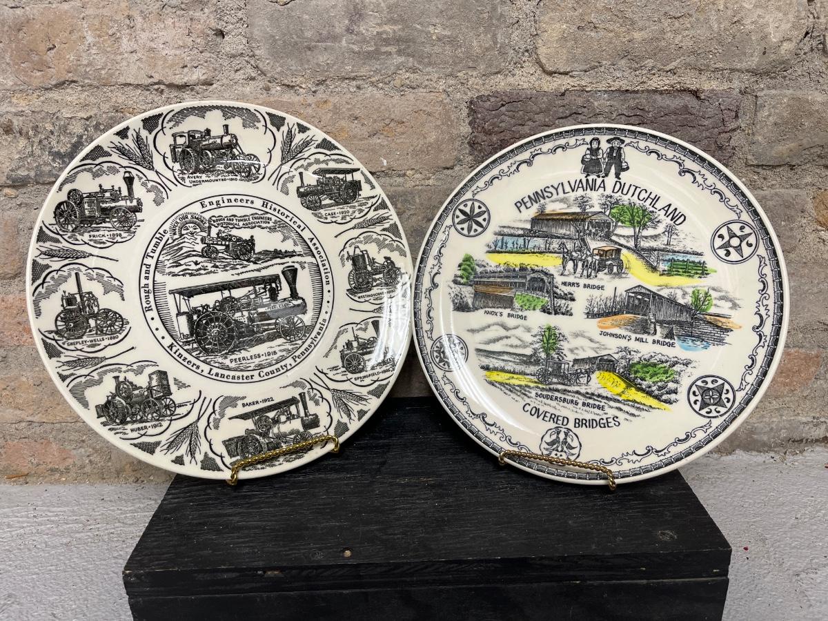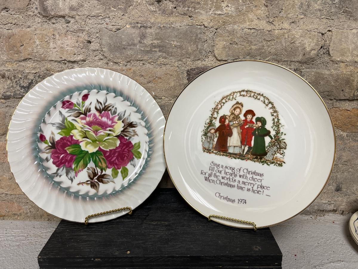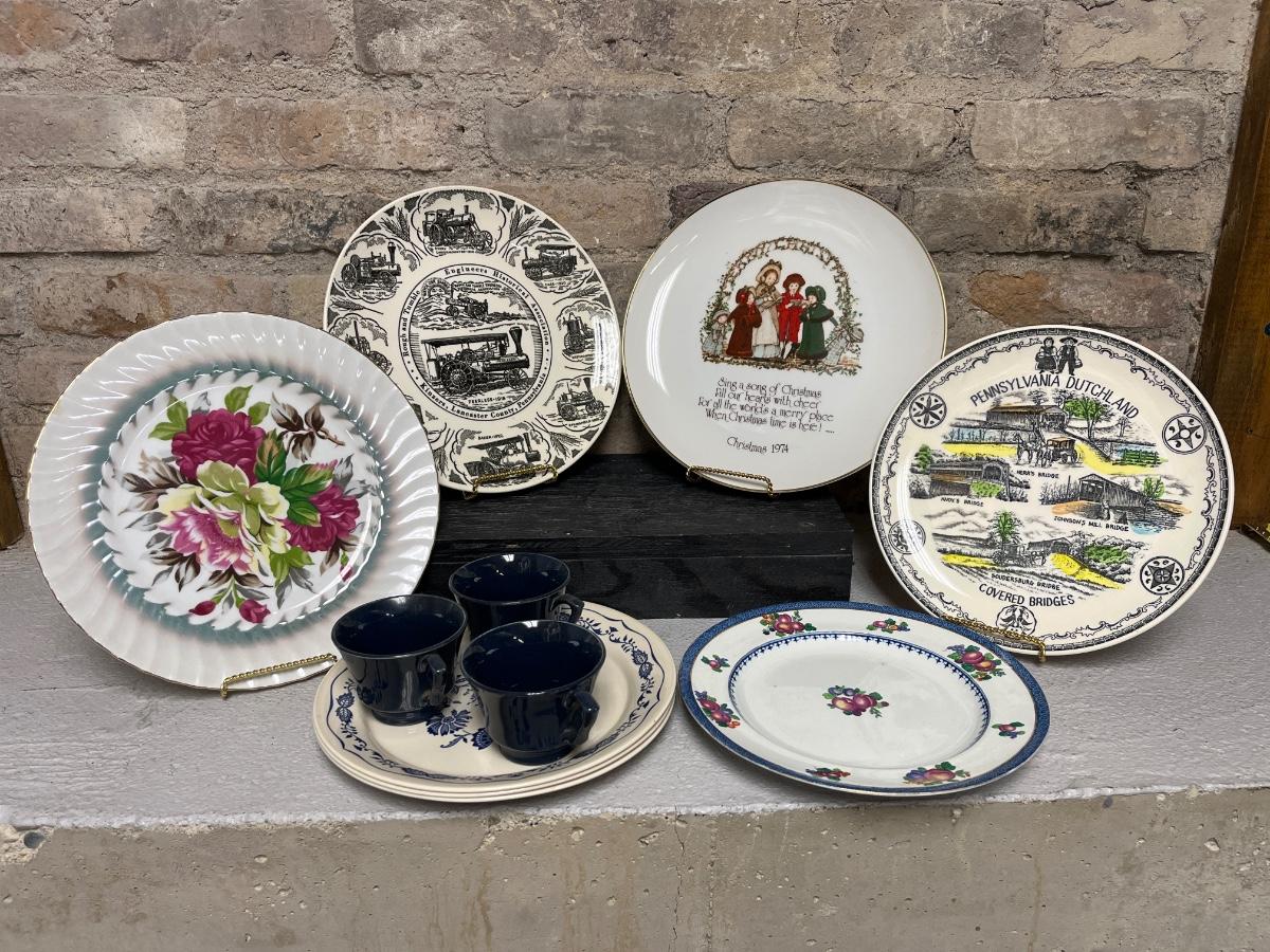 Pennsylvania Dutch country commemorative plates, beautiful ArtMark Japan floral plate, Holly Hobbie Christmas plate, Boths plates made in England and numbered, Corelle blue floral plates with coffee cups that may or may not match