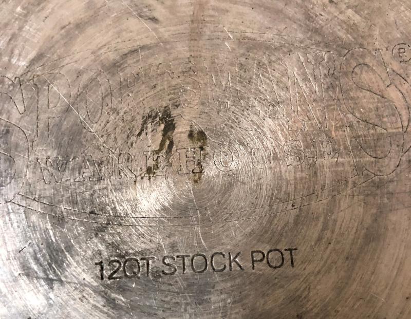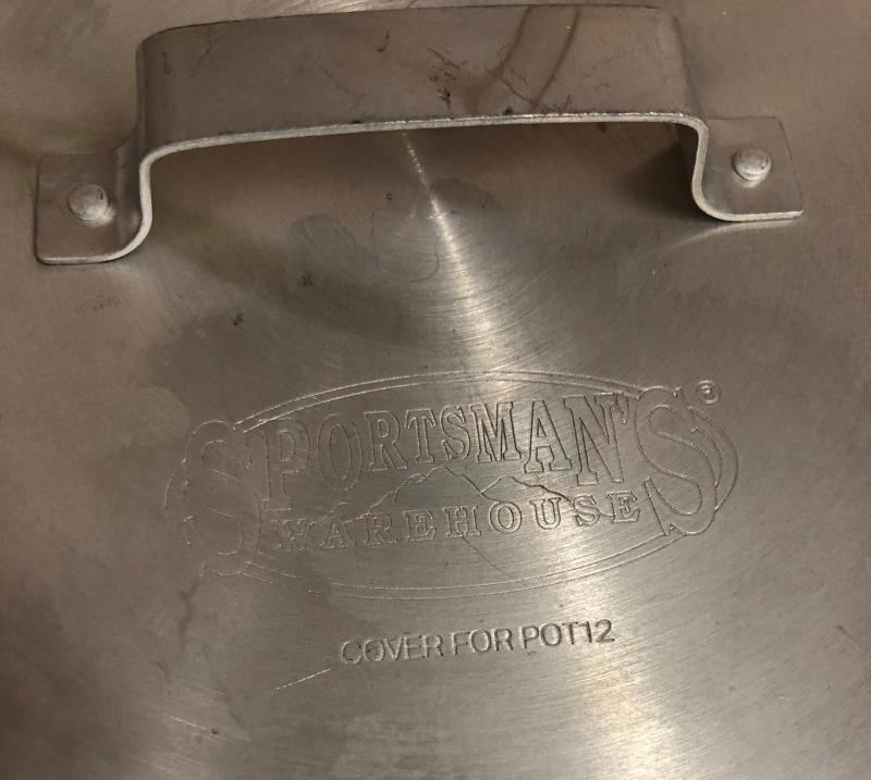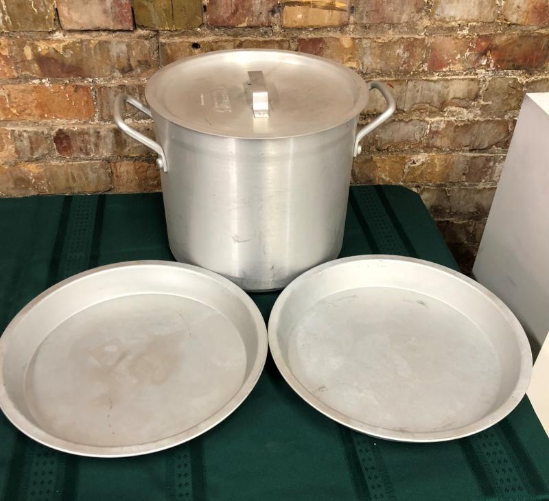 Good used condition on this commercial grade aluminum cookware...A large stockpot with lid from the Sportsman's Warehouse and a pair of 12" Daddio's pie plates...