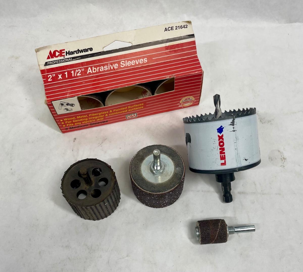1/2" Reversing heavy-duty drill, Model 513. From S.S. Kersage / K-Mart. Tested, runs strong. Also includes 3 medium sanding sleeves (2" x 1-1'2"), new in box; Lenox 2-3/4" hole saw; 2 sanding arbors, and a drum-style rasp file.