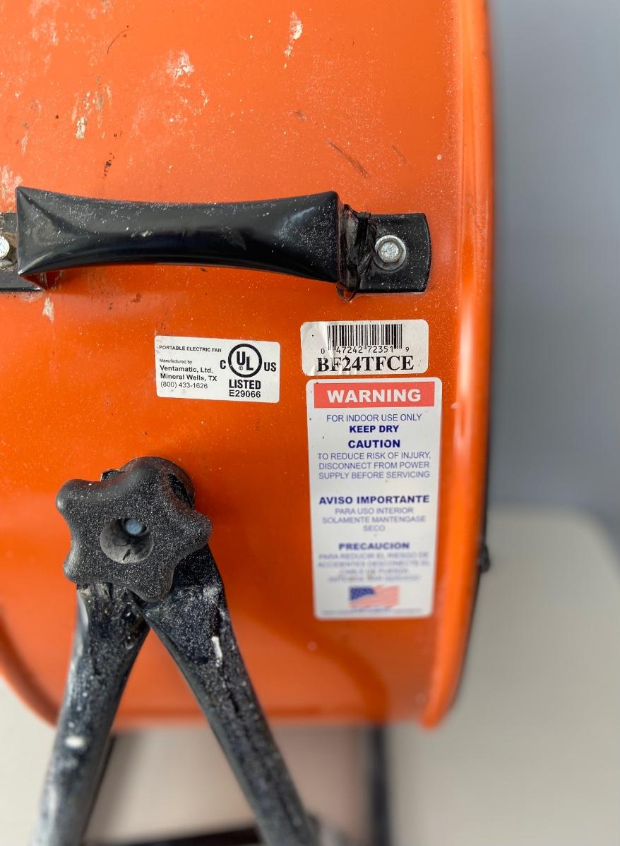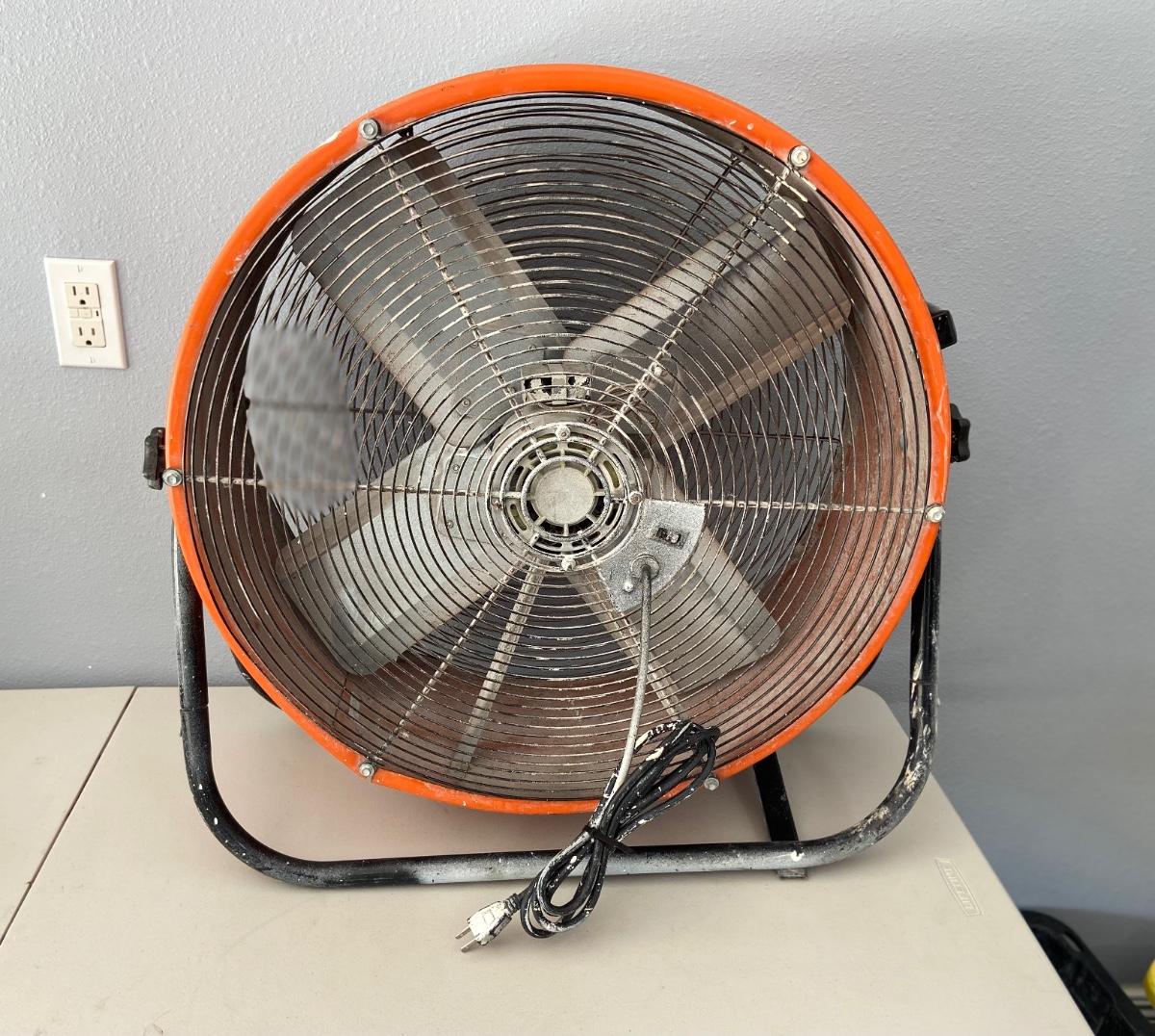 Fan in good used fully functional condition with some paint over-spray present. Wheels for fan found after pictures were taken for this listing and are also included. Pictures part of item description and should be viewed prior to bidding.