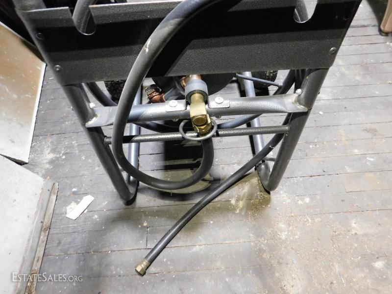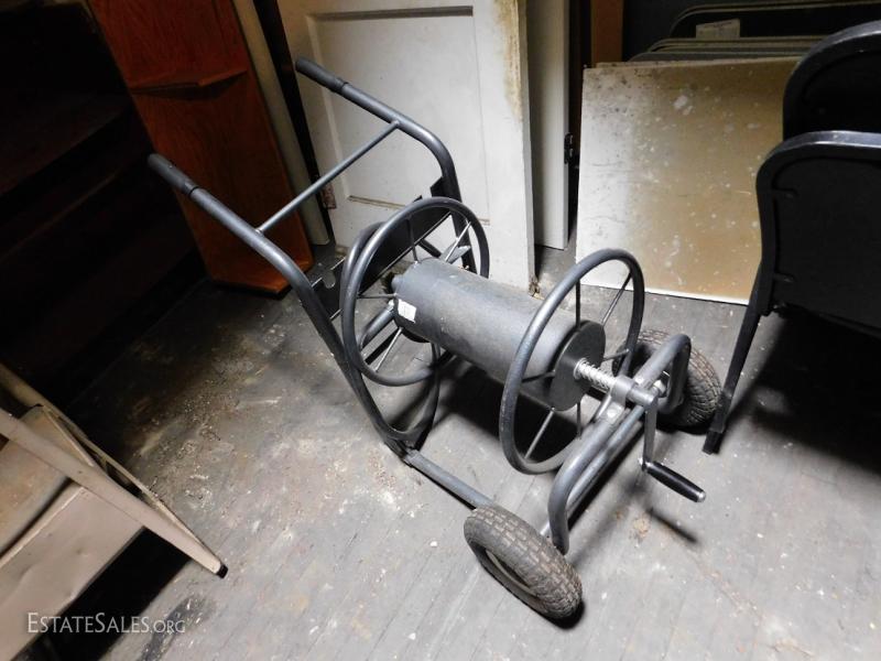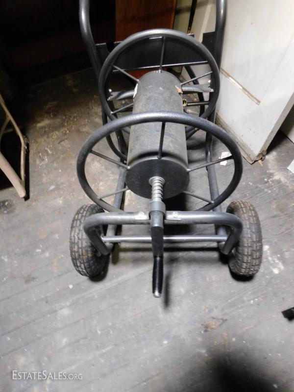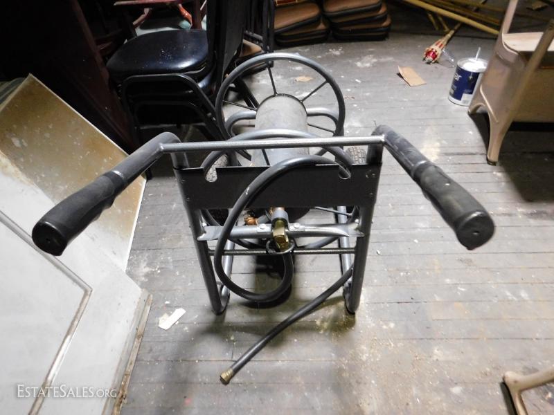 Commercial Hose Reel with Brass Fittings and pneumatic tires. Seems to be in good condition and heavy duty.