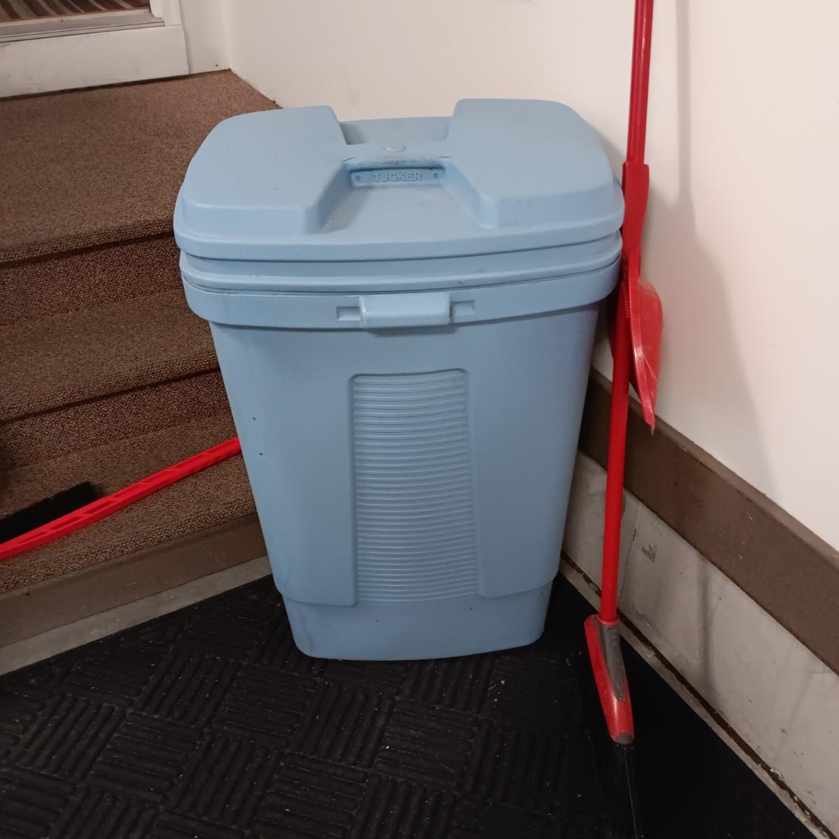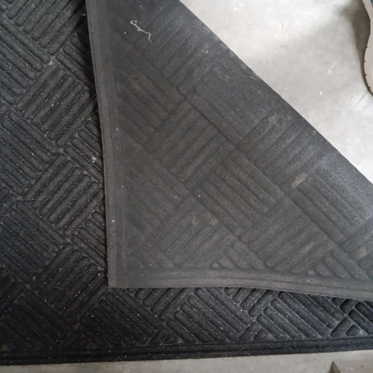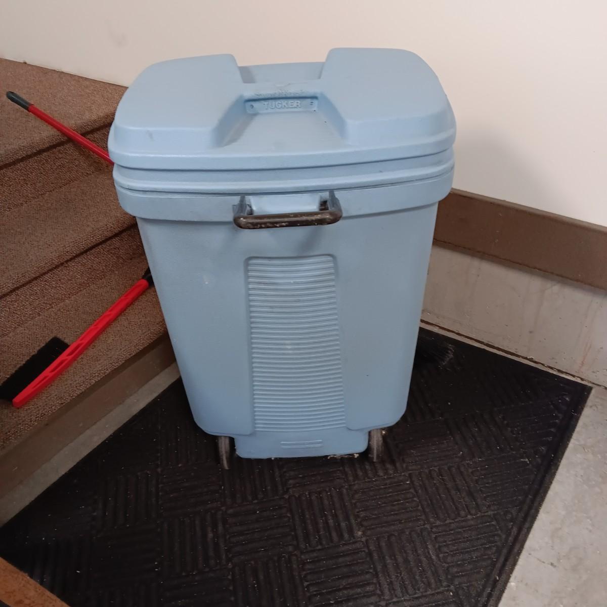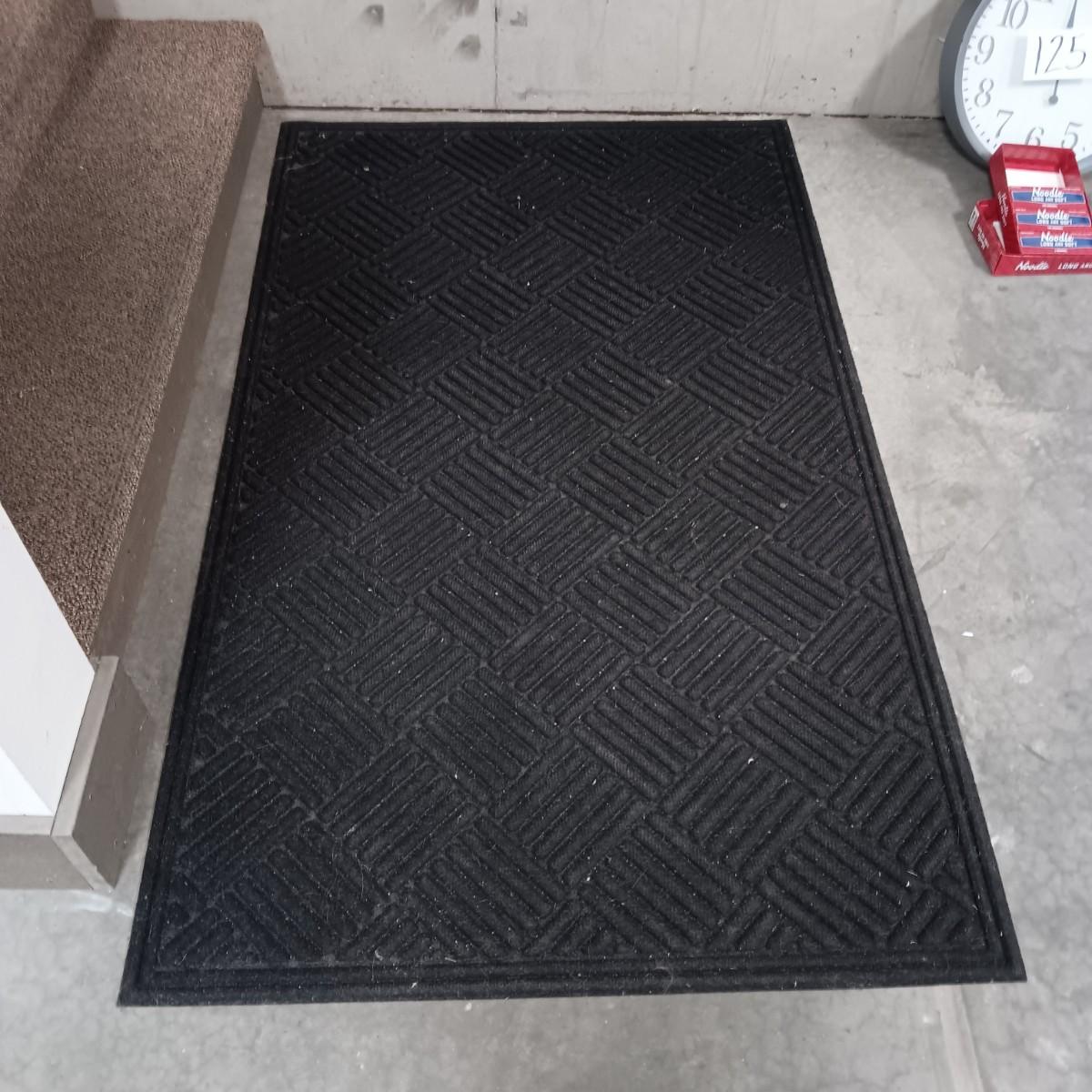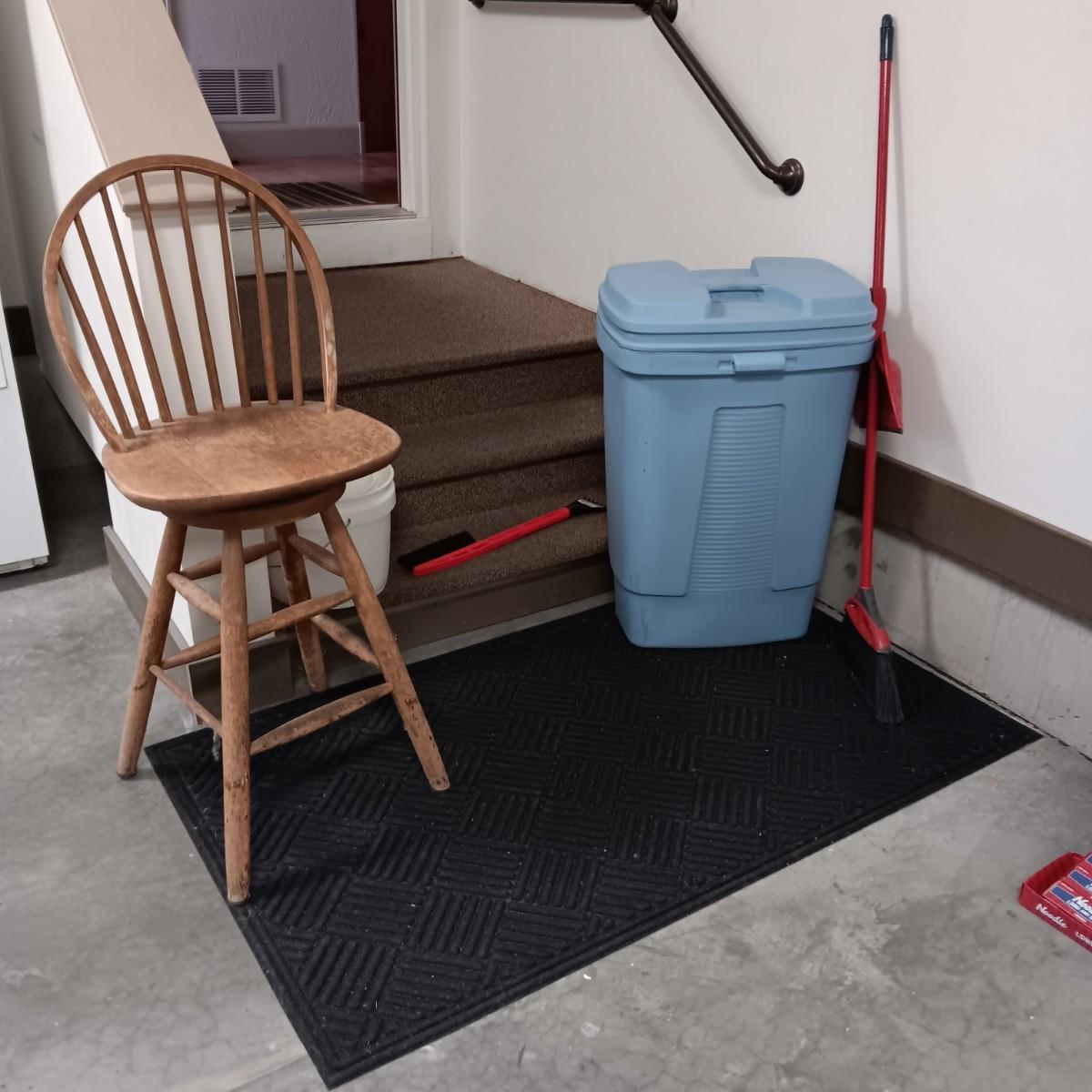COMMERCIAL RUBBER BACK RUG, TRASH CAN ON WHEELS, SWIVEL BAR STOOL AND MORE