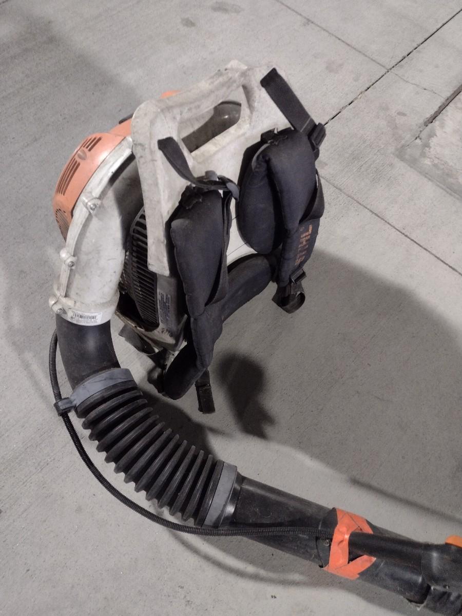 Commercial Stihl BR 600 Gas Powered Professional Backpack Blower (#25). Owner states that item was working at time of retirement. Being sold as is condition. Untested as time of photos.