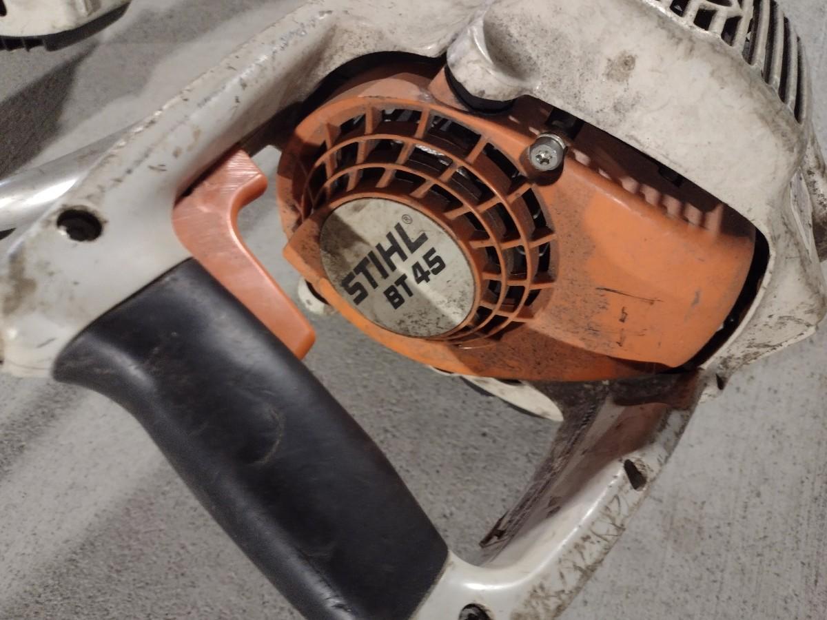 Commercial Stihl BT45 Gas Powered Wood Boring Auger Tool (#5). Owner states that item was working at time of retirement. Being sold as is condition. Untested as time of photos.