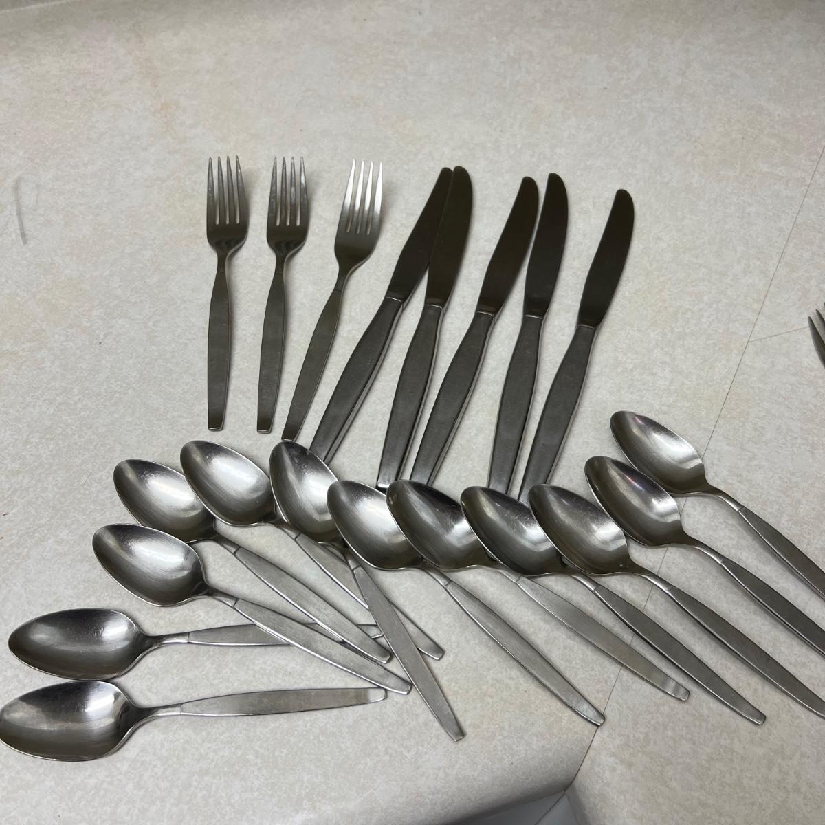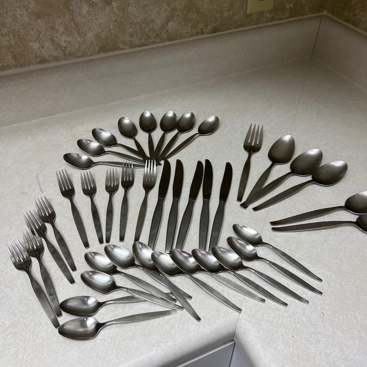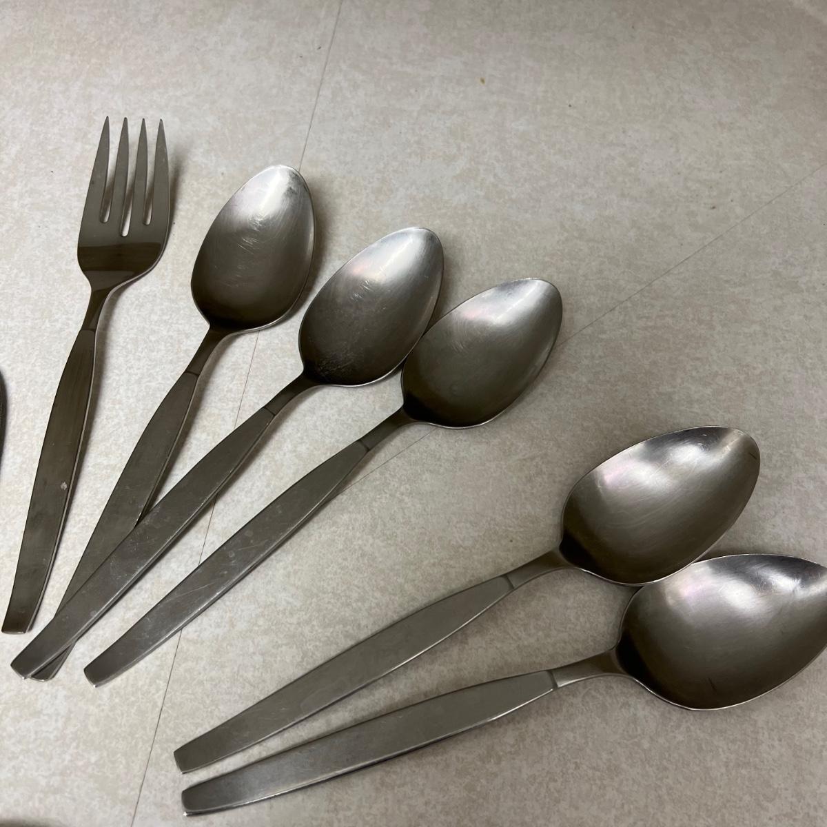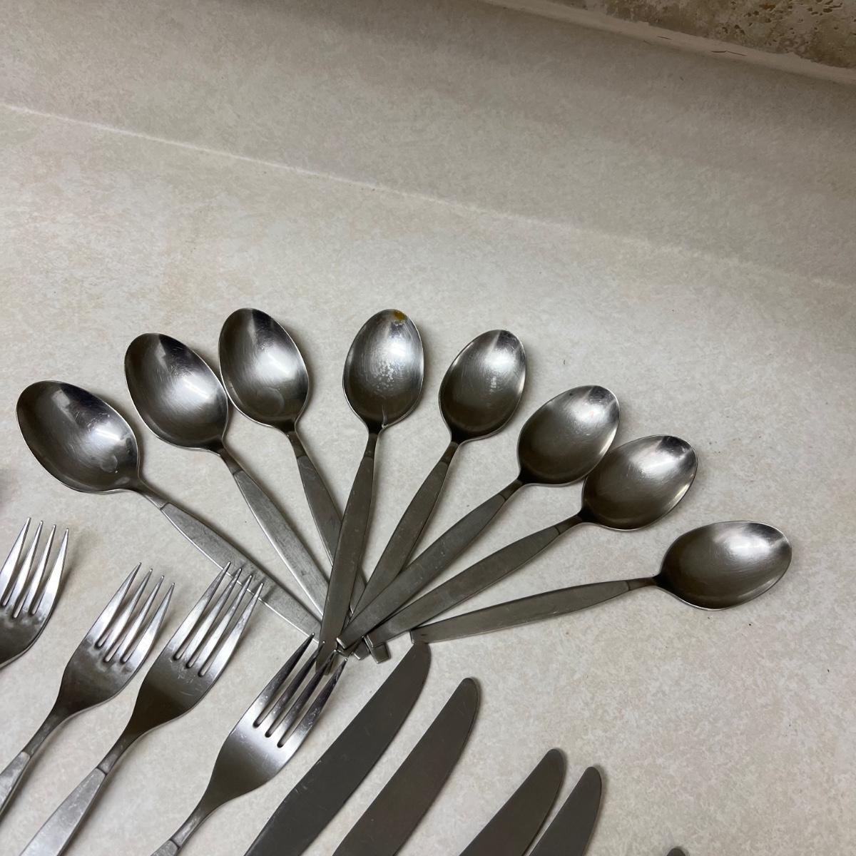 This Community flatware set has a 5 person plus setting (with exception of larger forks, there are only three). See images for pieces included. Green plastic holder is included.