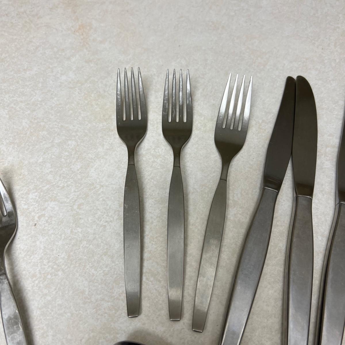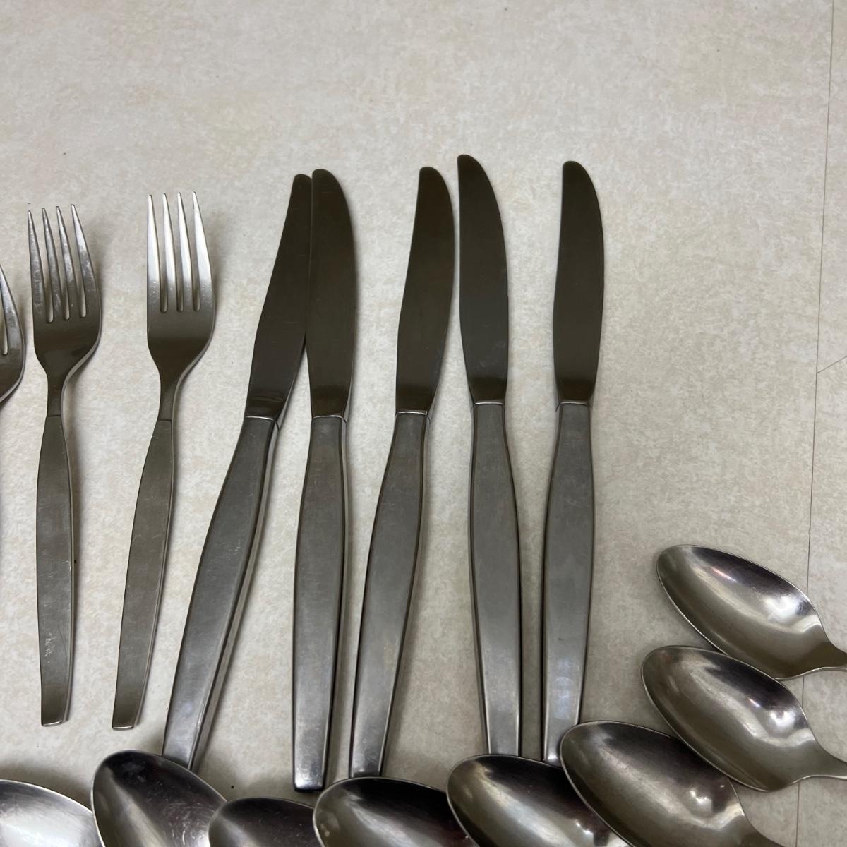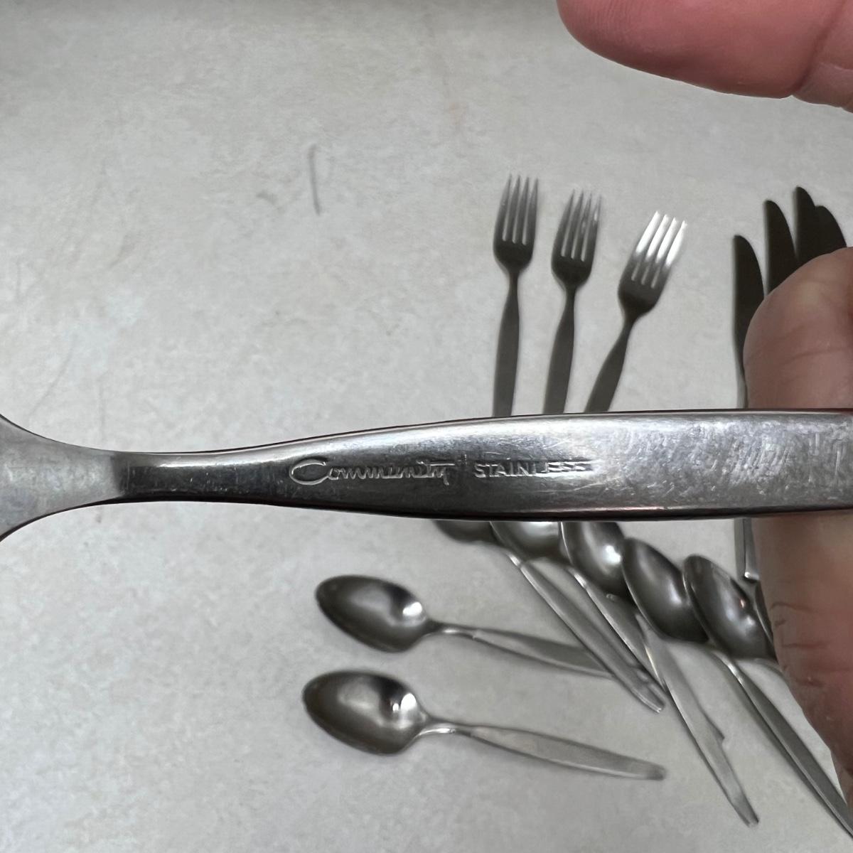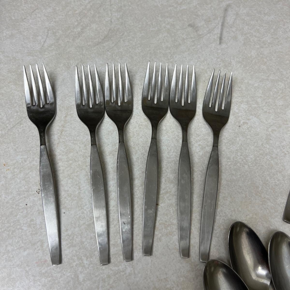 This Community flatware set has a 5 person plus setting (with exception of larger forks, there are only three). See images for pieces included. Green plastic holder is included.