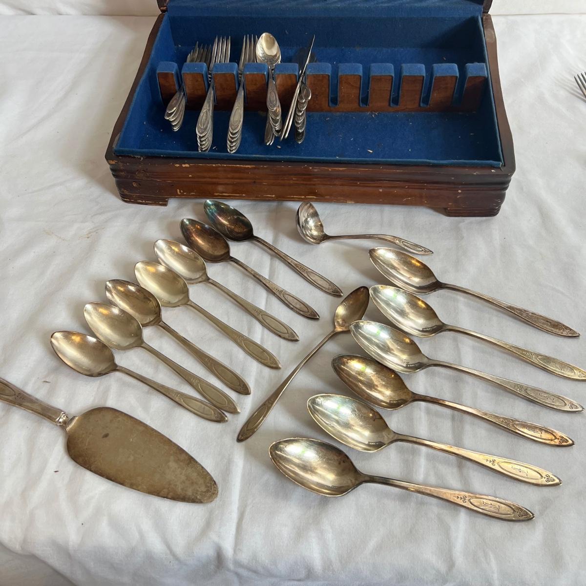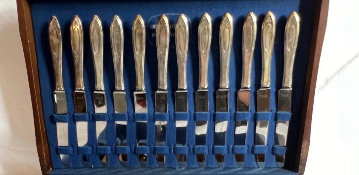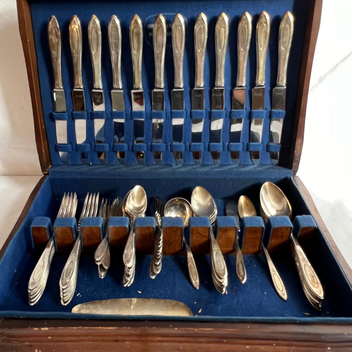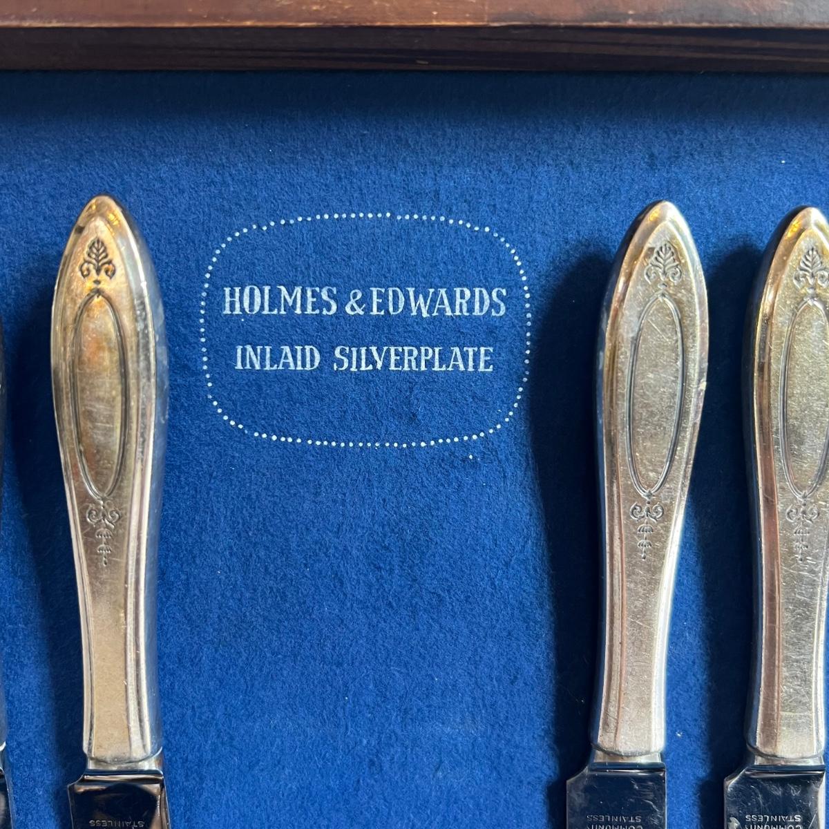 Holmes & Edwards felt lined wooden box is included, it measures 16” x 11” x 4”H.