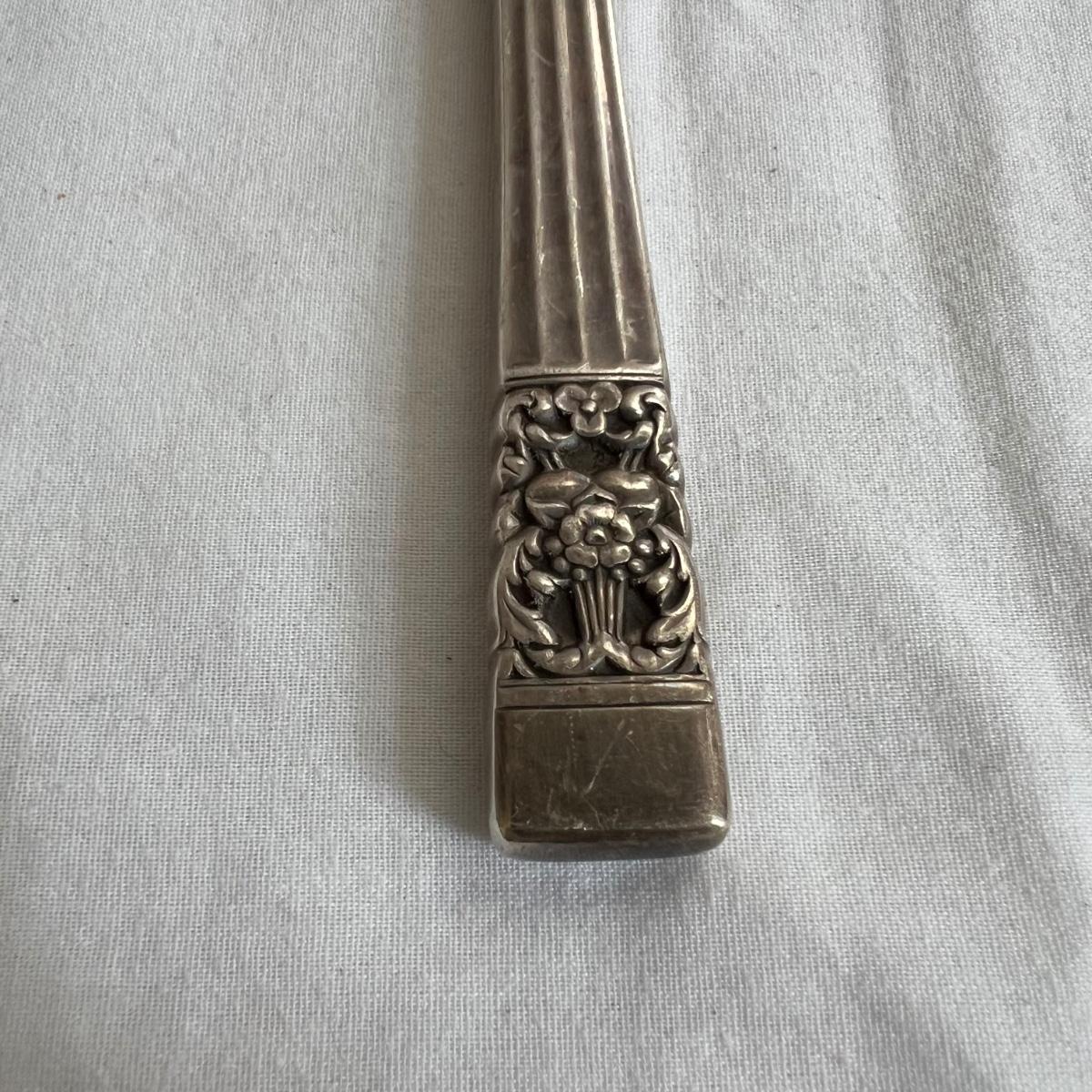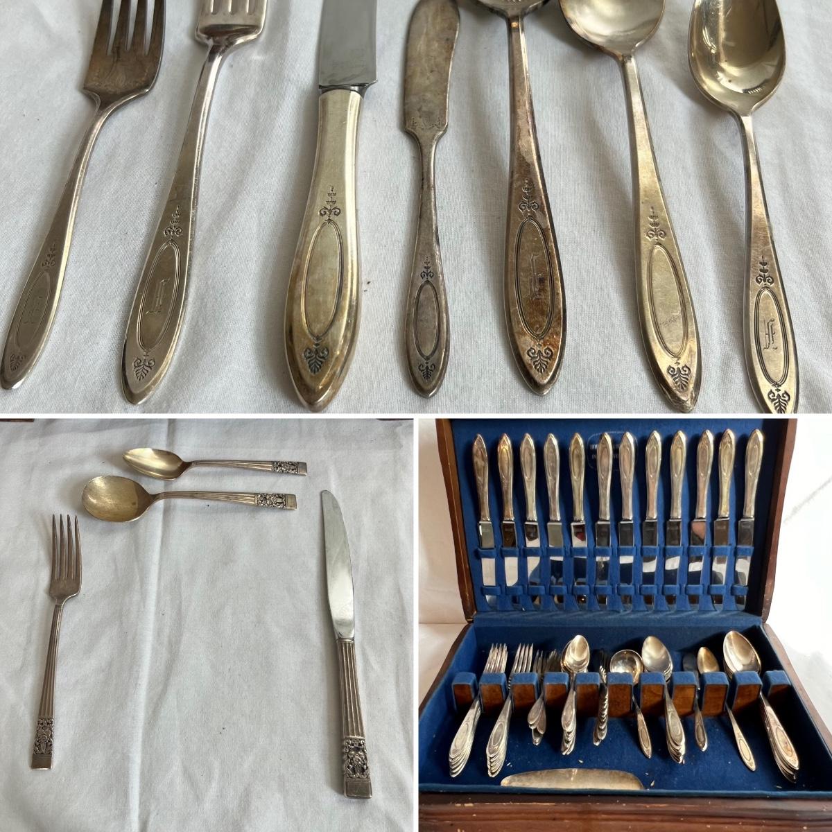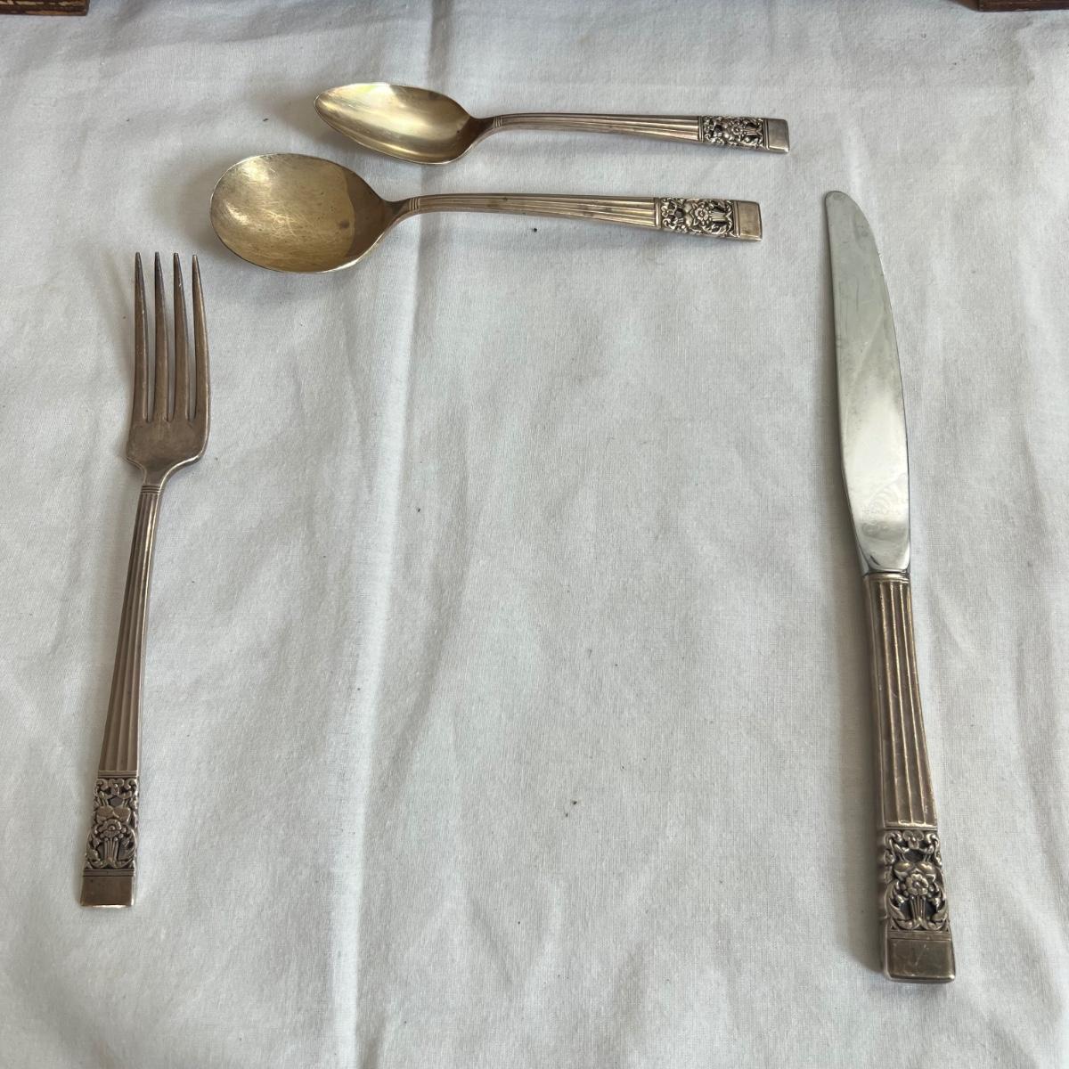 Community plate in the ‘Adam’ pattern can offer a setting for at least six people as it includes 12 each for knives and forks but only 6-8 each for spoons, bread knives etc, see images for quantities. 'The Coronation' pattern is a floral design. There are just five forks and teaspoons but larger quantities of knives and soup spoons, see images.