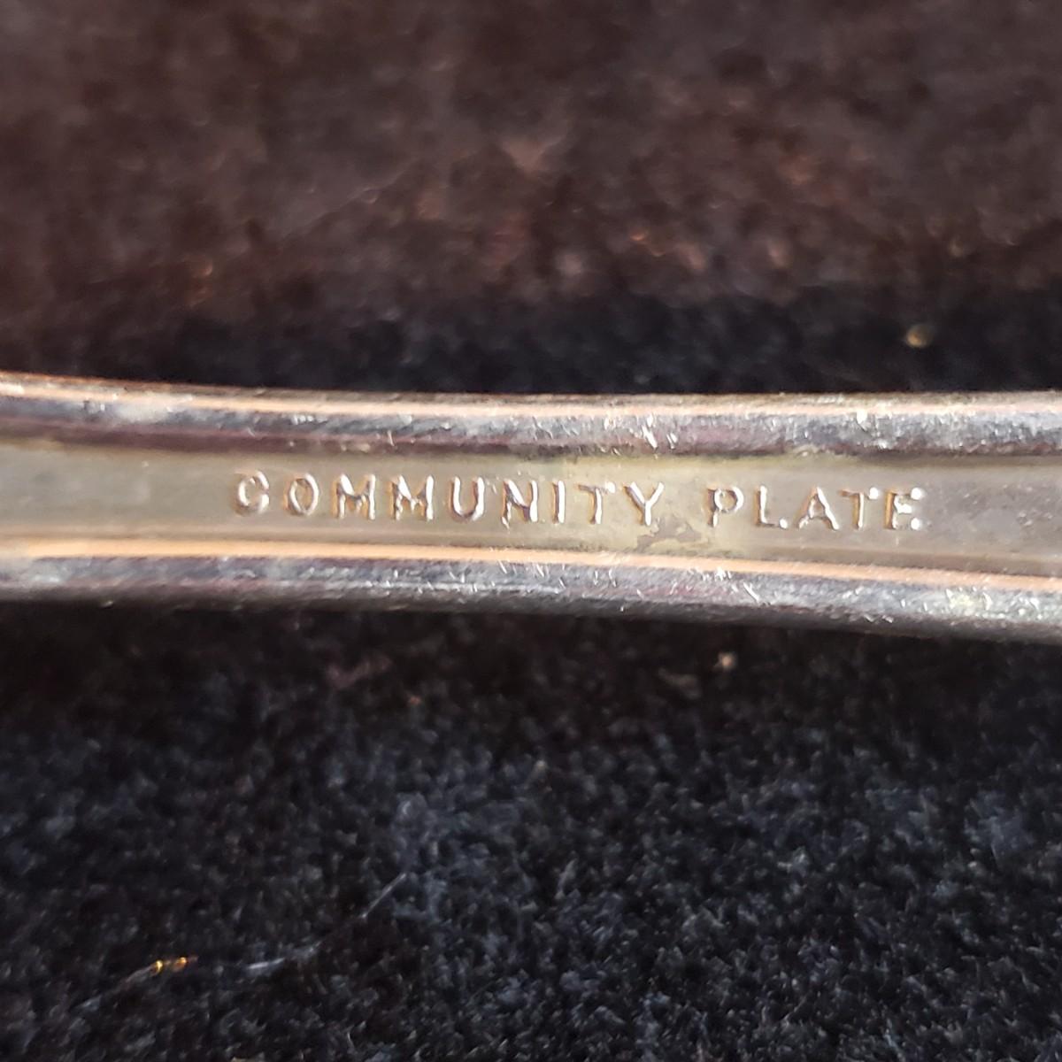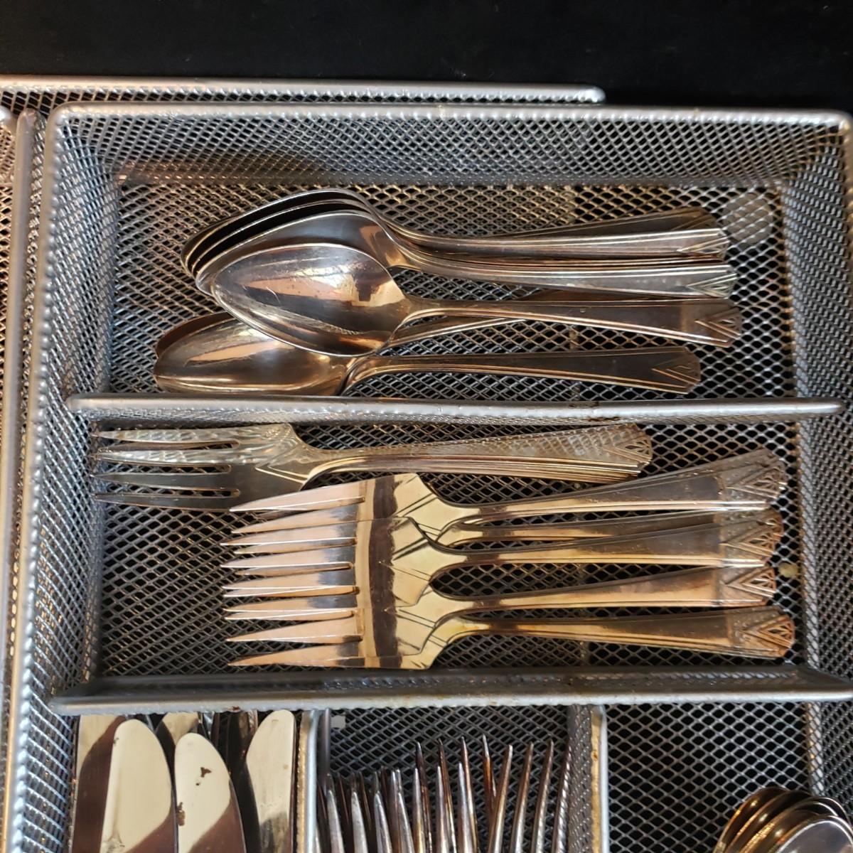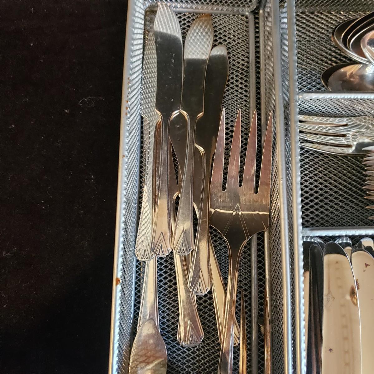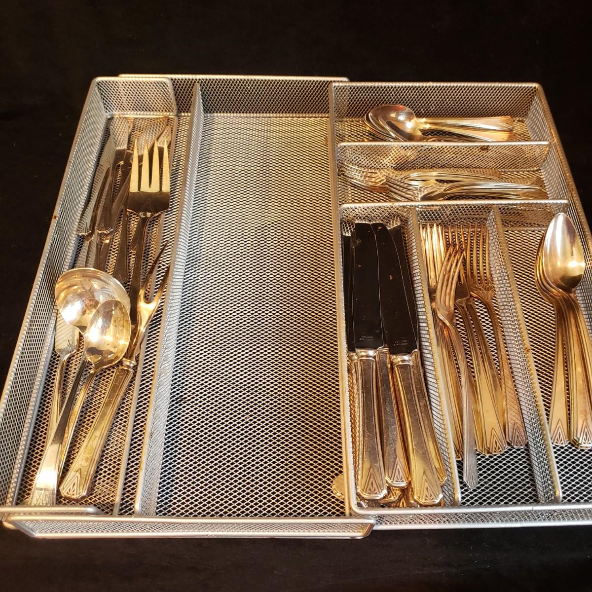 The set appears to be Community Plate’s Deauville pattern silverware. The set includes: 13 knives, 8 dinner forks, 10 salad forks, 7 tablespoons, 9 teaspoons, serving utensils and 8 butter knives. Set comes in a mesh silver metal organizer. The organizer can expand and has magnets to hold in place.