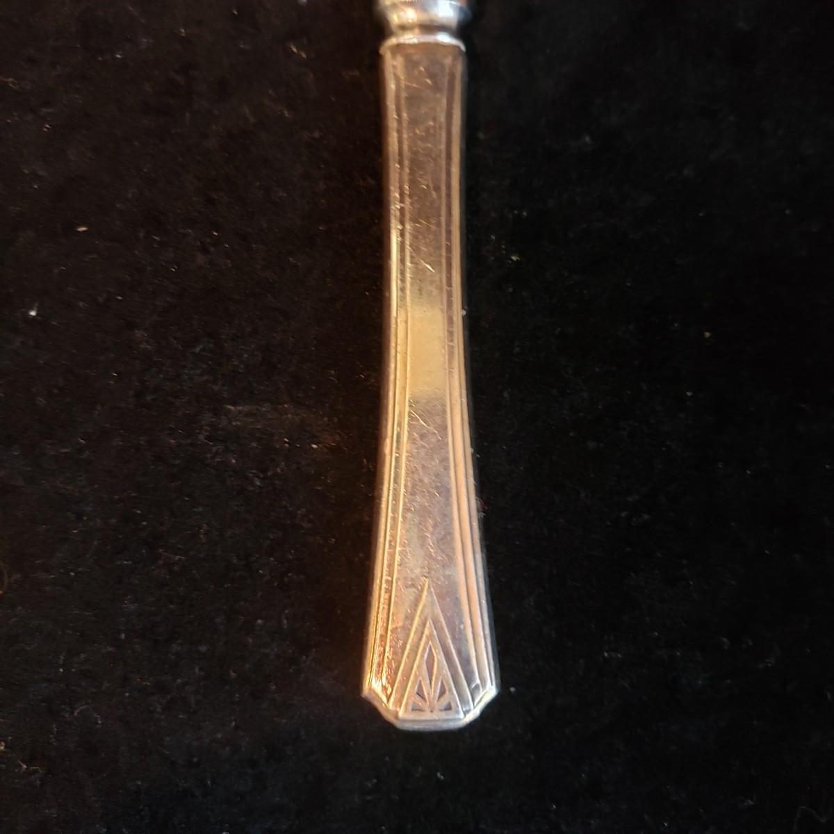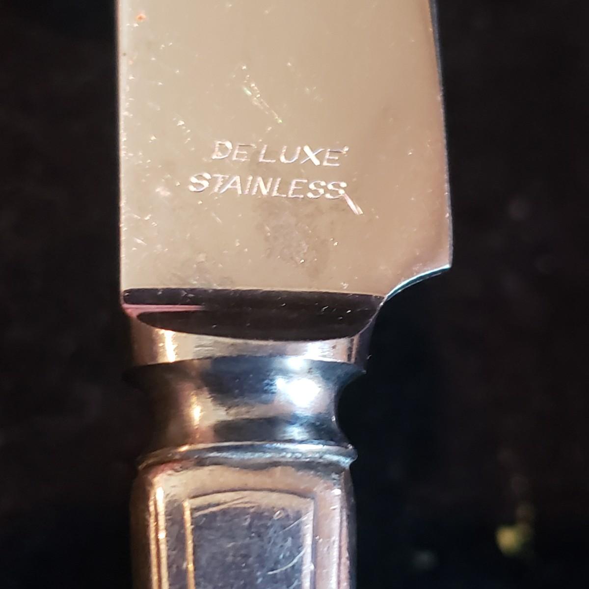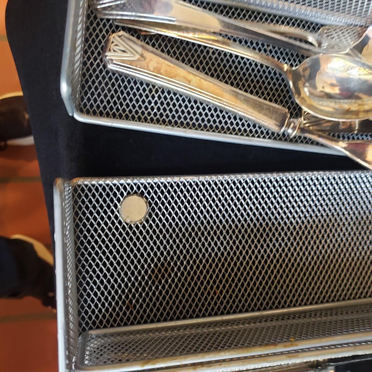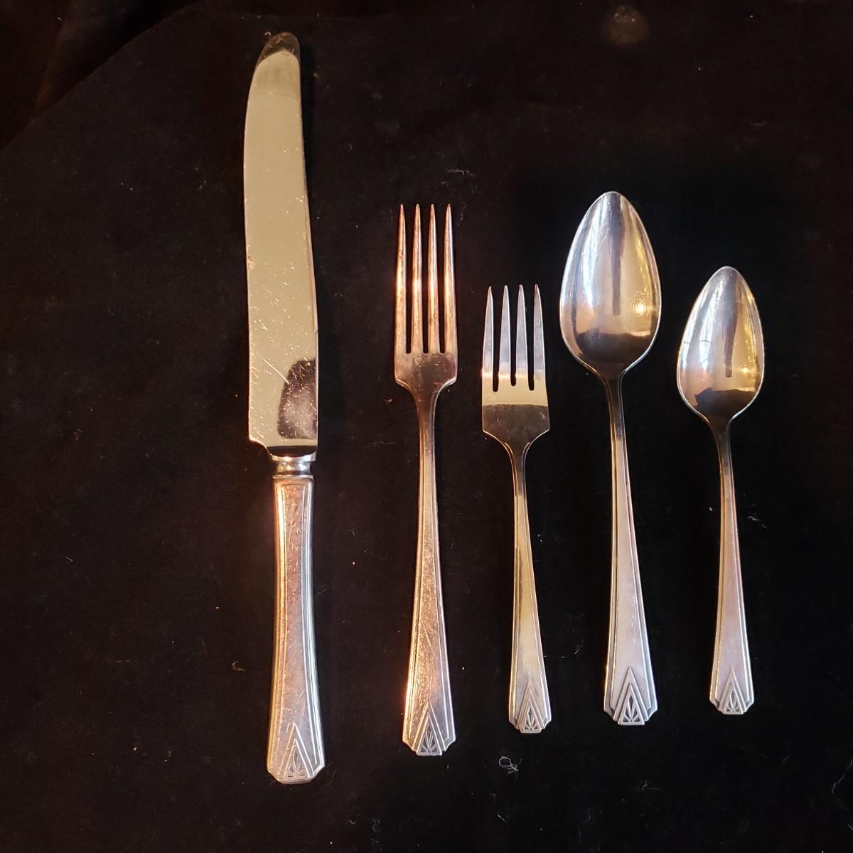 The set appears to be Community Plate’s Deauville pattern silverware. The set includes: 13 knives, 8 dinner forks, 10 salad forks, 7 tablespoons, 9 teaspoons, serving utensils and 8 butter knives. Set comes in a mesh silver metal organizer. The organizer can expand and has magnets to hold in place.