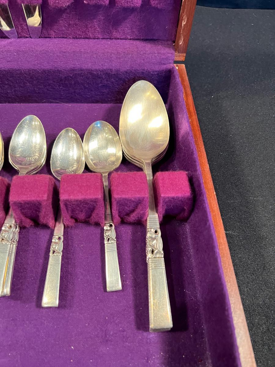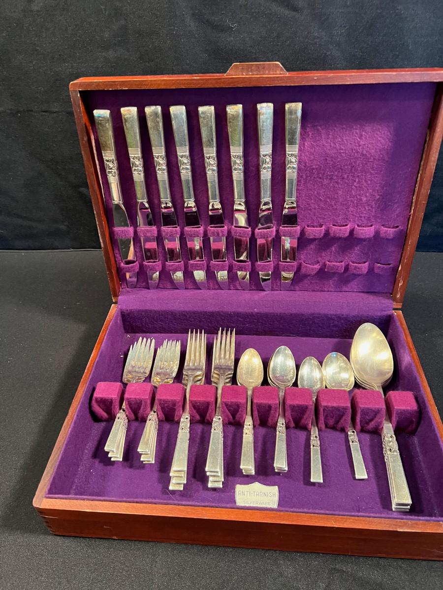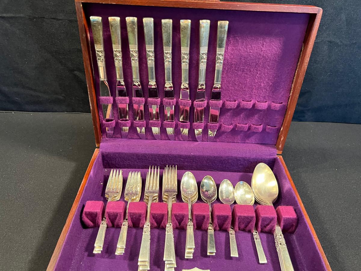 Appear mostly Complete 4 Piece Place Setting for 8 with some serving Spoons, silver plated.