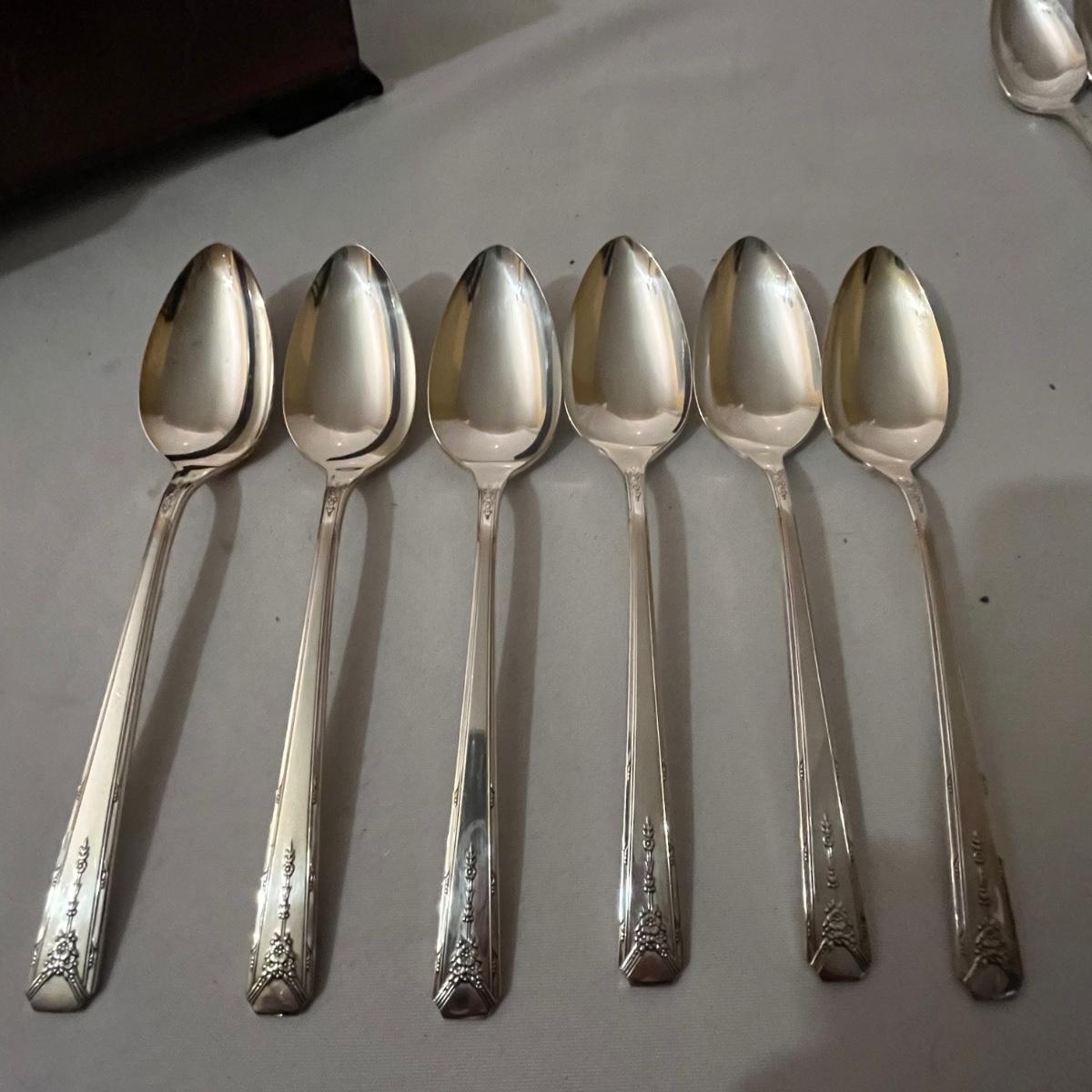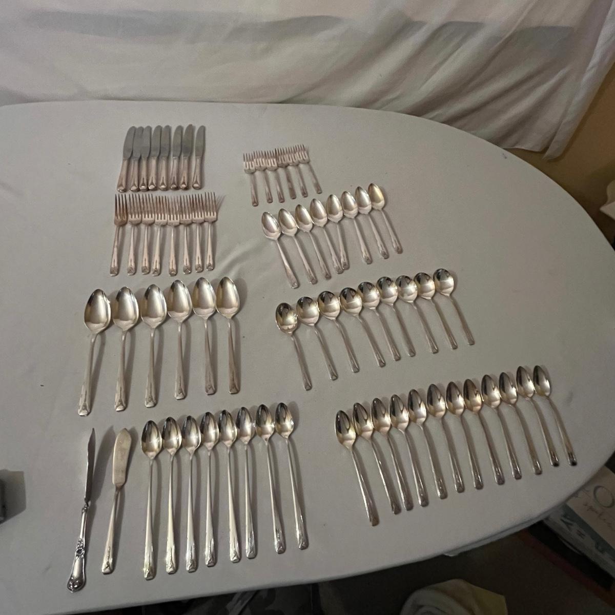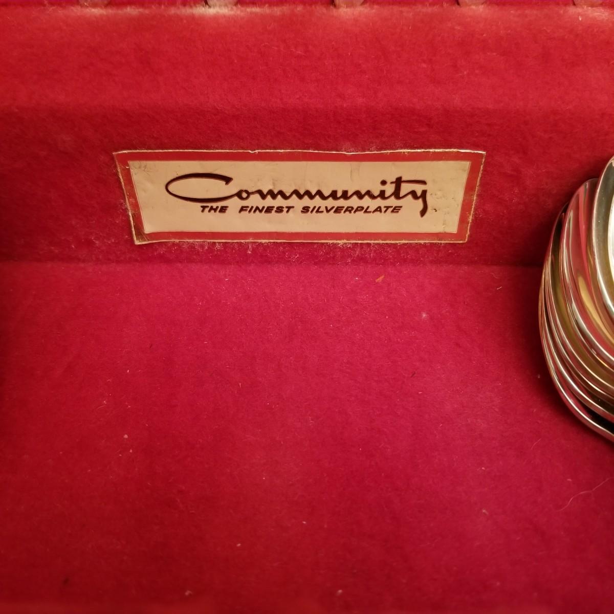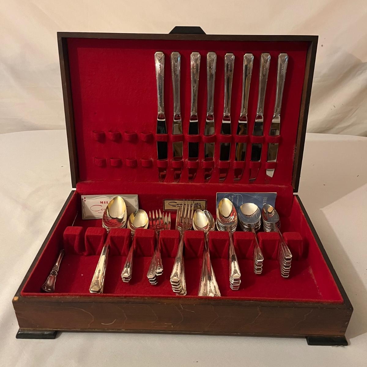 Lot contains eight person setting of Community silverplate knives, dinner forks, iced tea spoons, soup spoons and dinner spoons. Also includes six large spoons, six salad forks, twelve teaspoons and two butter knives with a wooden case also included that measures 11” x 16.5” x 3.5”.