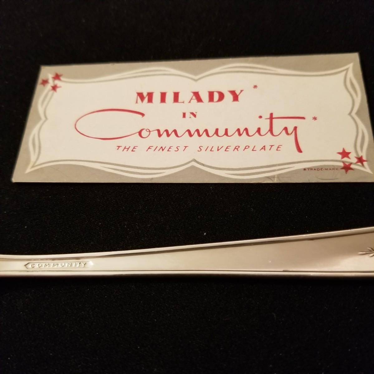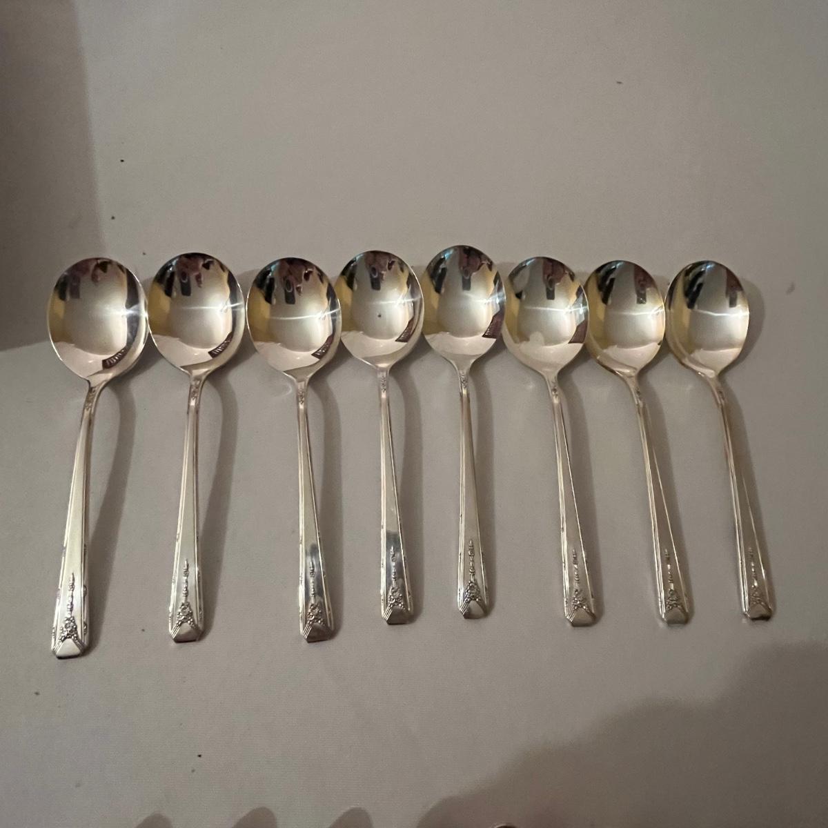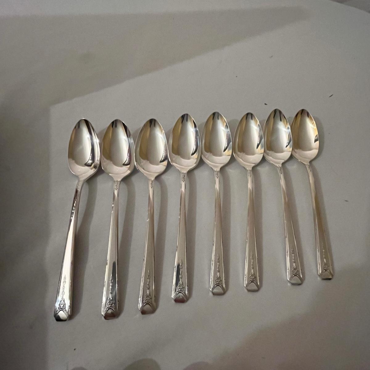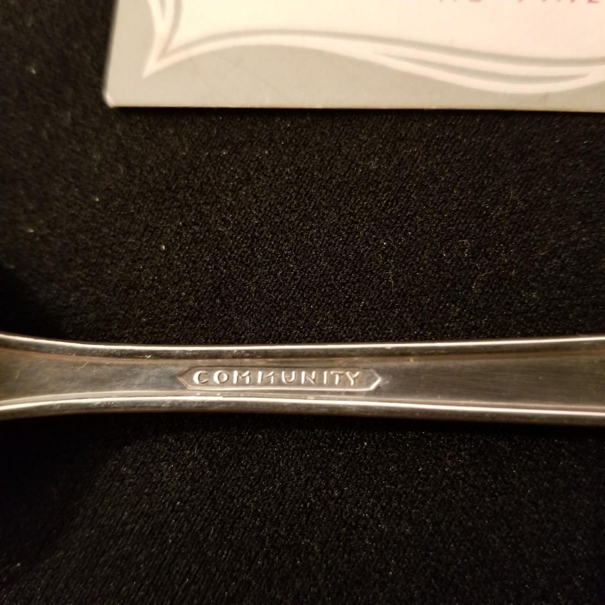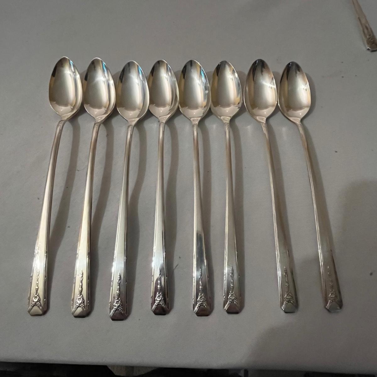 Lot contains eight person setting of Community silverplate knives, dinner forks, iced tea spoons, soup spoons and dinner spoons. Also includes six large spoons, six salad forks, twelve teaspoons and two butter knives with a wooden case also included that measures 11” x 16.5” x 3.5”.