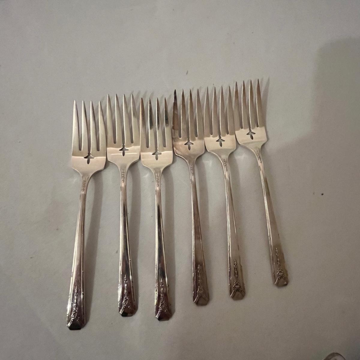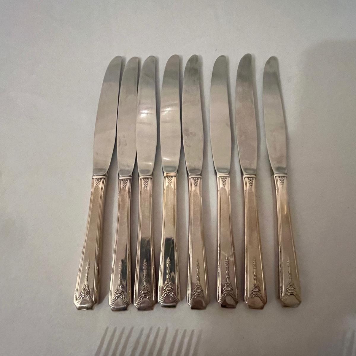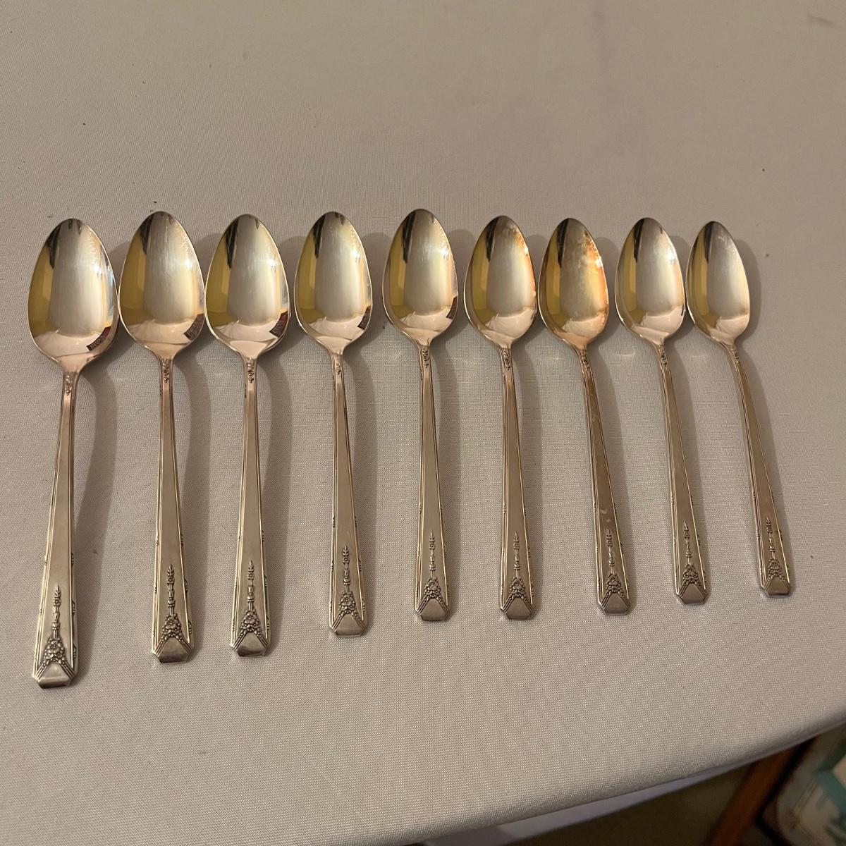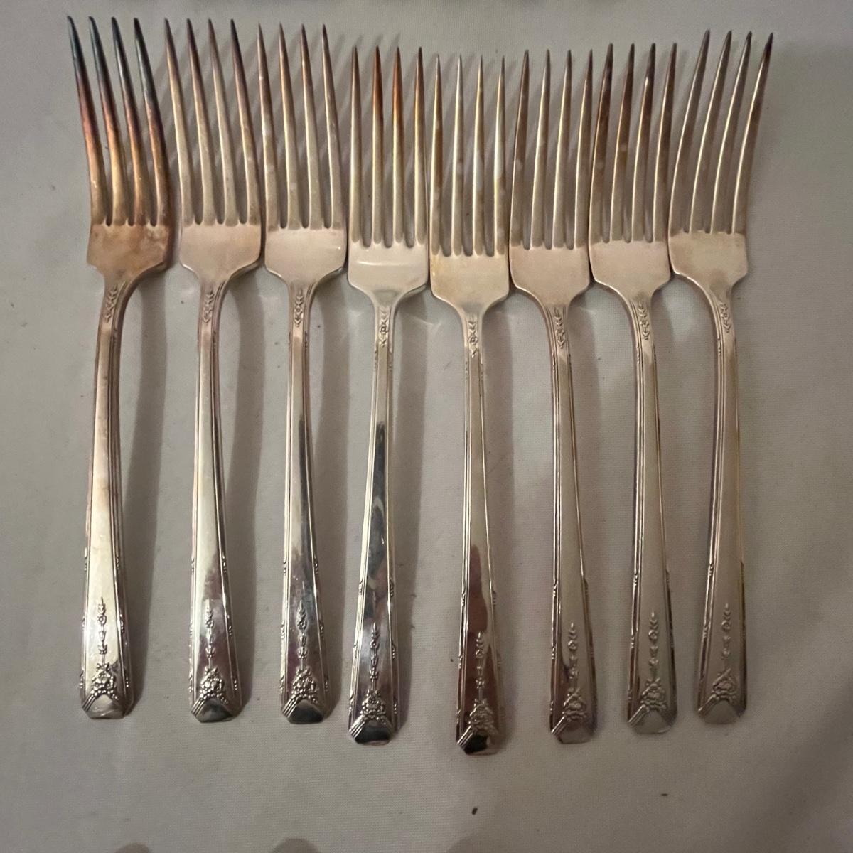 Lot contains eight person setting of Community silverplate knives, dinner forks, iced tea spoons, soup spoons and dinner spoons. Also includes six large spoons, six salad forks, twelve teaspoons and two butter knives with a wooden case also included that measures 11” x 16.5” x 3.5”.