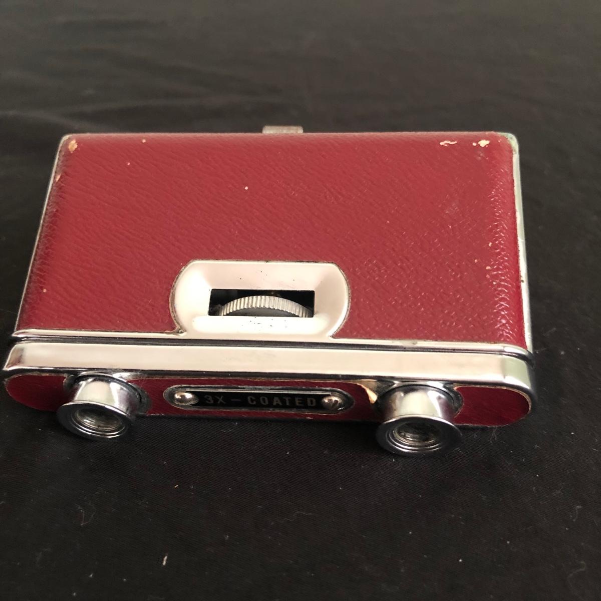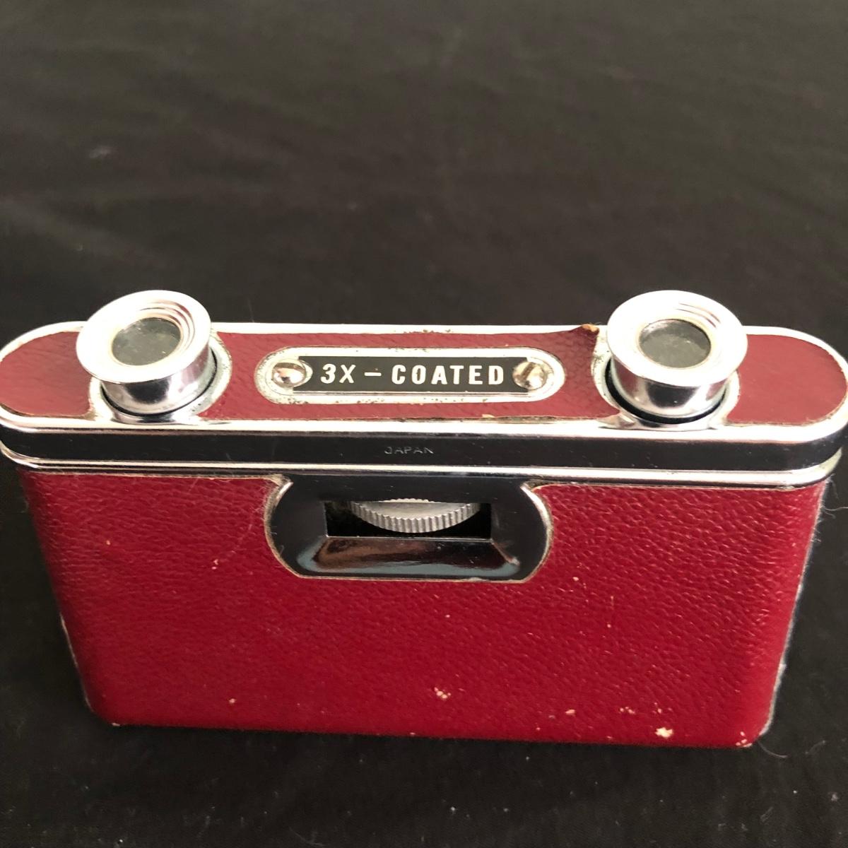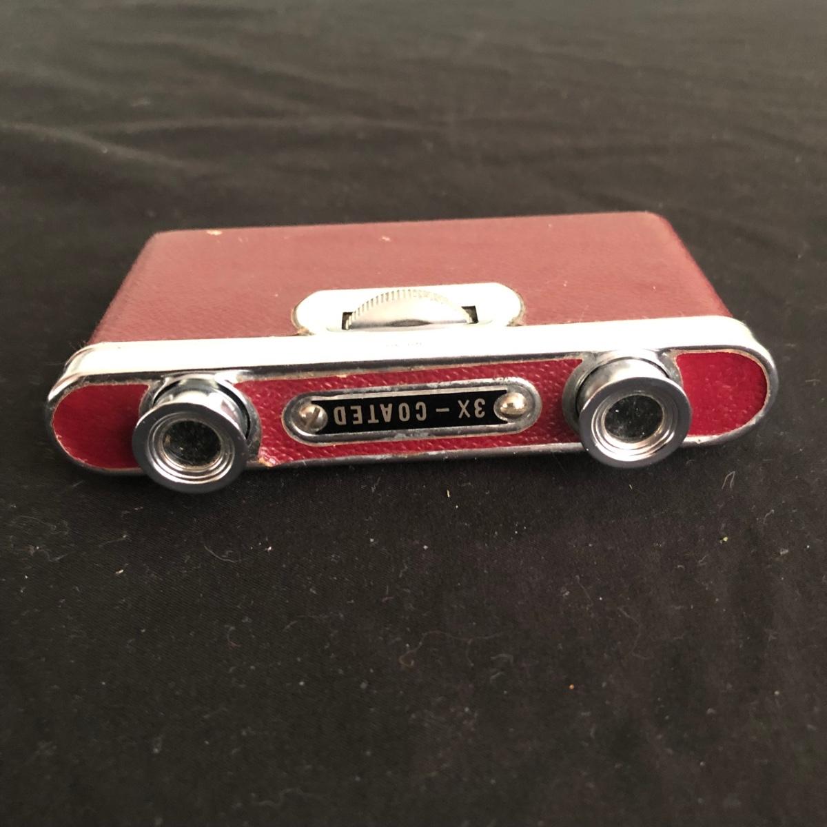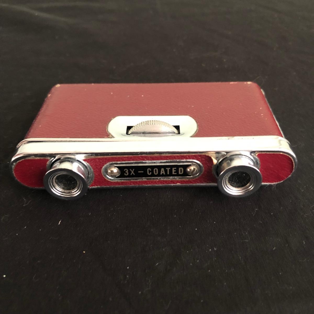 Binoculars fold down and folded measure 4.5” x 2.5” x 1”. The case is red leather over metal. Please note the marks on the red leather. Shipping Available.