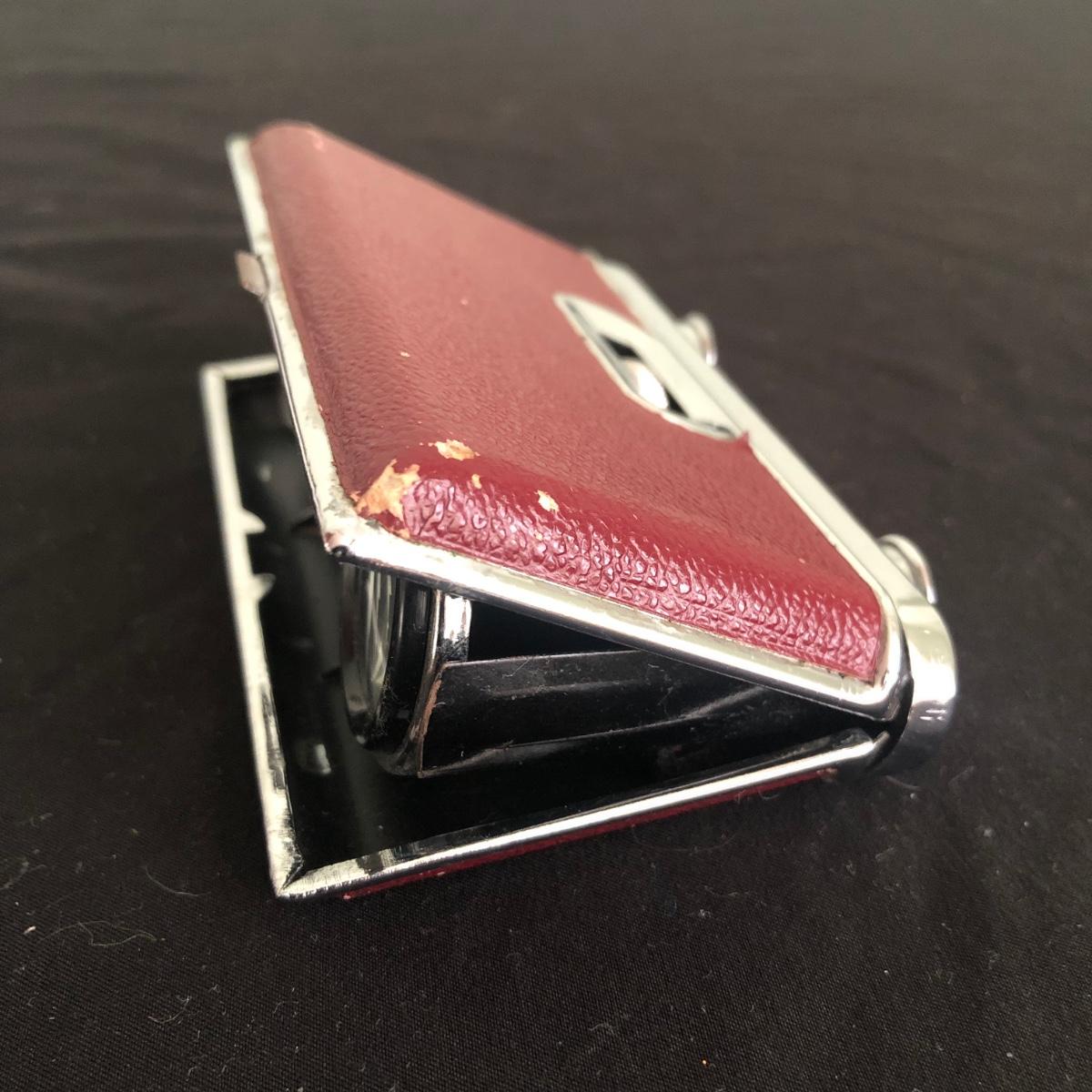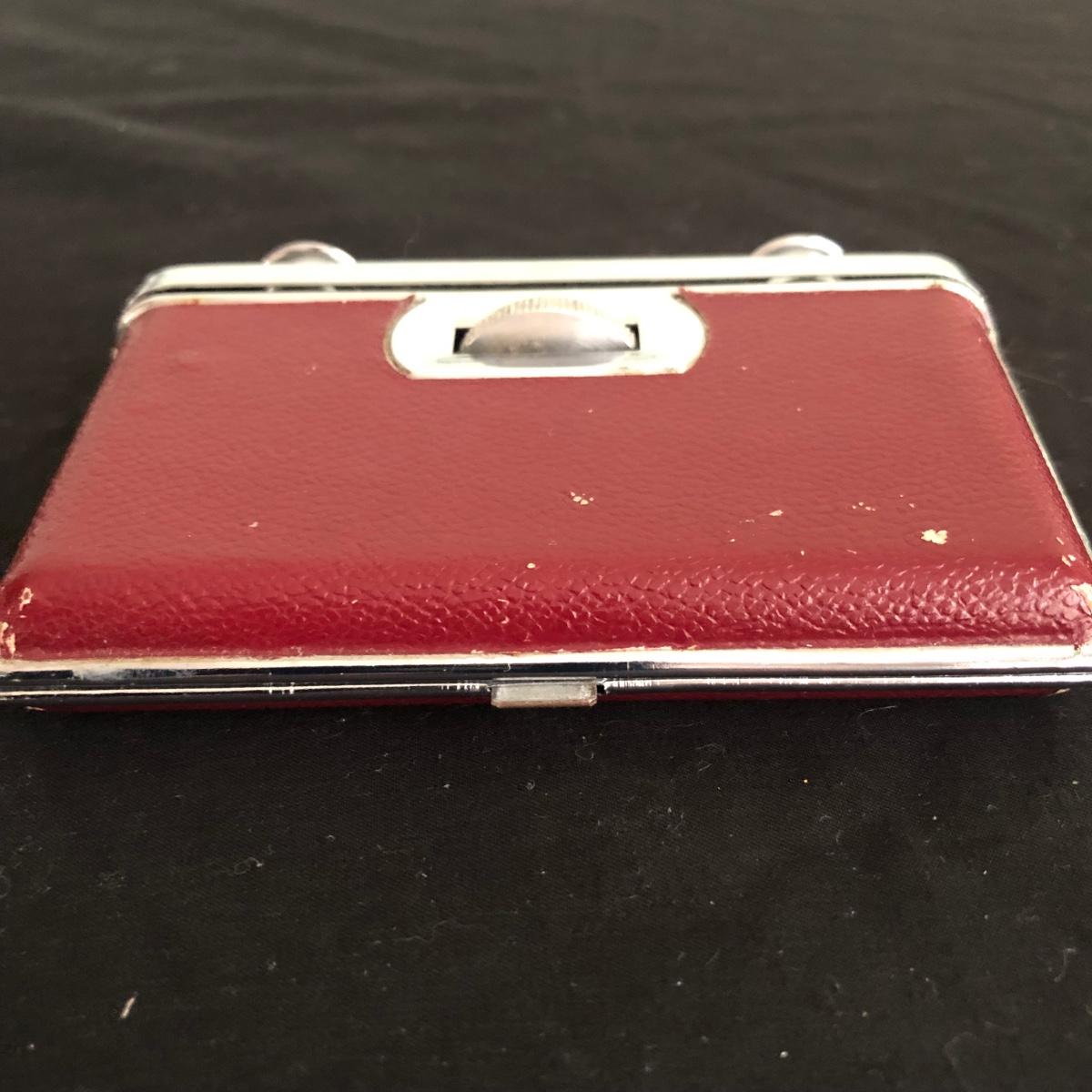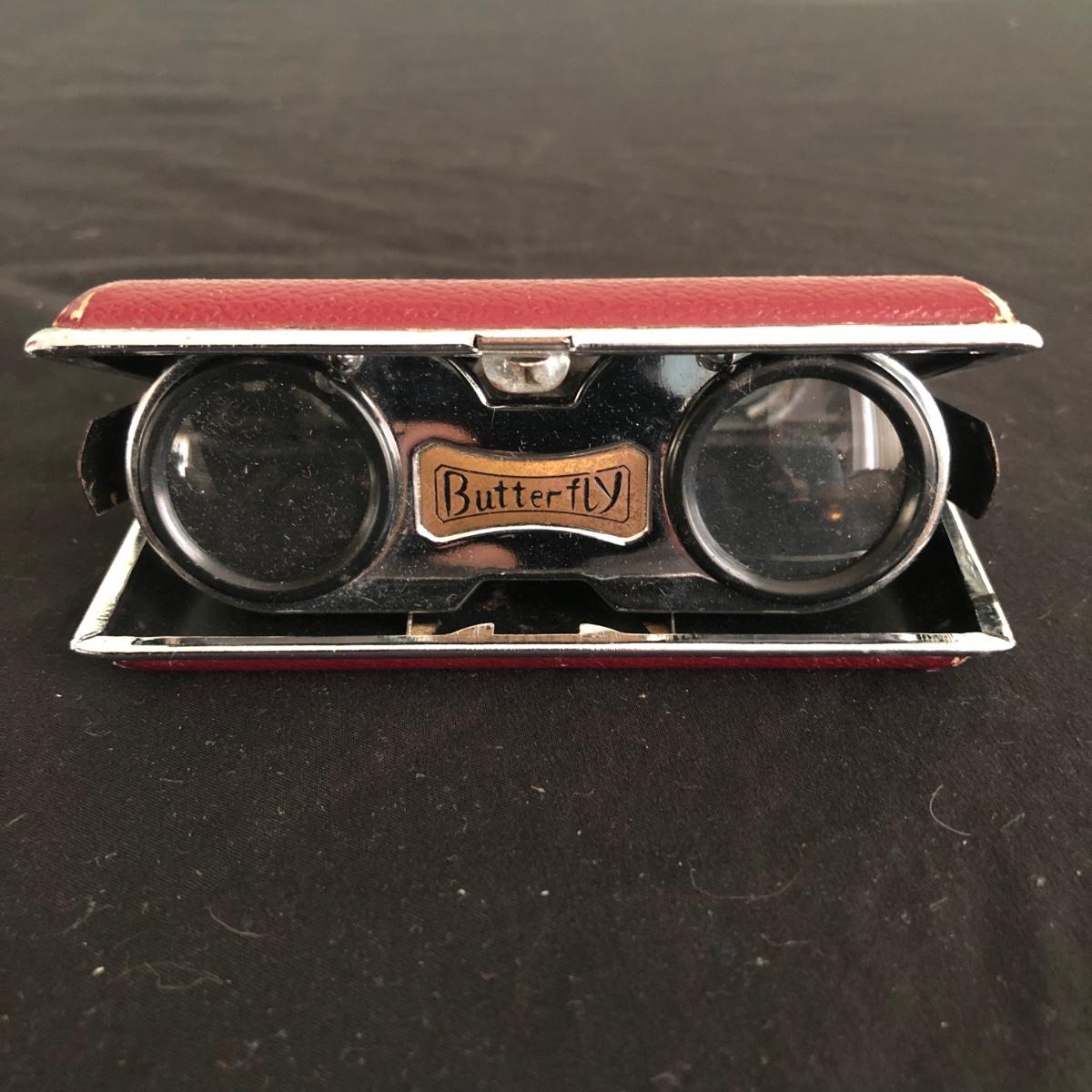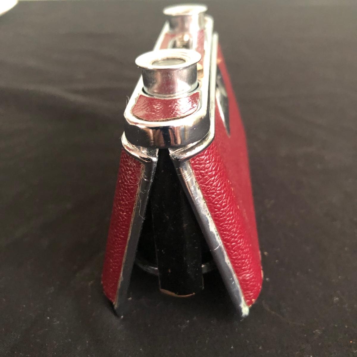 Binoculars fold down and folded measure 4.5” x 2.5” x 1”. The case is red leather over metal. Please note the marks on the red leather. Shipping Available.