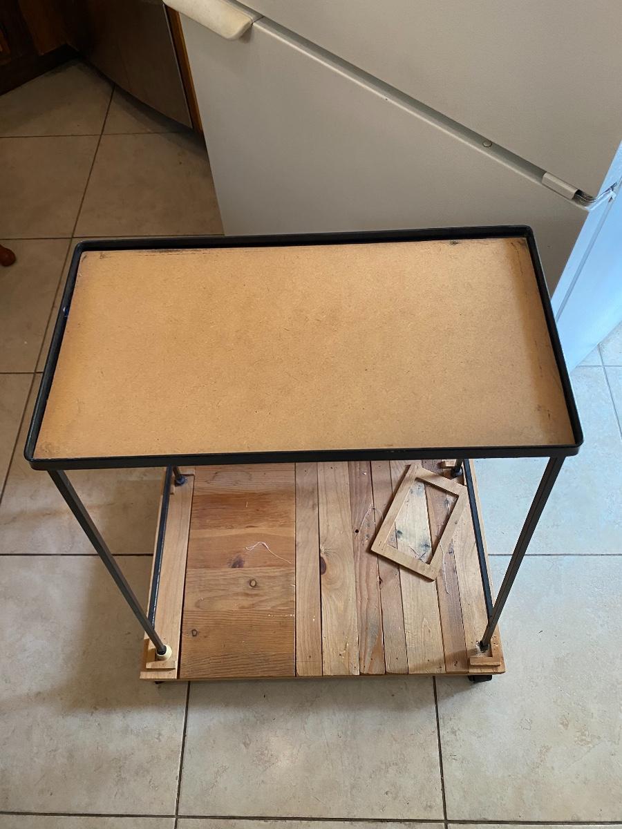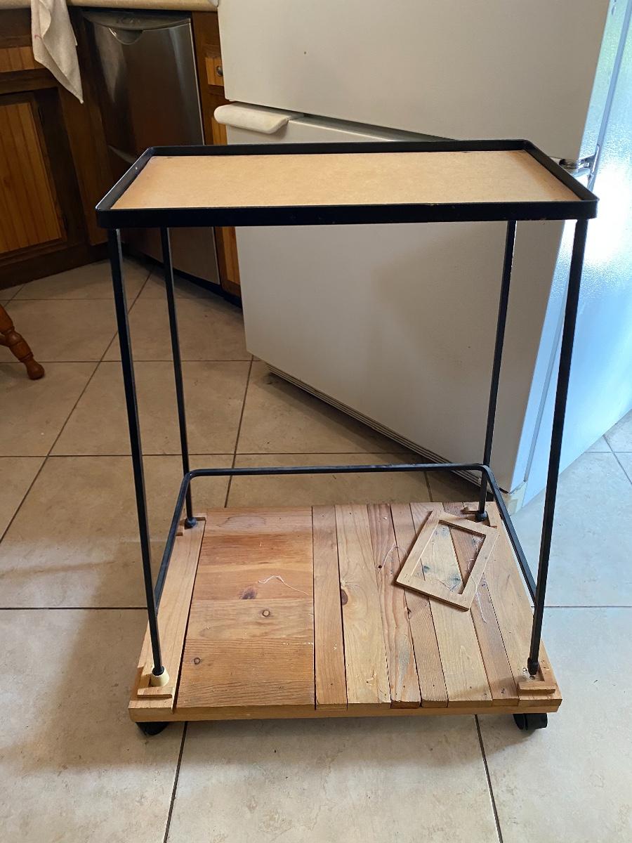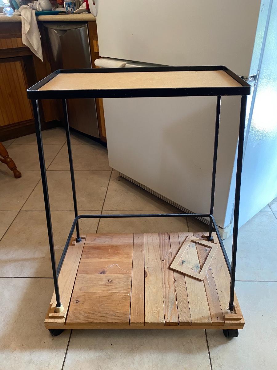 Compact sewing machine stand. Fits standard machine. On a wheeled cart but can be removed. In good condition.