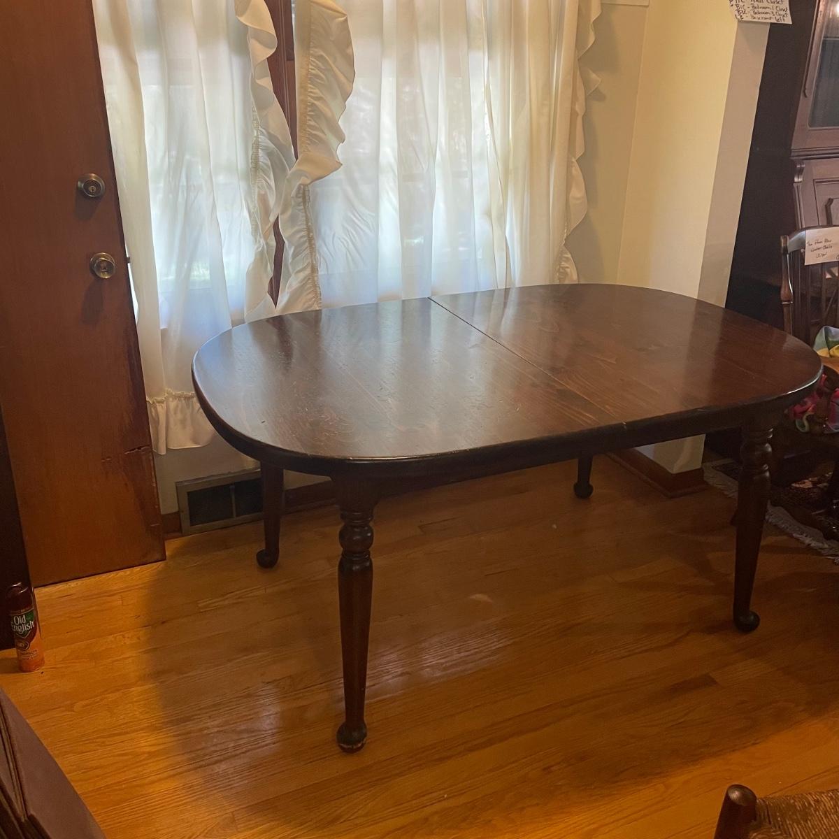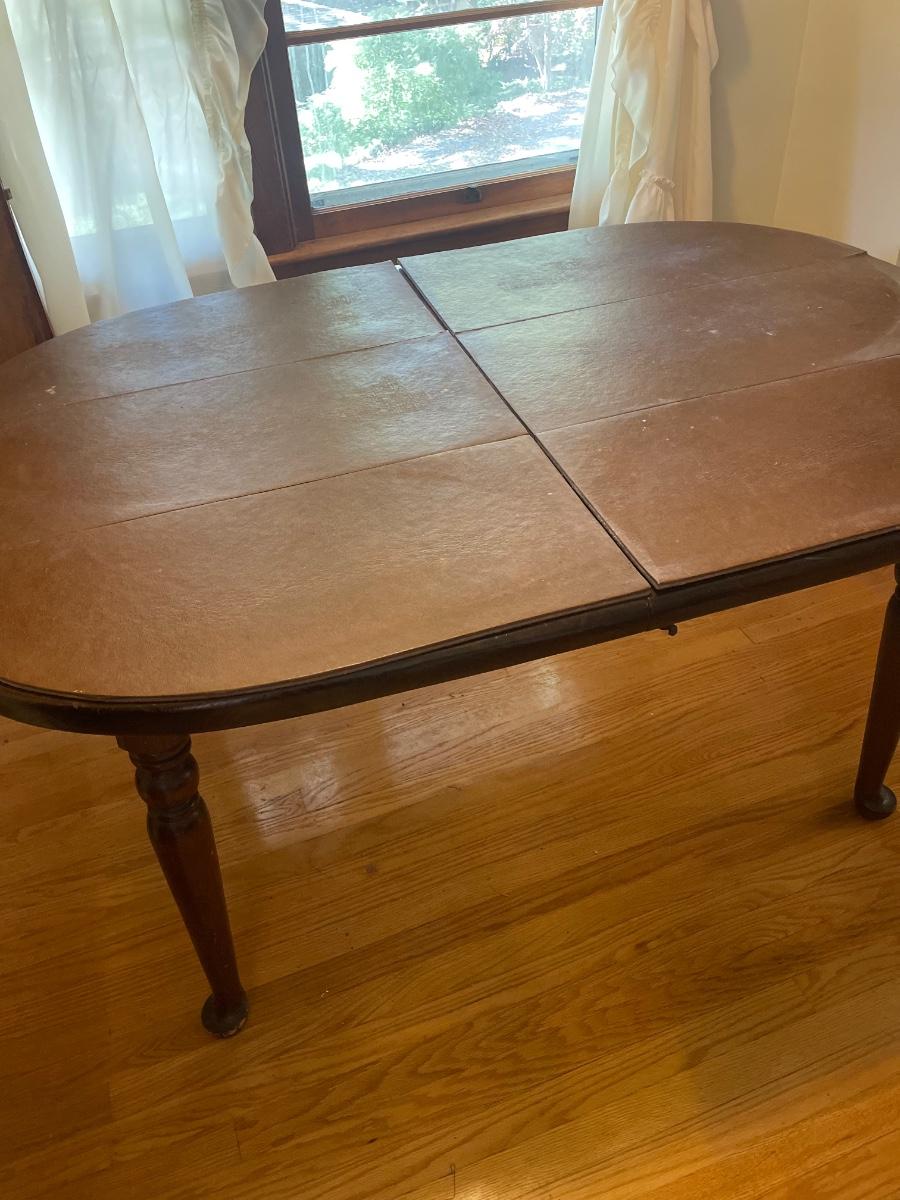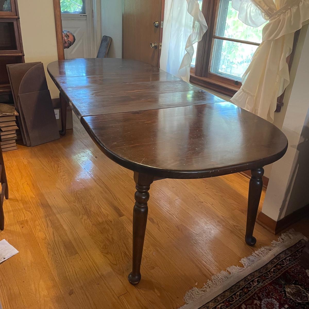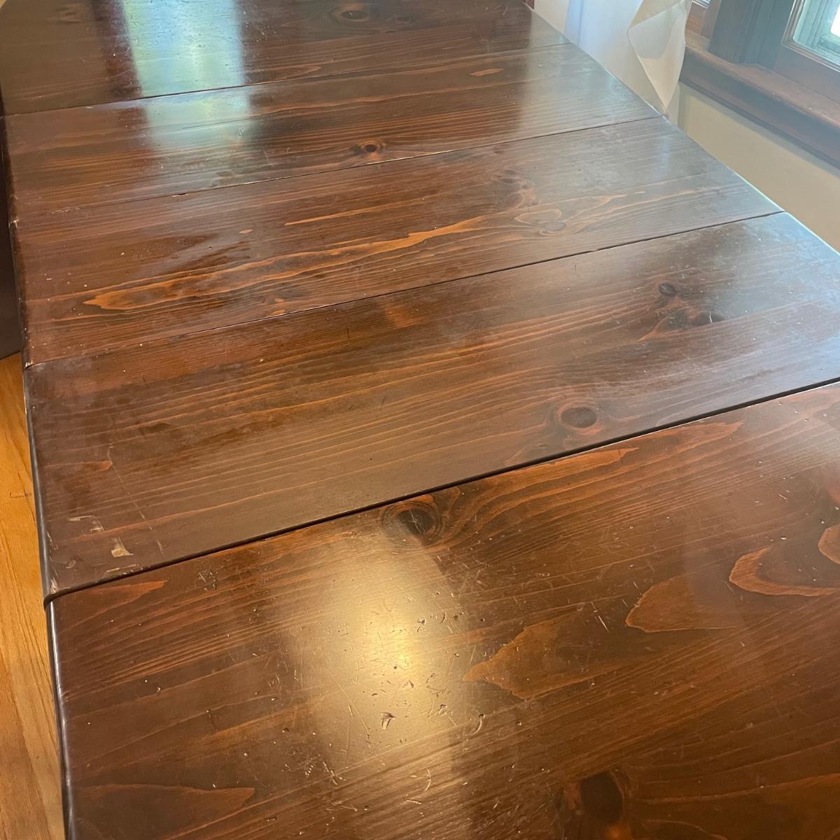A sturdy quality wood dining table that goes from 60” to 96” long with the addition of its three 12” leaves. It’s 40” wide x 29” tall. The table has a dark stain. It is in good condition but does have some scuff marks, see images. The leaves install easily. Table has a protective sectional pad; it’s missing pads for 2 of the 3 leaves.