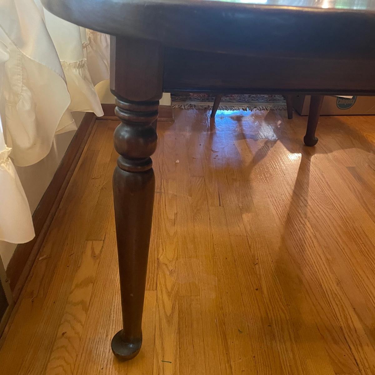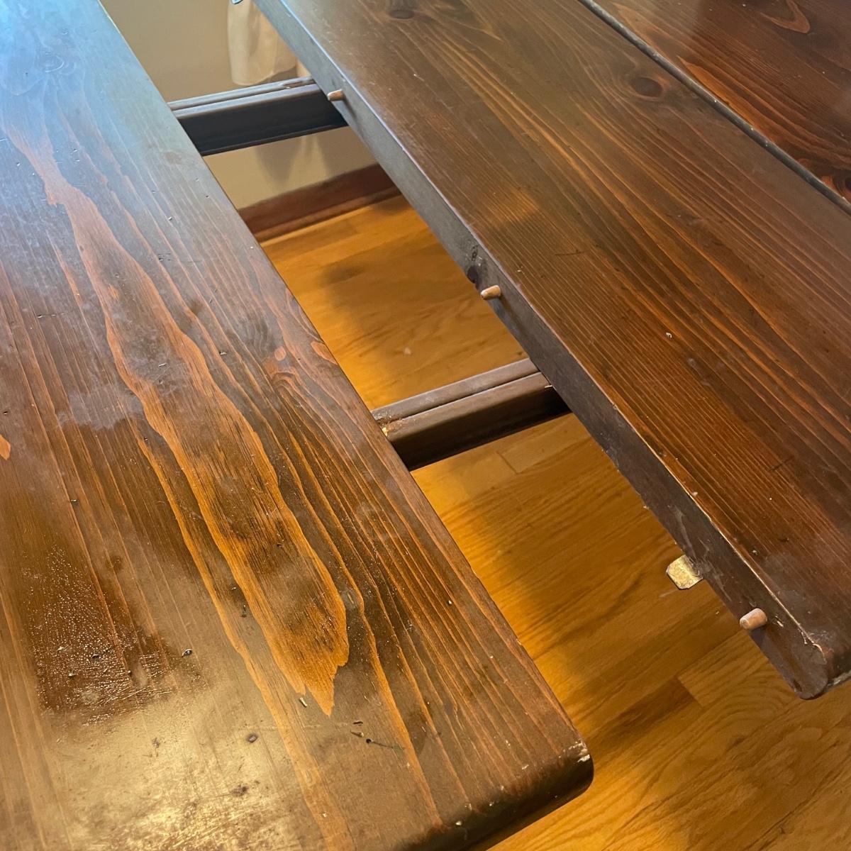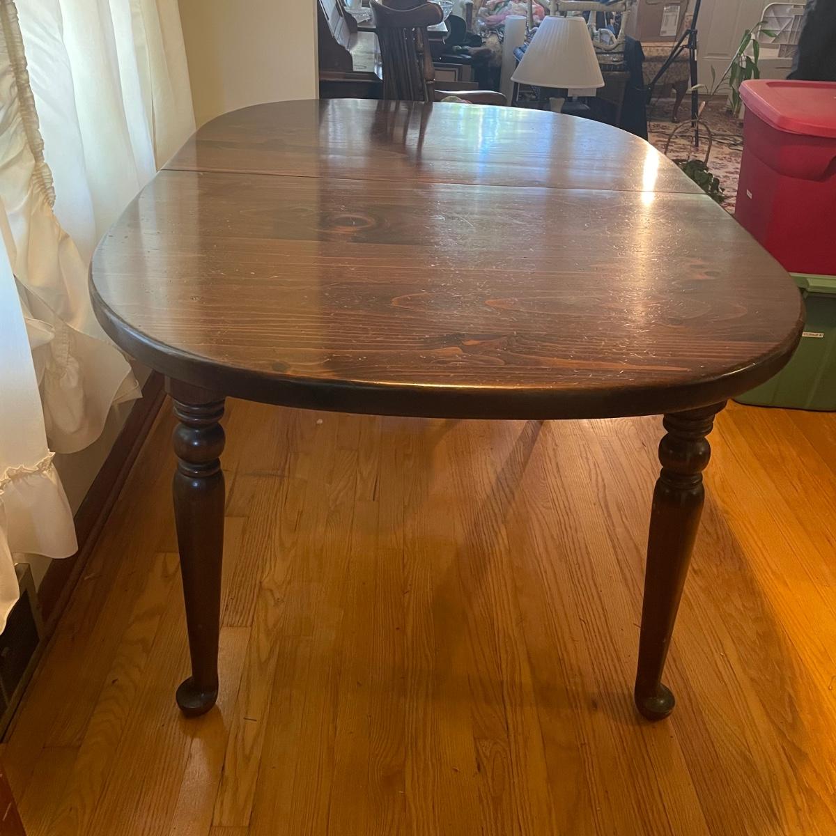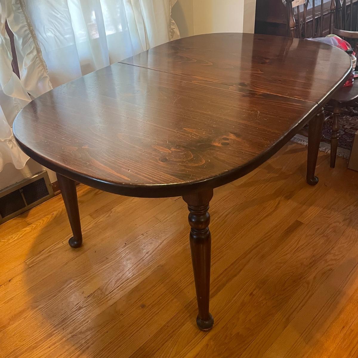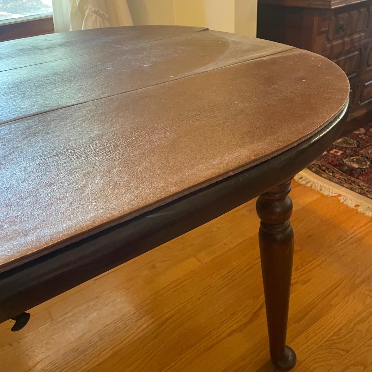 A sturdy quality wood dining table that goes from 60” to 96” long with the addition of its three 12” leaves. It’s 40” wide x 29” tall. The table has a dark stain. It is in good condition but does have some scuff marks, see images. The leaves install easily. Table has a protective sectional pad; it’s missing pads for 2 of the 3 leaves.