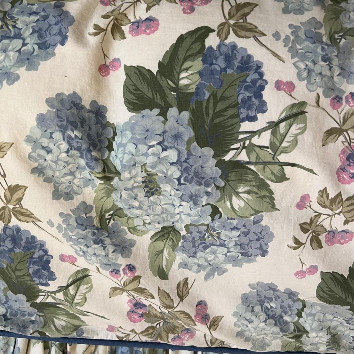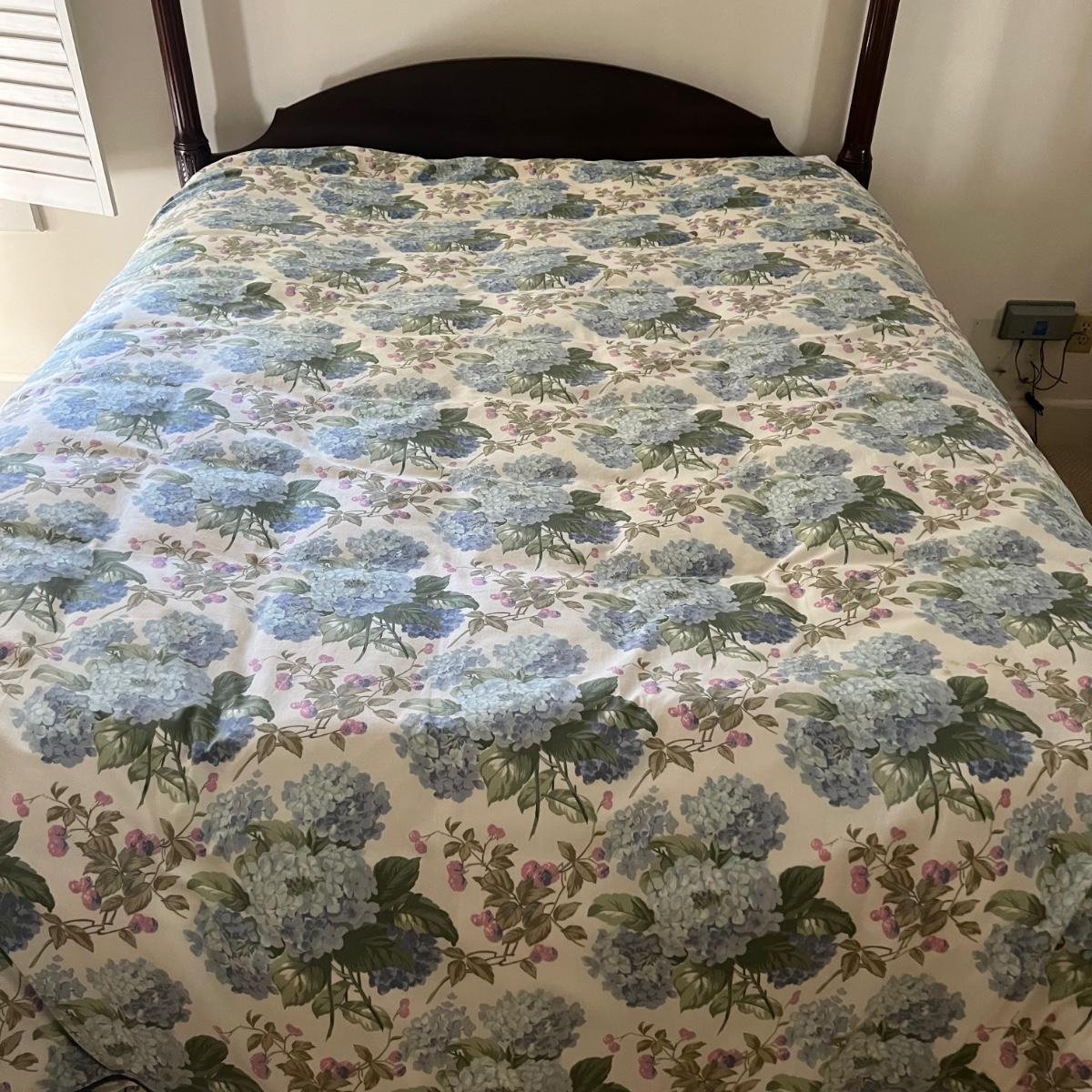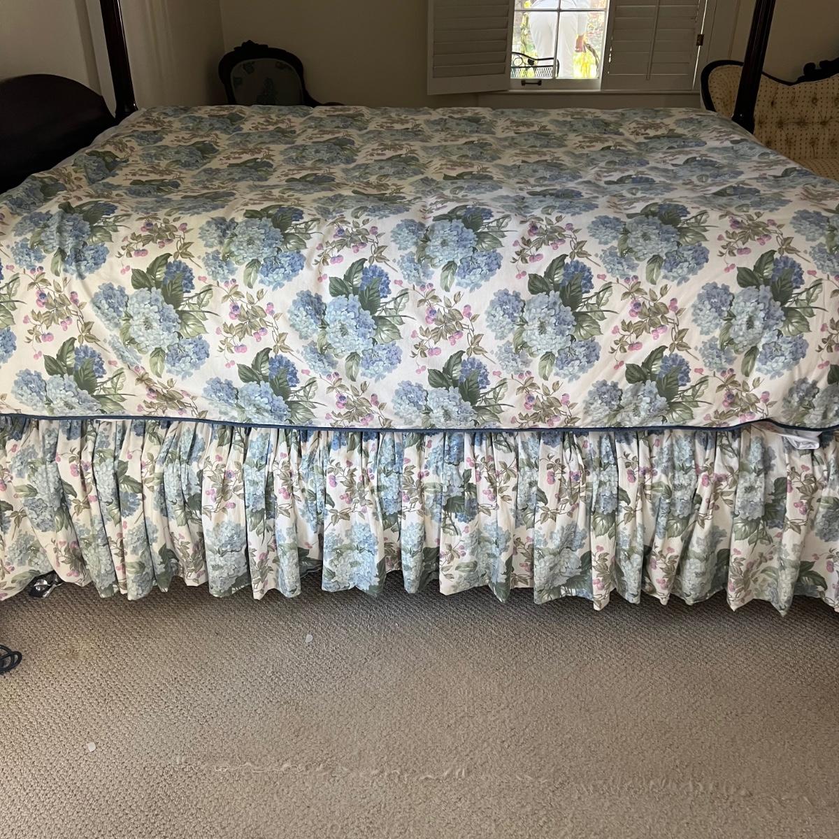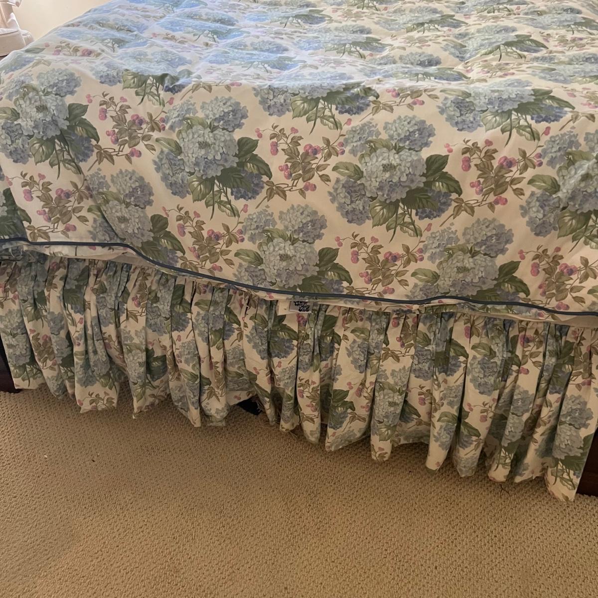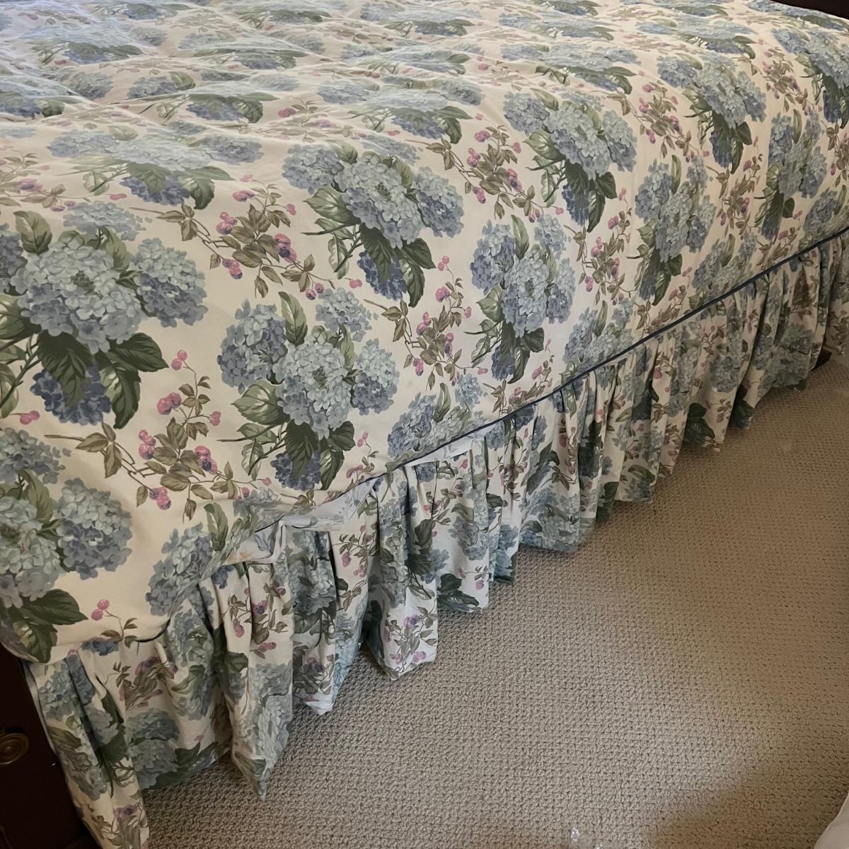 Company Store queen down comforter and duvet cover with matching bed skirt. The light purple hydrangea, floral pattern is complemented by a blue welted border. The queen cotton floral flat and fitted sheets are also included.