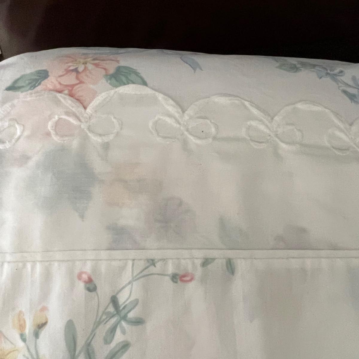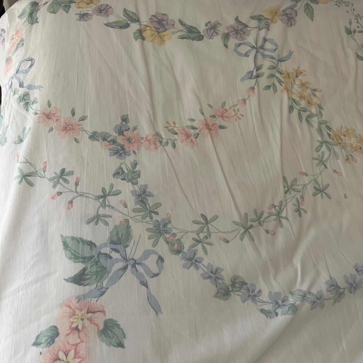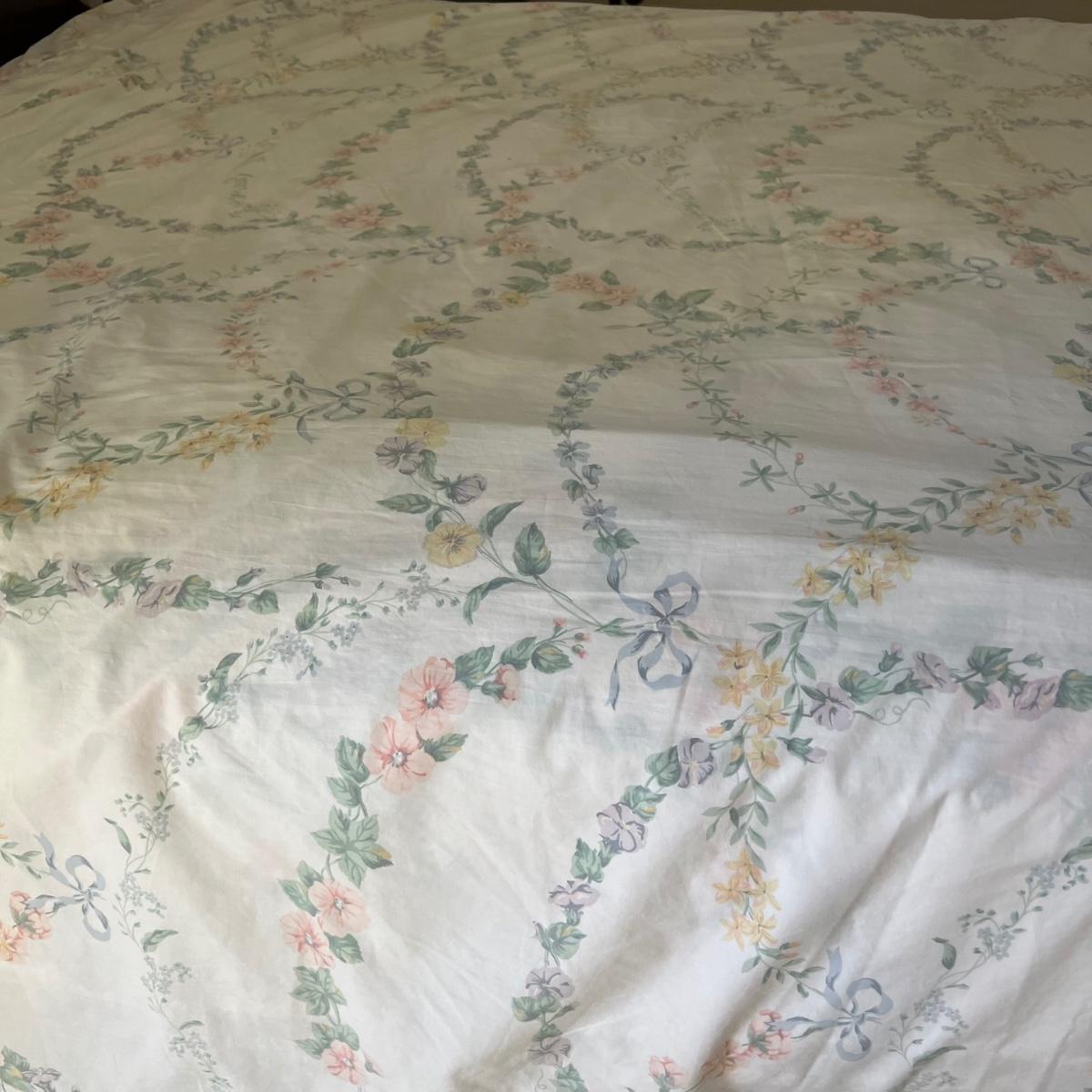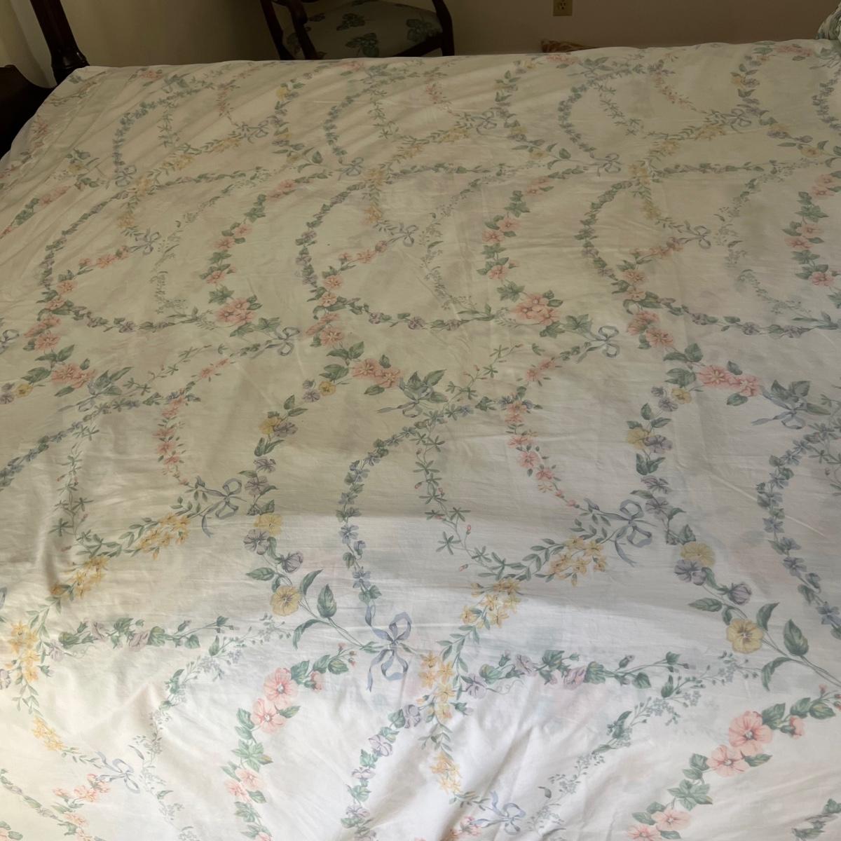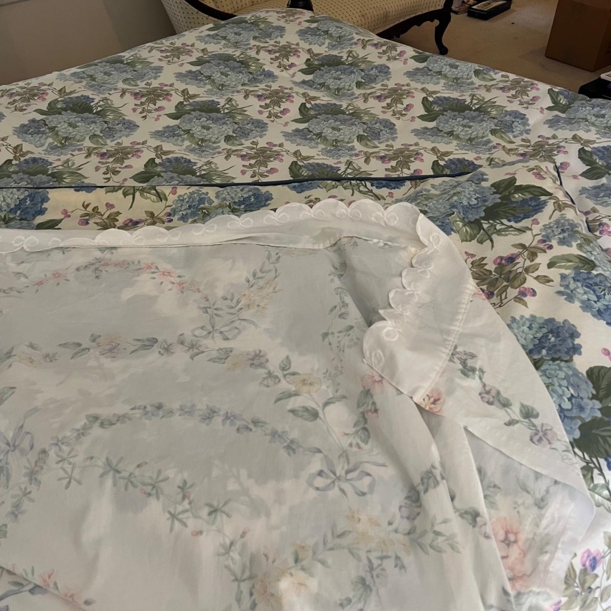 Company Store queen down comforter and duvet cover with matching bed skirt. The light purple hydrangea, floral pattern is complemented by a blue welted border. The queen cotton floral flat and fitted sheets are also included.