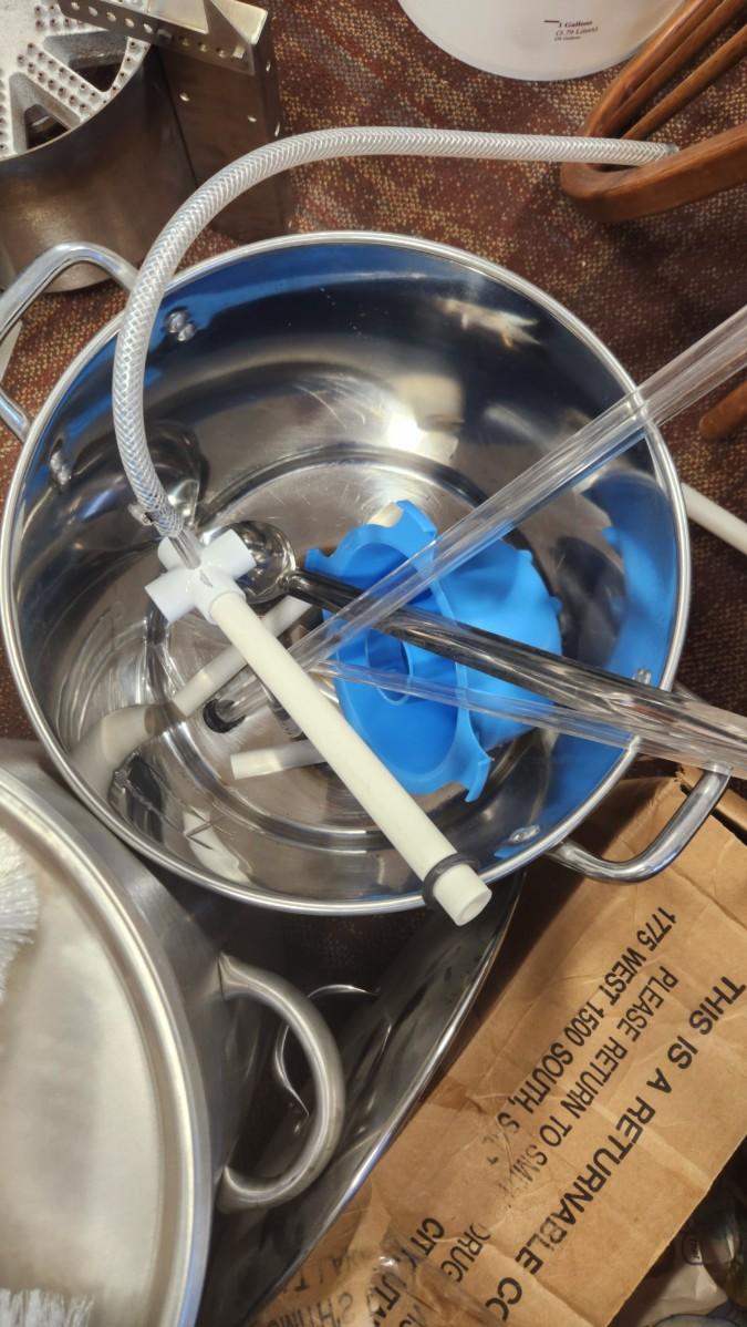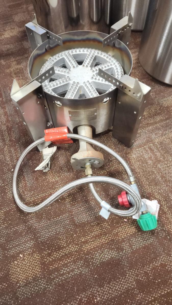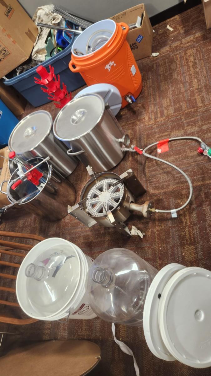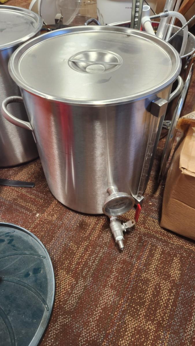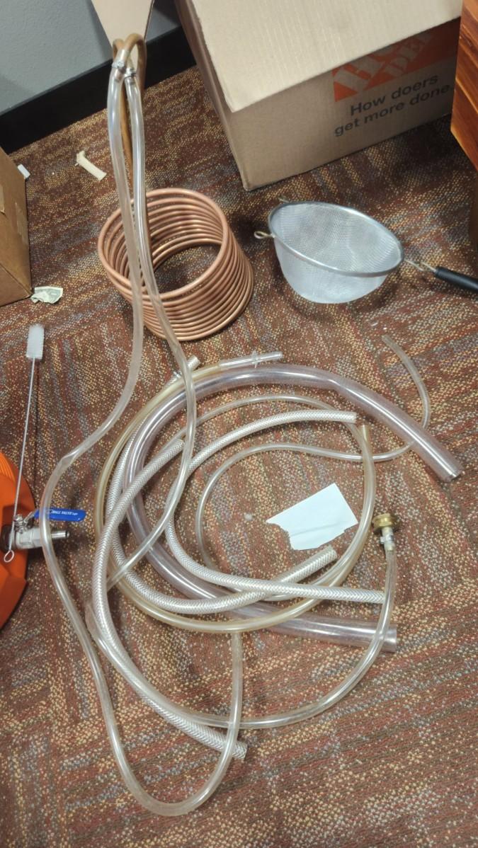 Burner and pots are made by Blichmann. Portable refractometer, cleaning brushes, thermometers, tubes, and copper pipe all included.