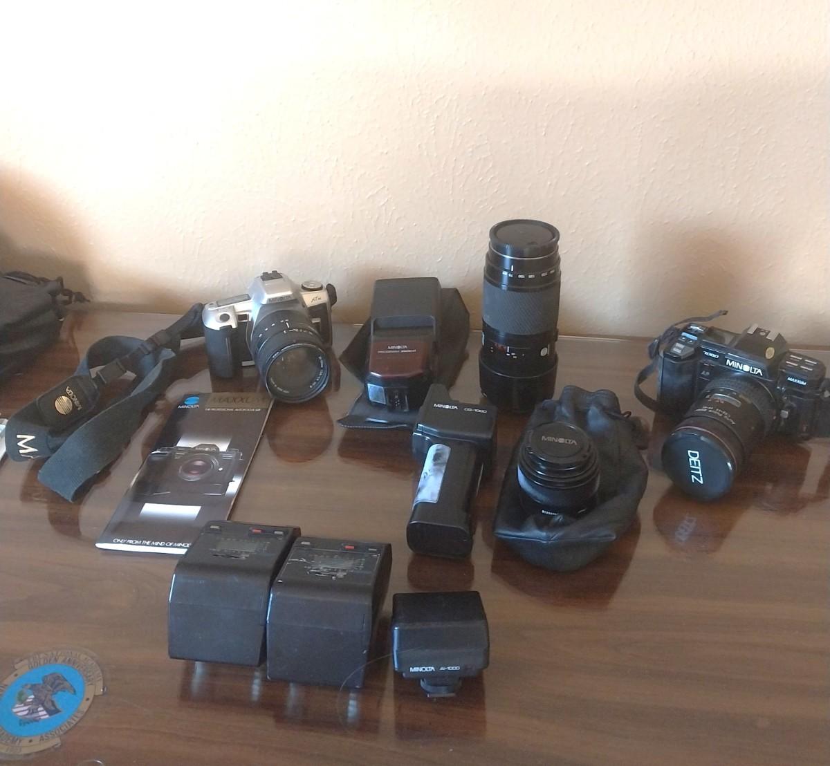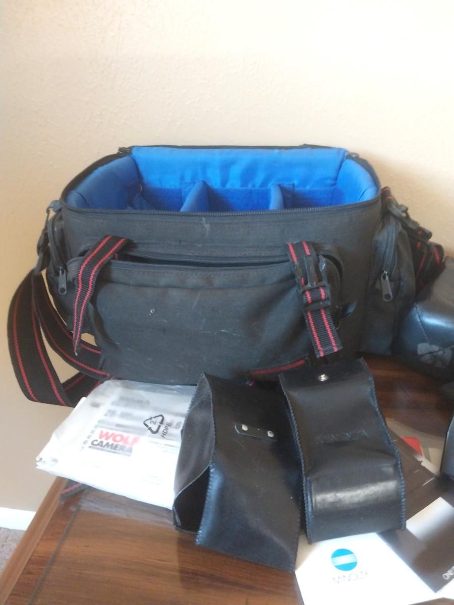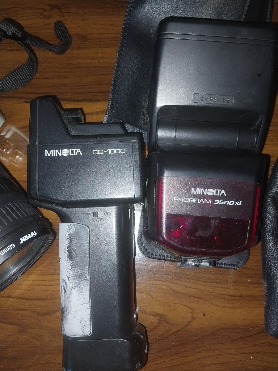 COMPLETE MINOLTA MAXXUM CAMERA SETUP WITH LENS, FLASHES AND CARRY BAG