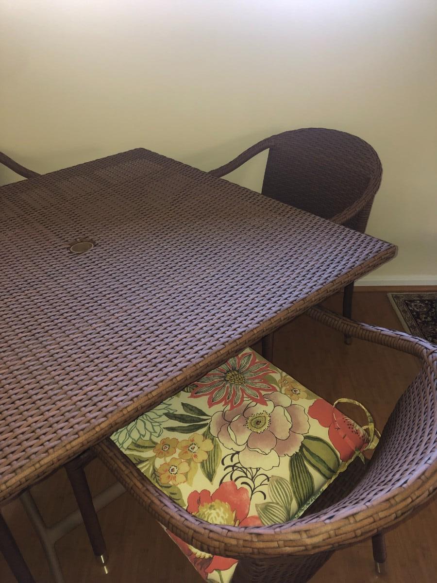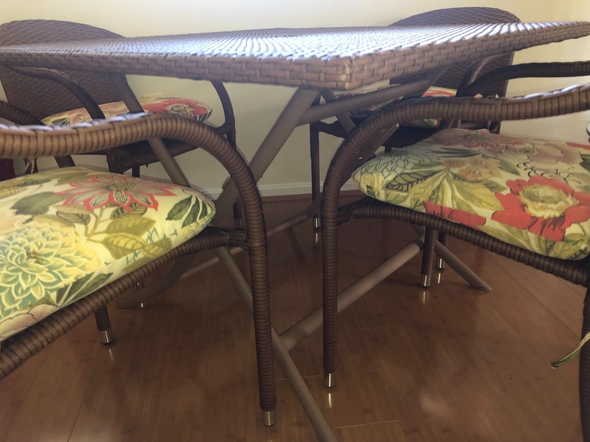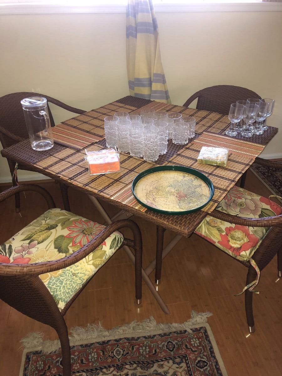 Excellent condition, wicker and metal patio table, 4 chairs with cushions, umbrella. Also includes cutdoor dishes and drinkware, placements, and covers for the table and stacked chairs.