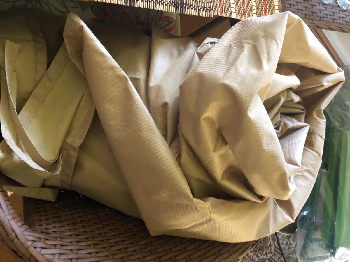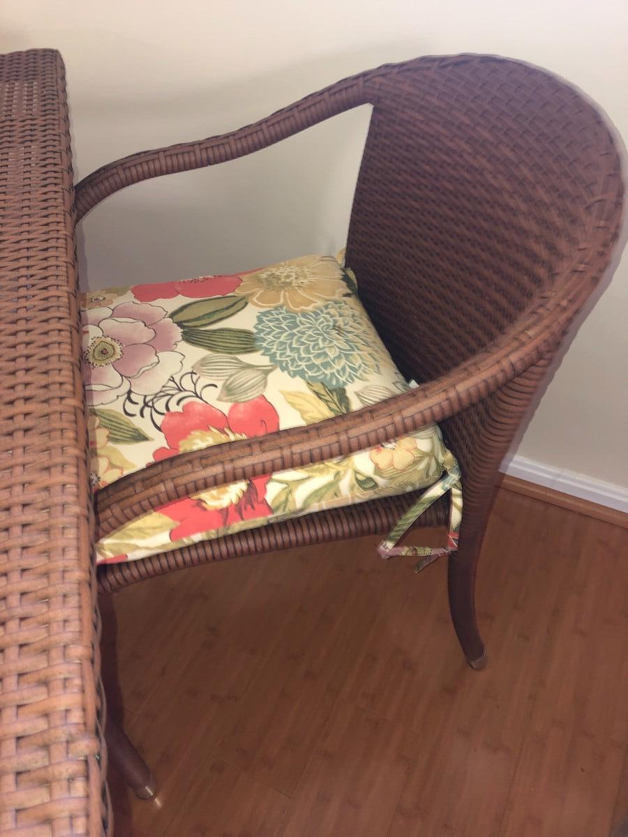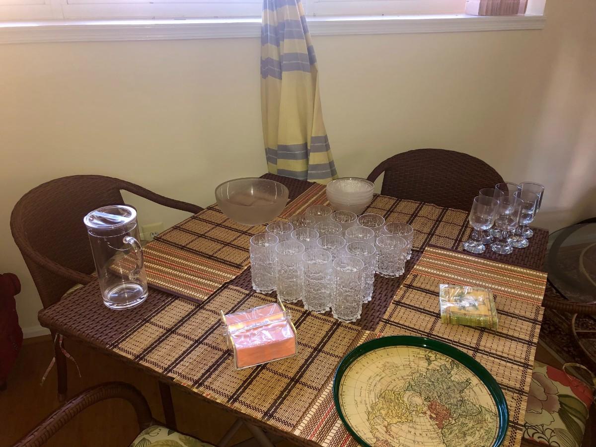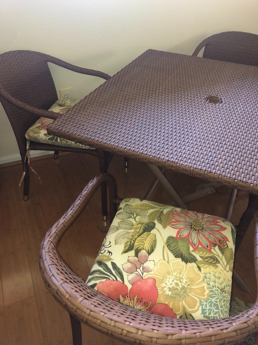 Excellent condition, wicker and metal patio table, 4 chairs with cushions, umbrella. Also includes cutdoor dishes and drinkware, placements, and covers for the table and stacked chairs.
